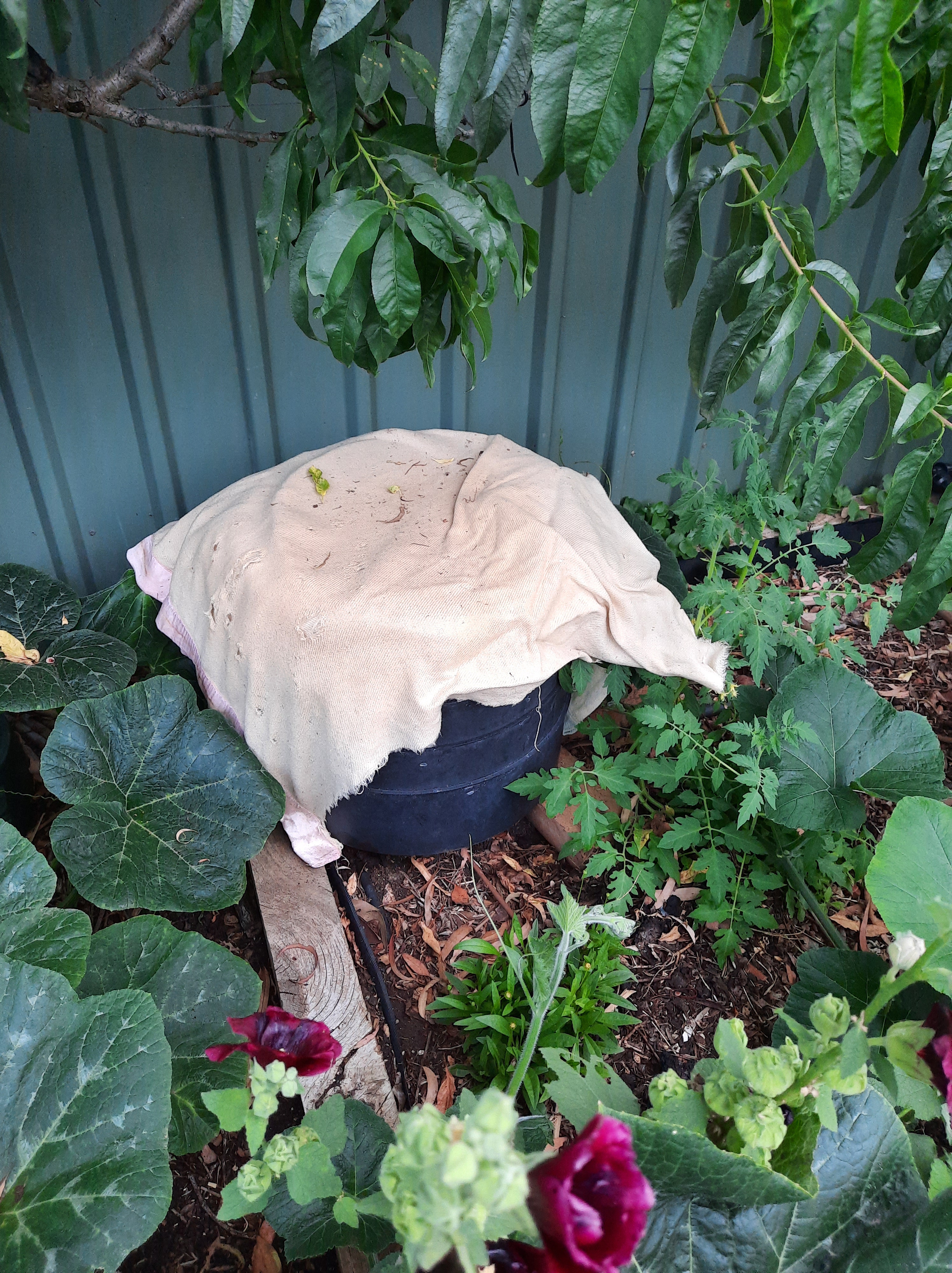 I noticed that folks on our Buy Nothing group were requesting worms, because theirs had died over summer. It seemed sensible to offer strategies for keeping worms alive over our hot summers. Now, to be honest with you, my worm farms are tastefully (*cough*) draped with a couple of old towels, or a cut off piece of “dog blanket” (see below). “Dog blanket” is an entire category in some Australian op shops/thrift stores, covering stained blankets and those that have met with careless washing or other mishaps rendering them unfit for polite human company in the estimation of the op shop volunteers. I cover my worm farms to insulate them and because they are made from black plastic, which is a bad choice for our summers.