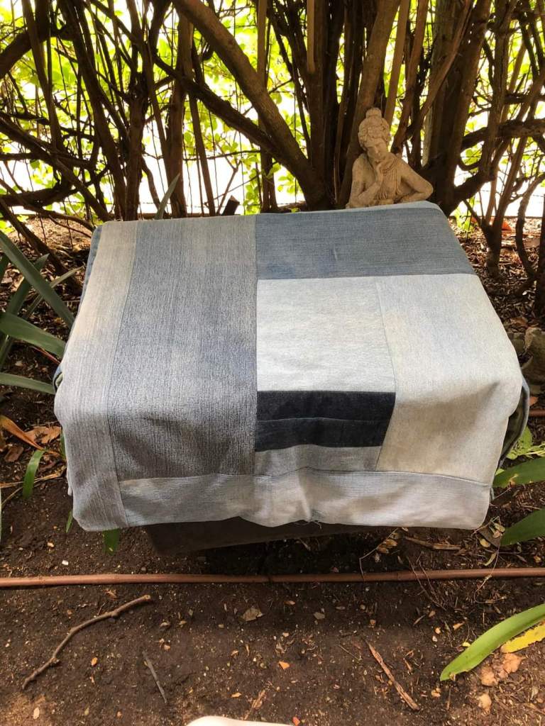 And here are old singlets doing the same job! I constructed the outside covers of these little numbers from old curtains, gardening jeans and other workwear… worn out clothing… even an old cotton tarpaulin that would no longer keep the weather out. I pieced together the useable parts of all these elements to construct enough fabric for the job.