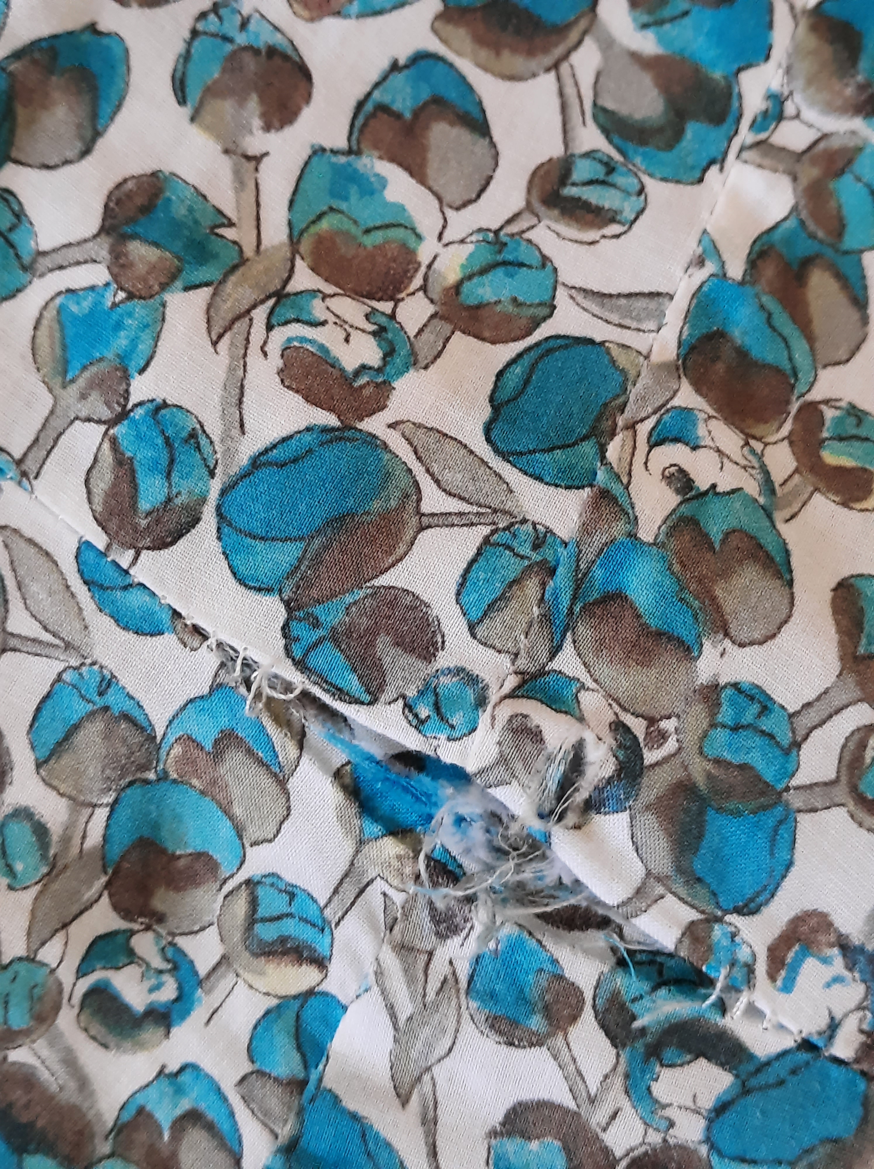 My mother-out-law runs to a very fine fabric. And these days, when one of her fine fabrics needs a few stitches, I provide them. Here, a seam pulling apart.