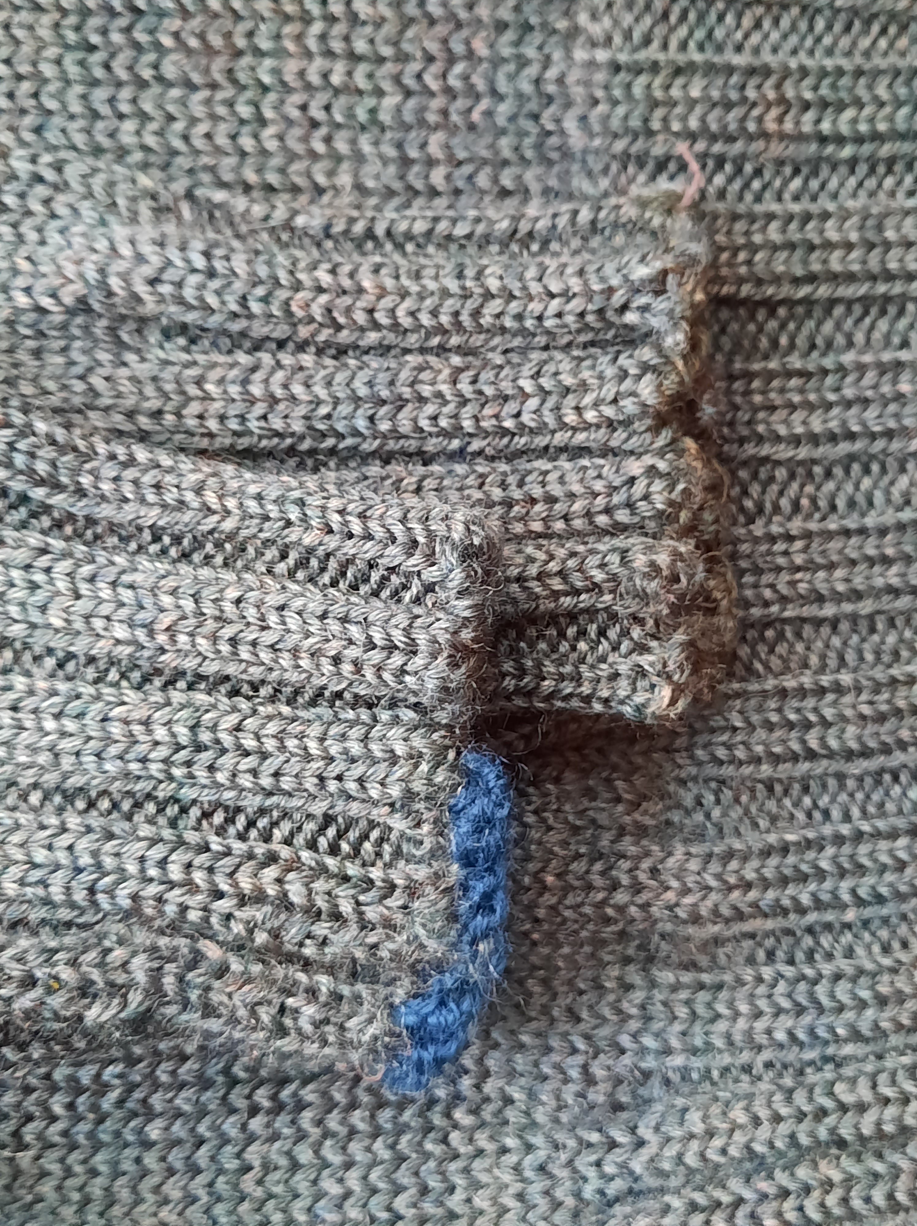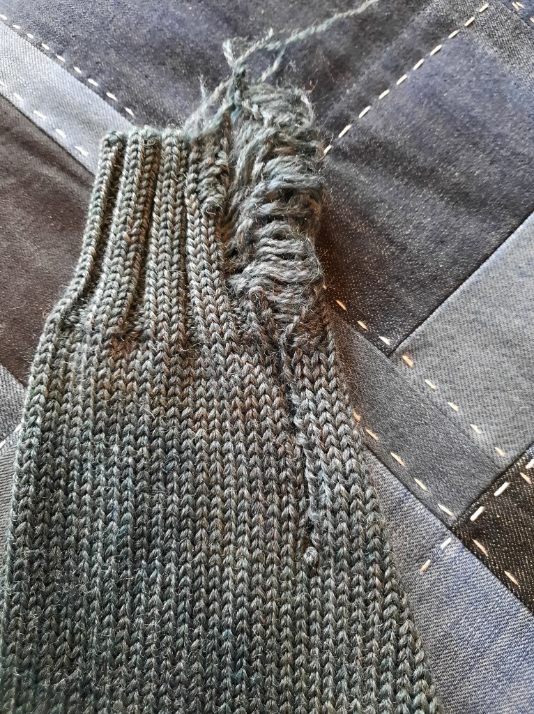 I love being able to make that much improvement, without even applying a needle or using any new yarn! I had no really matching yarn, and used what little I had, to address more minor damage reasonably invisibly. Here, I chose a visible re-knit to supply the fabric that is no longer there.