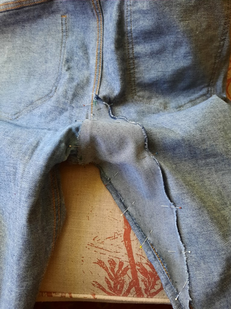 Yes, both cuffs have been mended, just differently. Next, my daughter’s stretch jeans needed some help. The classic rear end mend really…