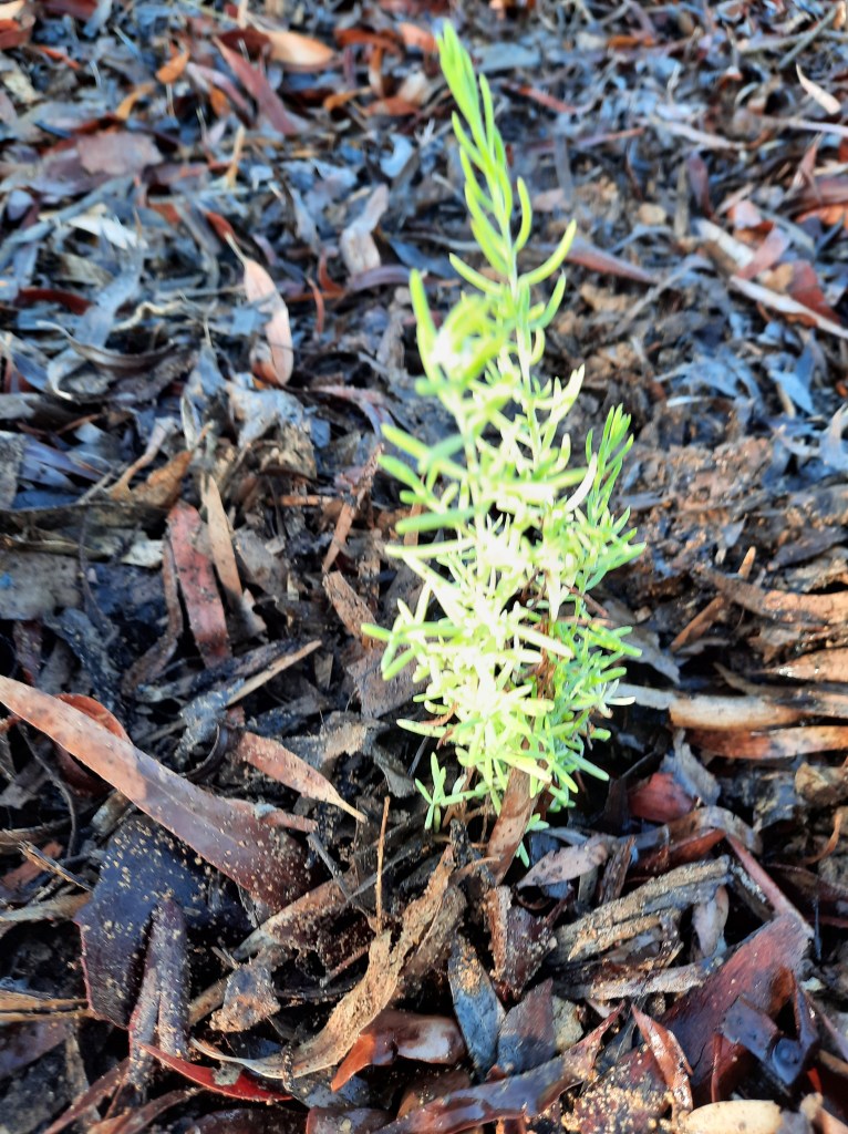 The few ruby saltbush that made it are substantial now, most of a year on. The eucalypts that made it (some have mutated in response to poison) are now not-quite up to my knee. The kangaroo apples that lived are growing well and flowering.
