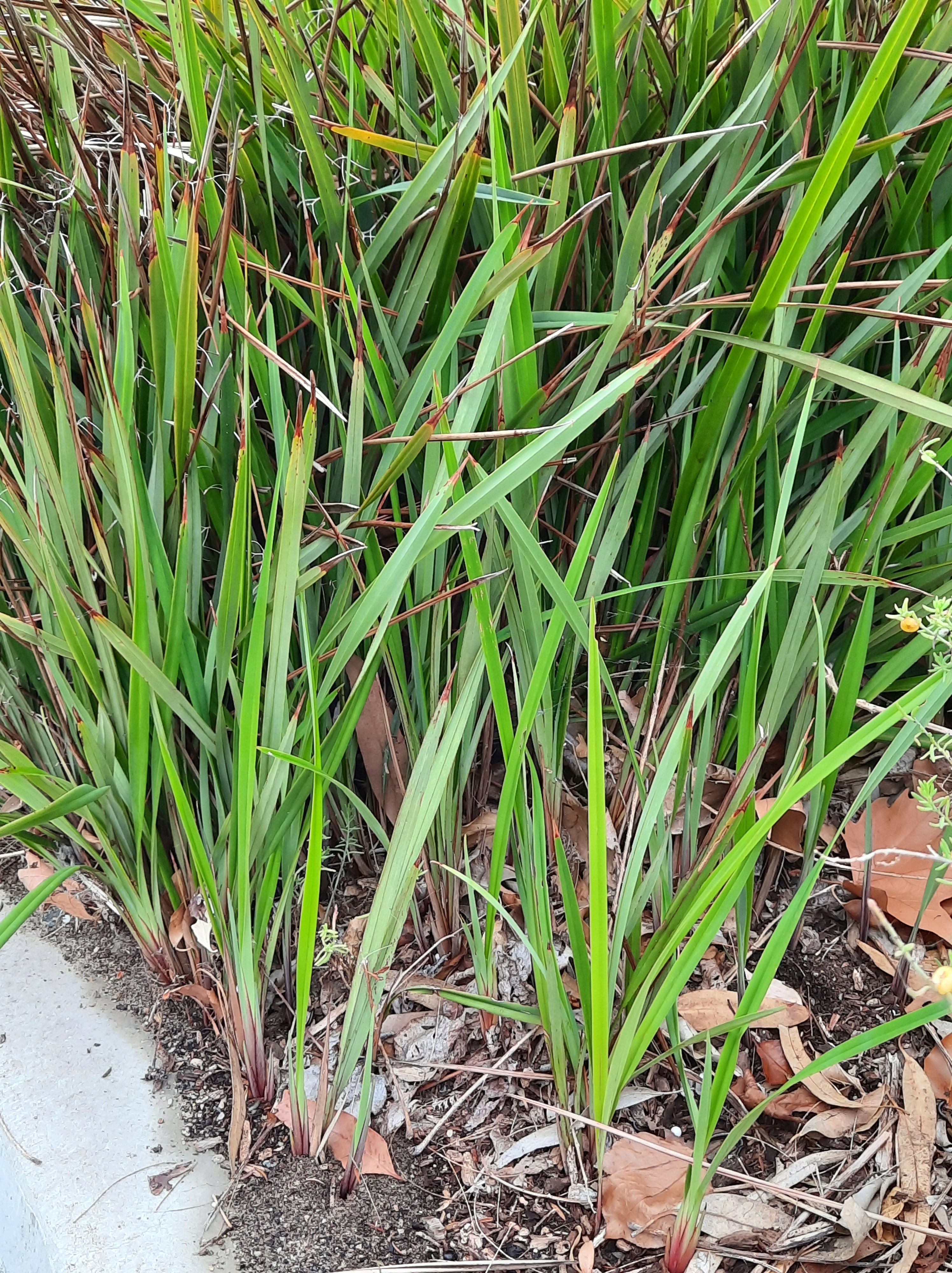 If you want to try root division, look for very dense clumps of dianella–like these. About 15 were stolen from this council street planting in their first week. I have gradually replaced them and filled the gaps in the planting by digging some (not a huge amount!) out each autumn, putting them straight into a bucket of water, separating out viable plants (each with some roots attached), and then straight into small pots of soil and a nice drink of water. I have found that of you let them dry out, they will not grow.