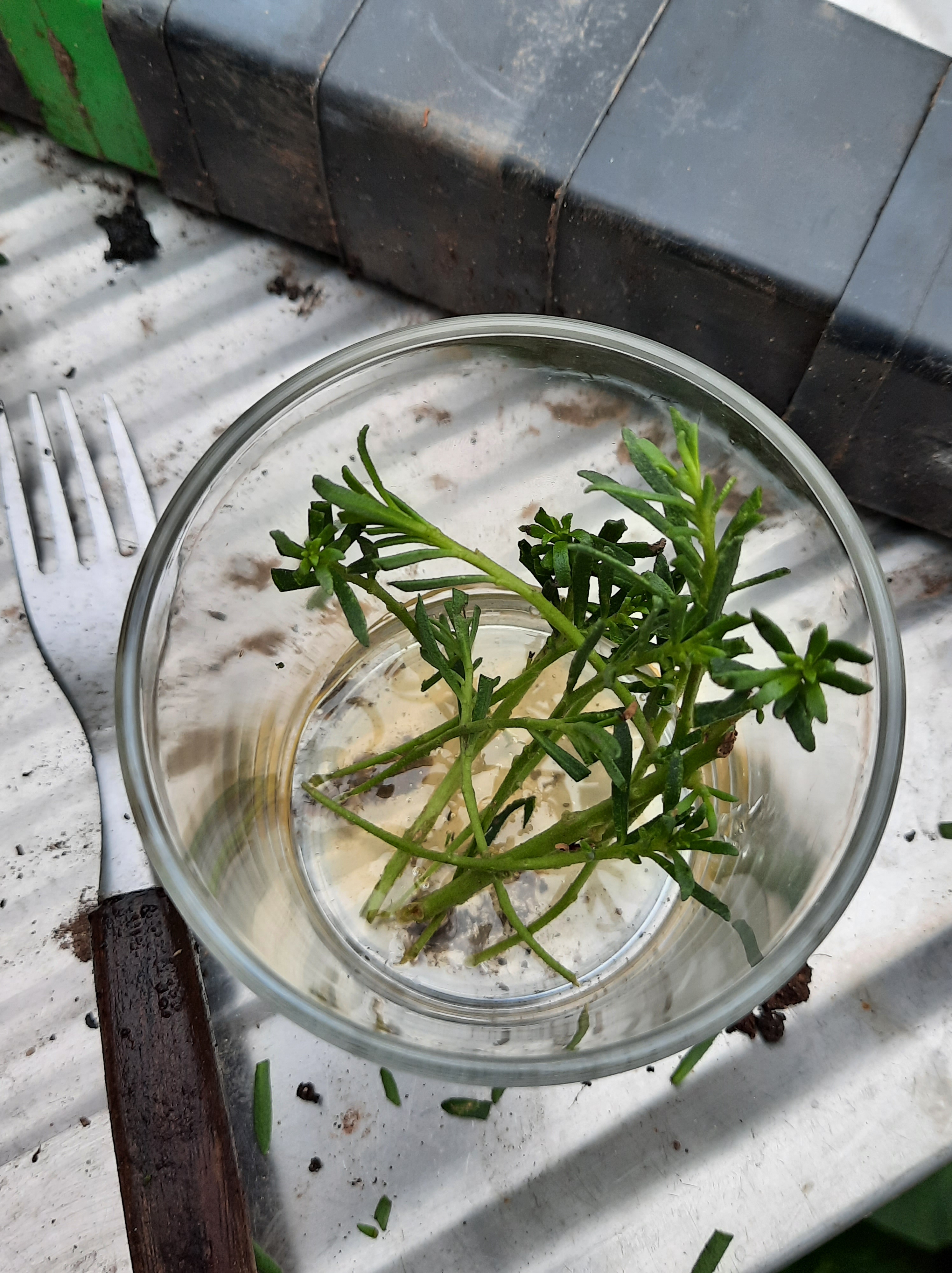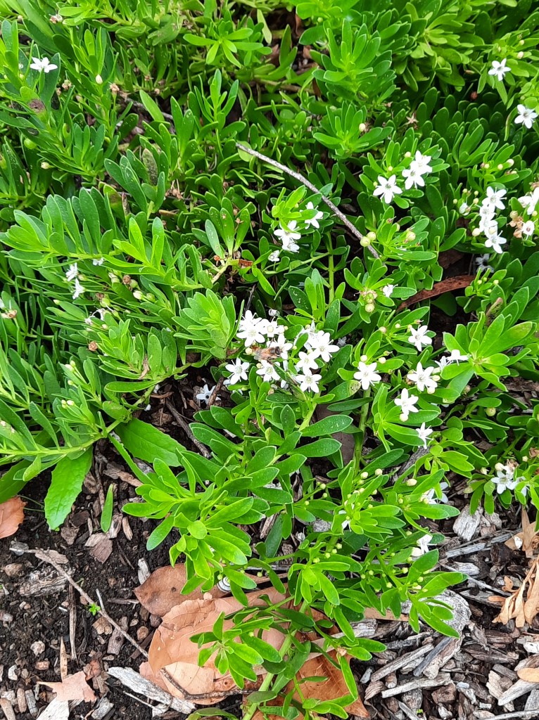 Autumn is the time for collecting seeds, taking cuttings and propagating by root division. I started out on cuttings with karkalla/pigface/carpobrotus glaucescens. Being a hardy succulent, it propagates very readily, and as the first link states, it is edible as well as having a lovely flower. I have stopped propagating it only because it is so severely attacked by cushiony scale in my area that enormous plants I had established (and those planted by council) have all but died. My next choice was creeping boobialla (myoporum parvifolium) see image above. Some I propagated from my parents’ garden, and planted out in a street where council left bare earth for over two years. It propagates readily, survives in challenging soils and with no additional water in my neighbourhood. It can form a nice, dense, weed limiting mat of leaves and it flowers and fruits, providing food for insects and birds. I’ll explain how to propagate it below.