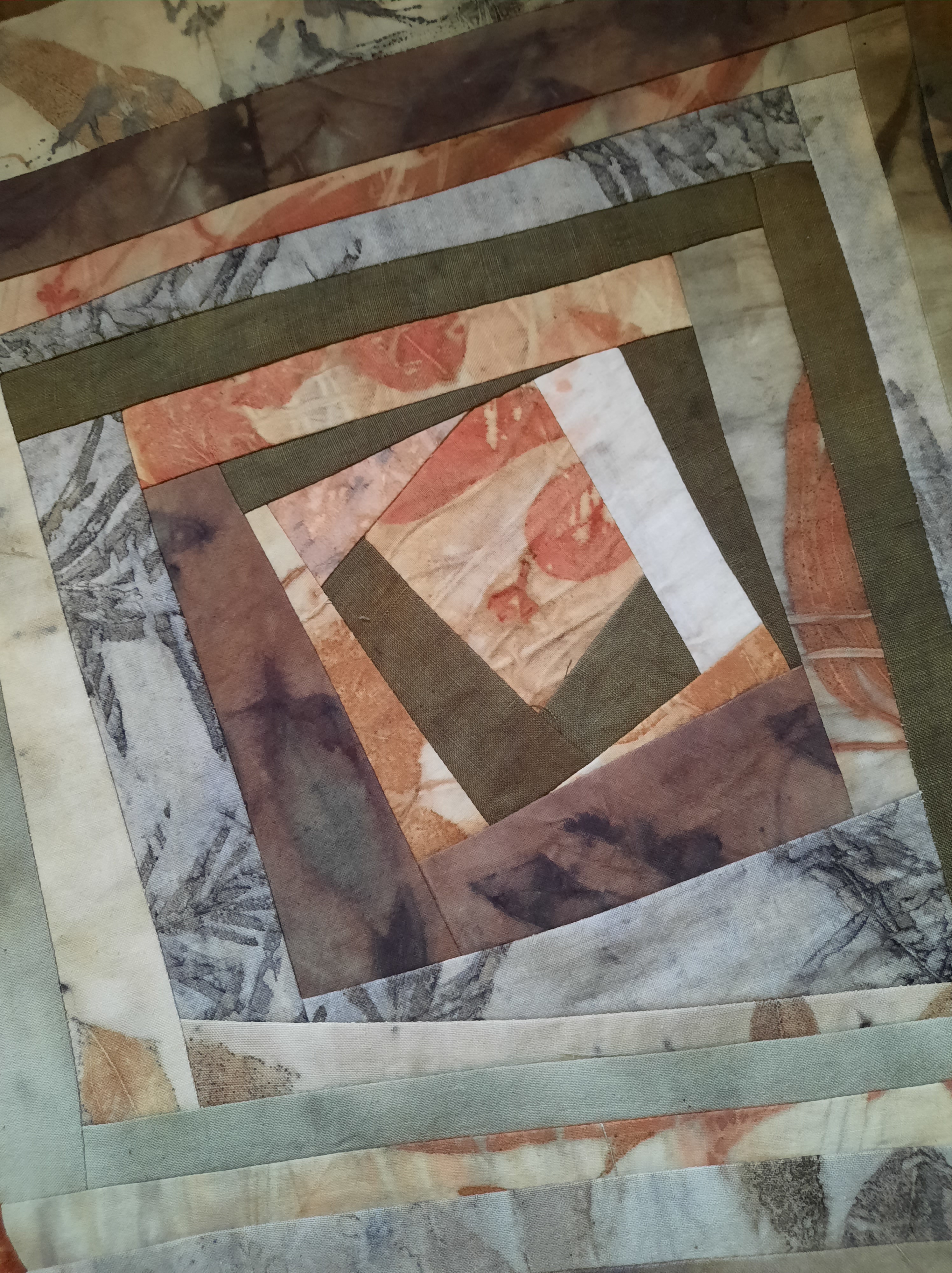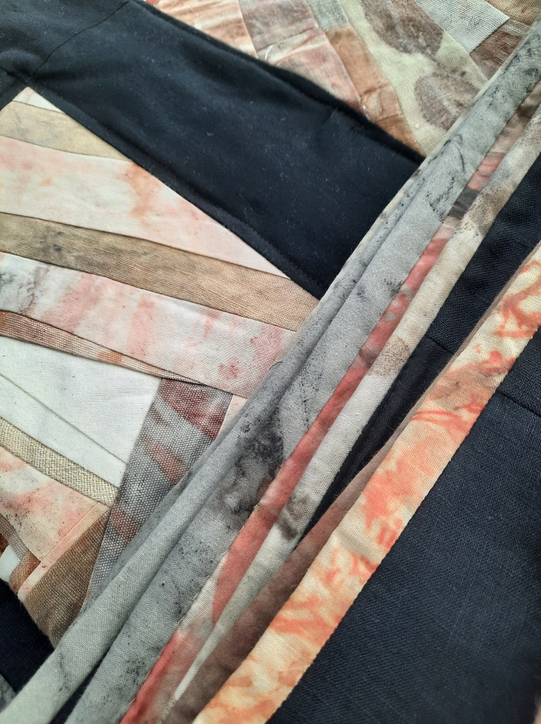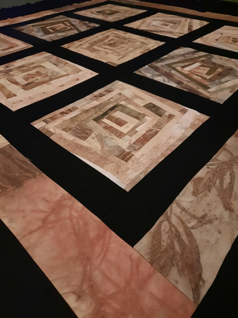 Next stop, binding (with strips of plant dyed fabrics), another great use for narrow strips or prints that are just not that scenic.