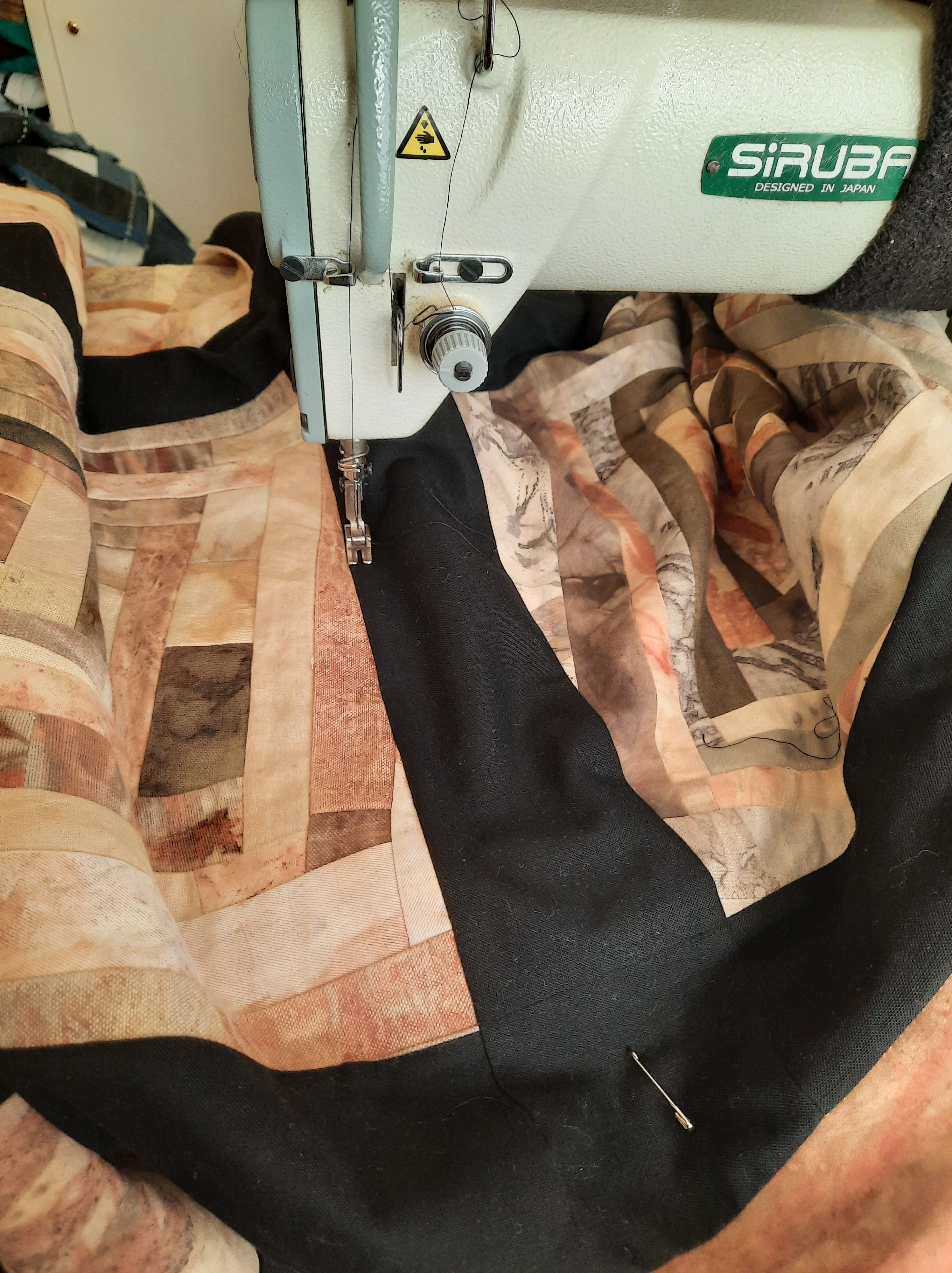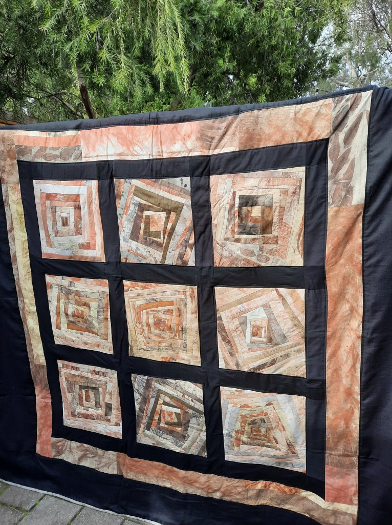 An archaeological dig through the cupboards turned up 7 plant dyed blocks created in this way, with all kinds of tired old fabrics used as the foundation: worn out napkins and a threadbare dressing gown handed on by my mother-out-law stood out as most recognisable. I created 2 new blocks to make up 9 and set to work on creating sashing from all kinds of black fabrics from my stash. There are a lot of different black fabrics here, mostly cottons and all from stash. I have done this kind of crime against quilting enough times to know that I am OK with it!