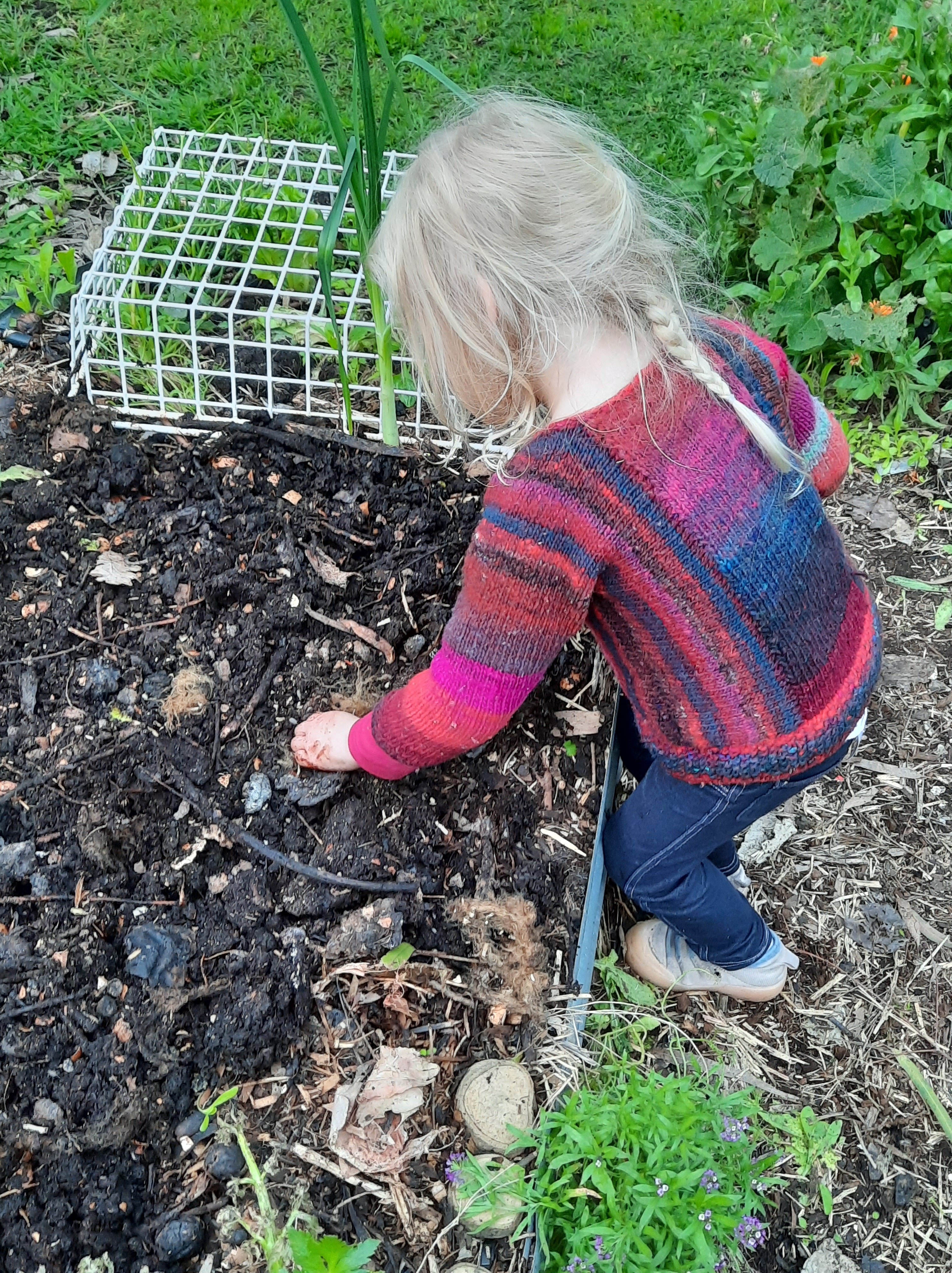 If you have subscribed for a while, you will have noticed me being absent for over 6 months–thanks for sticking with subscribing! I’m looking back over the photos of that period and selecting some that might be of interest. Here is my little love (not so little really!) gardening in a jumper I knit her. I found almost all of this wool in a regional op shop and spent more on the last ball than on all the rest put together. I made two in different colours and they were favourites for a while, now surely outgrown. I think she is investigating worms in the garden here.