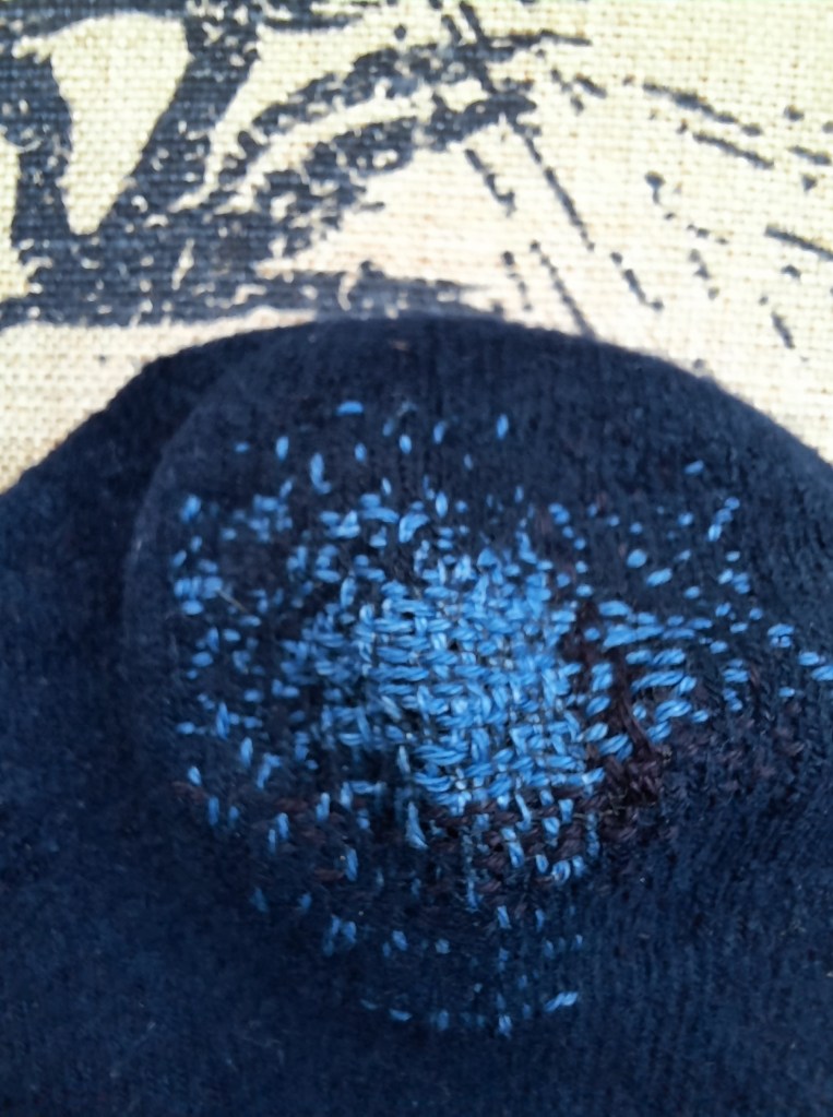 Here is a sock mend I did for myself. These are bamboo fibre socks. Bamboo fibre is not actually a great choice for the environment it turns out–but I have several pairs I received as gifts, or bought myself, before I understood their impact. Really, the idea that these things are individual choices rather than there being industry standards that prohibit pollution is absolute nonsense. *cough* It’s hard to find socks that I can actually wear with comfort these days, so I don’t want to let them go. I’ve darned them with sashiko thread, which is a sturdy, all-cotton option that is thicker than machine sewing thread–meaning I can darn a hole in this lifetime in a machine knit sock and wear it with comfort.
