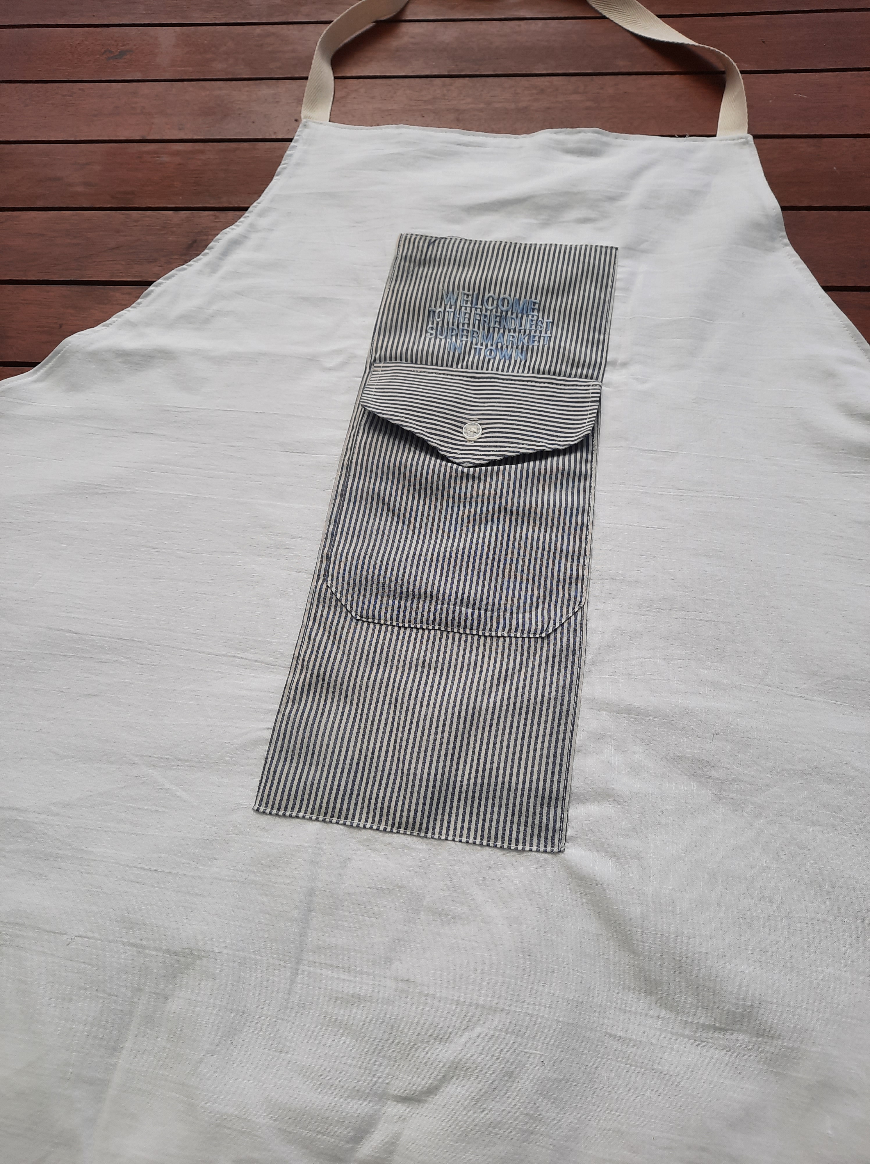 I have posted before about my friend: grieving the loss of her parents, and in possession of all of the textiles from their house of many, many years. One thing there were a lot of, were shirts her parents had worn in the little supermarket they ran in a tiny country town. We agreed I would turn some into a pinny–short for pinafore, in this context meaning an apron that generously covers you up as you work.