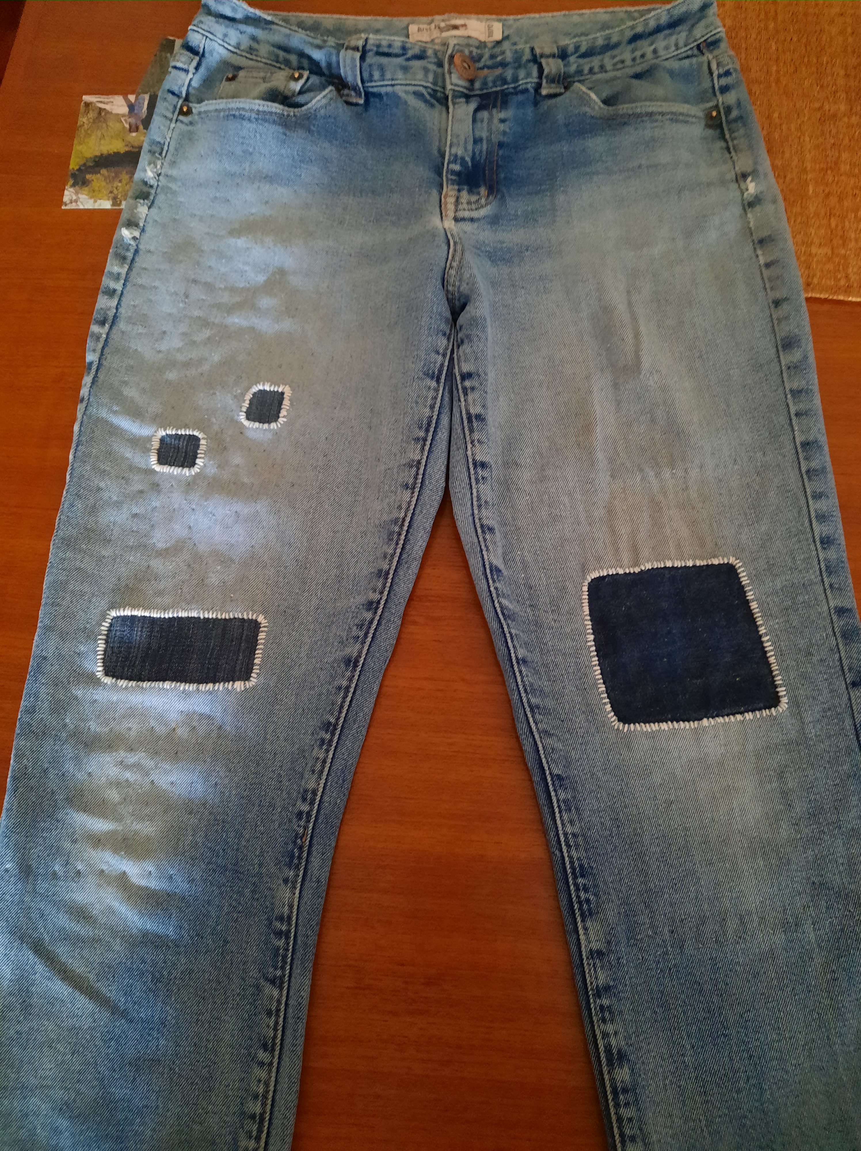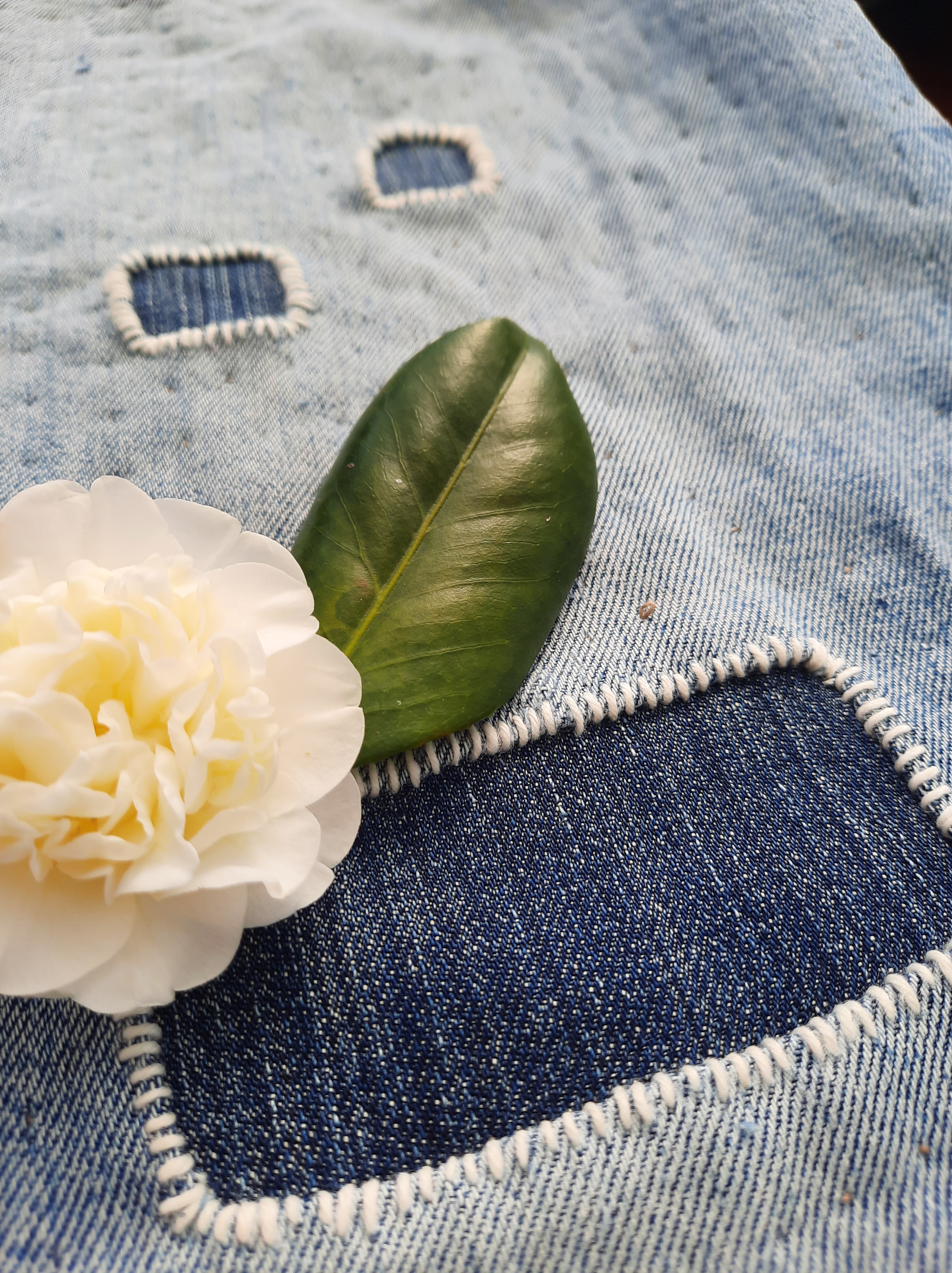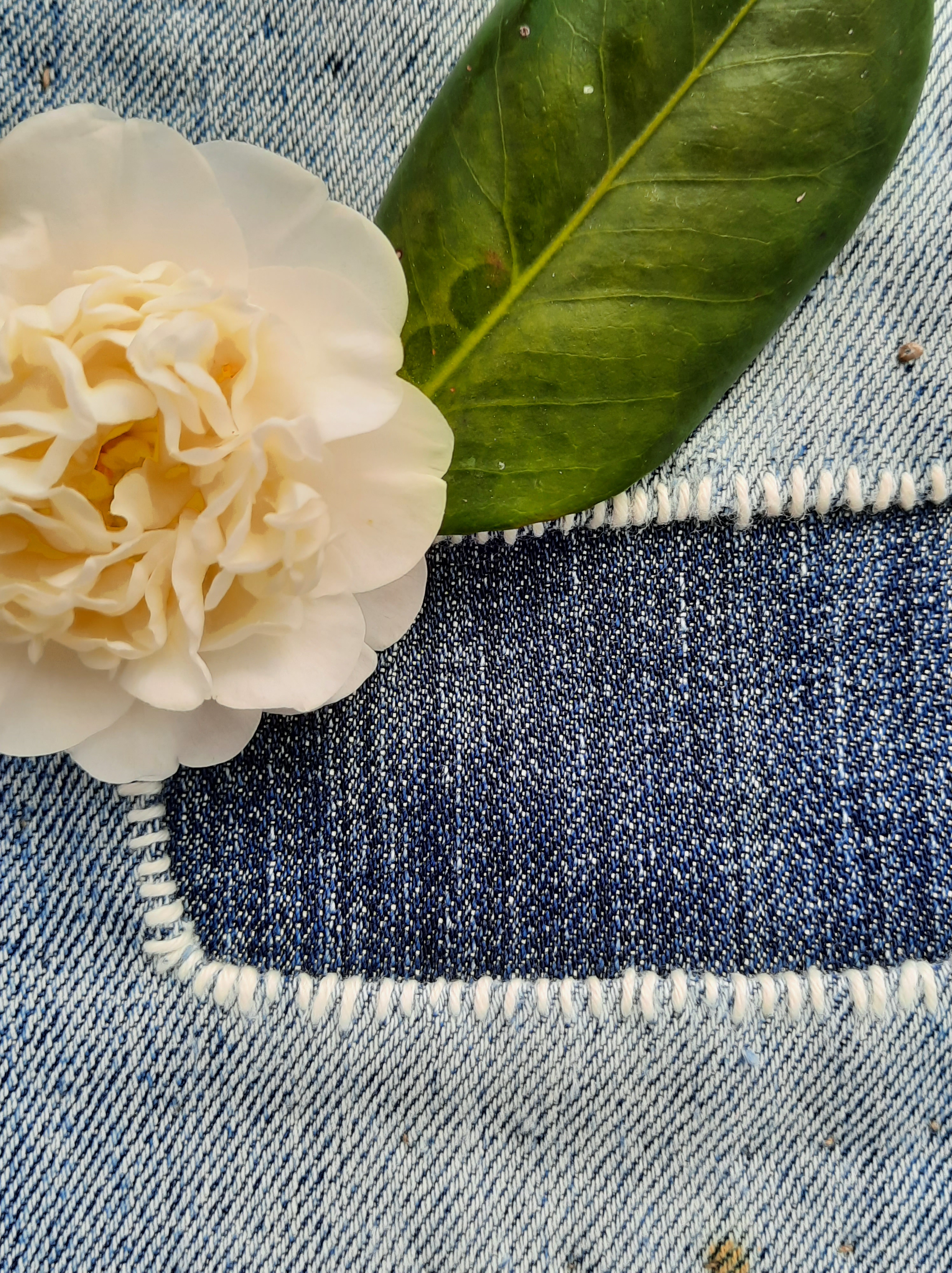 This is a close up of patches I added to my partner’s jeans. I must have had a rush of blood to the head during camellia season…