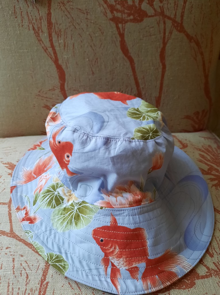 Here is one in a series of hats. I was away from the blog so long I stopped photographing projects in process, and sometimes took no photos at all! I promise that the sewing (etc) still happened! This hat was made from some beautiful Japanese quilting fabric (or maybe it is just quilt-weight?) with scrap cotton drill as the brim interfacing. I bartered the fabric from another participant at a workshop for something I’d made–she had found a stack of glorious fabrics at an op shop. This hat has had a lot of wear–happiness!