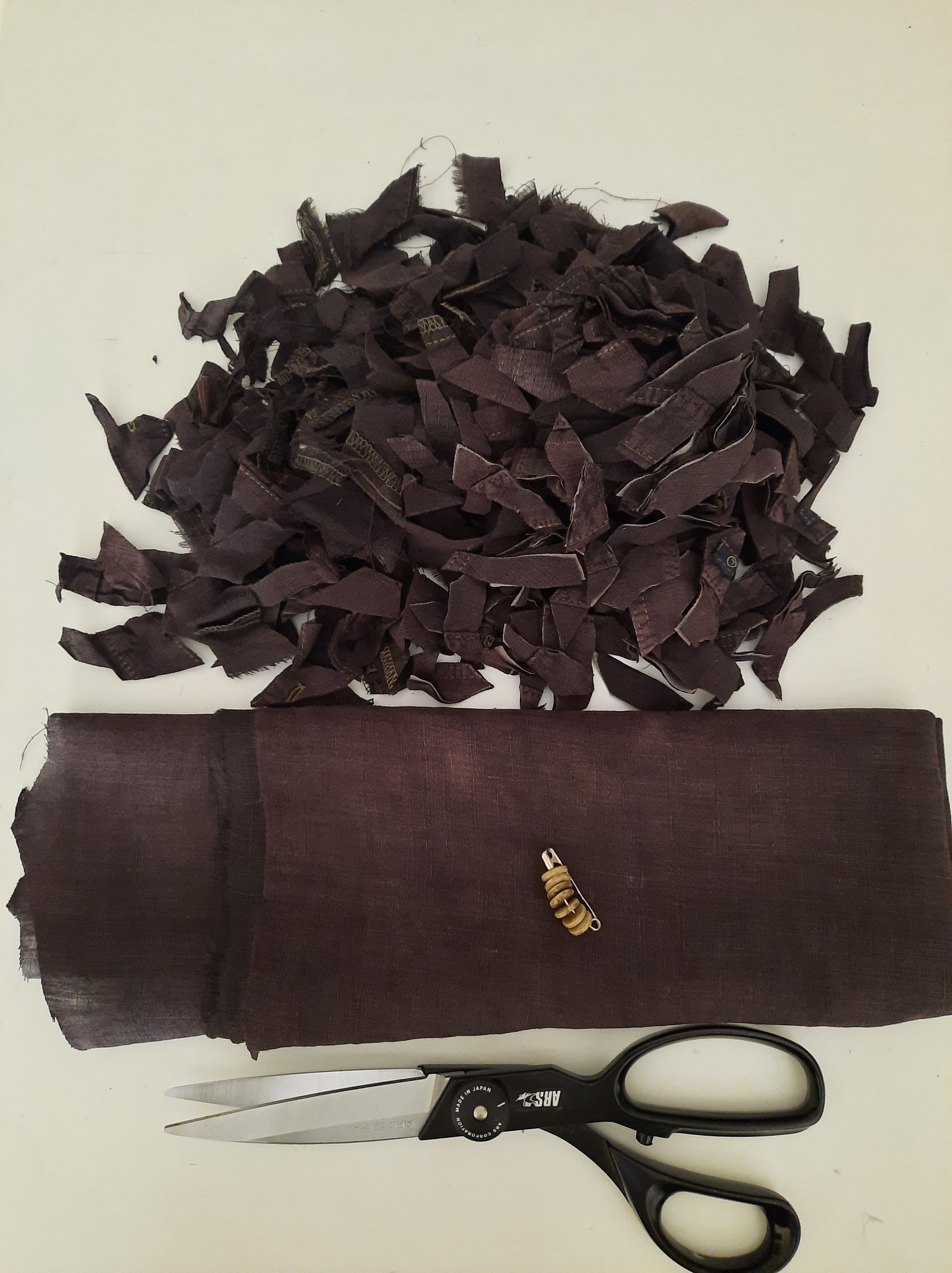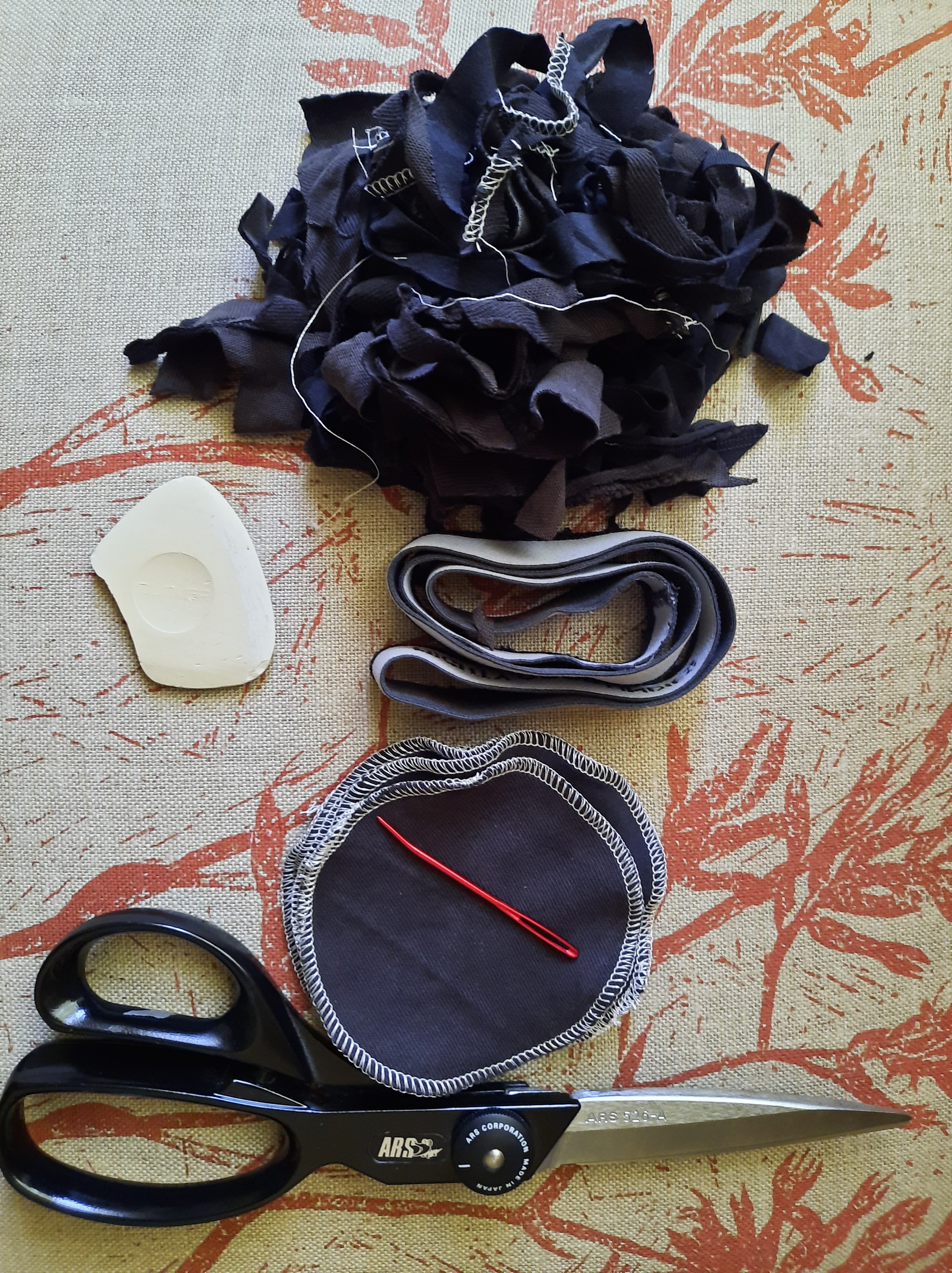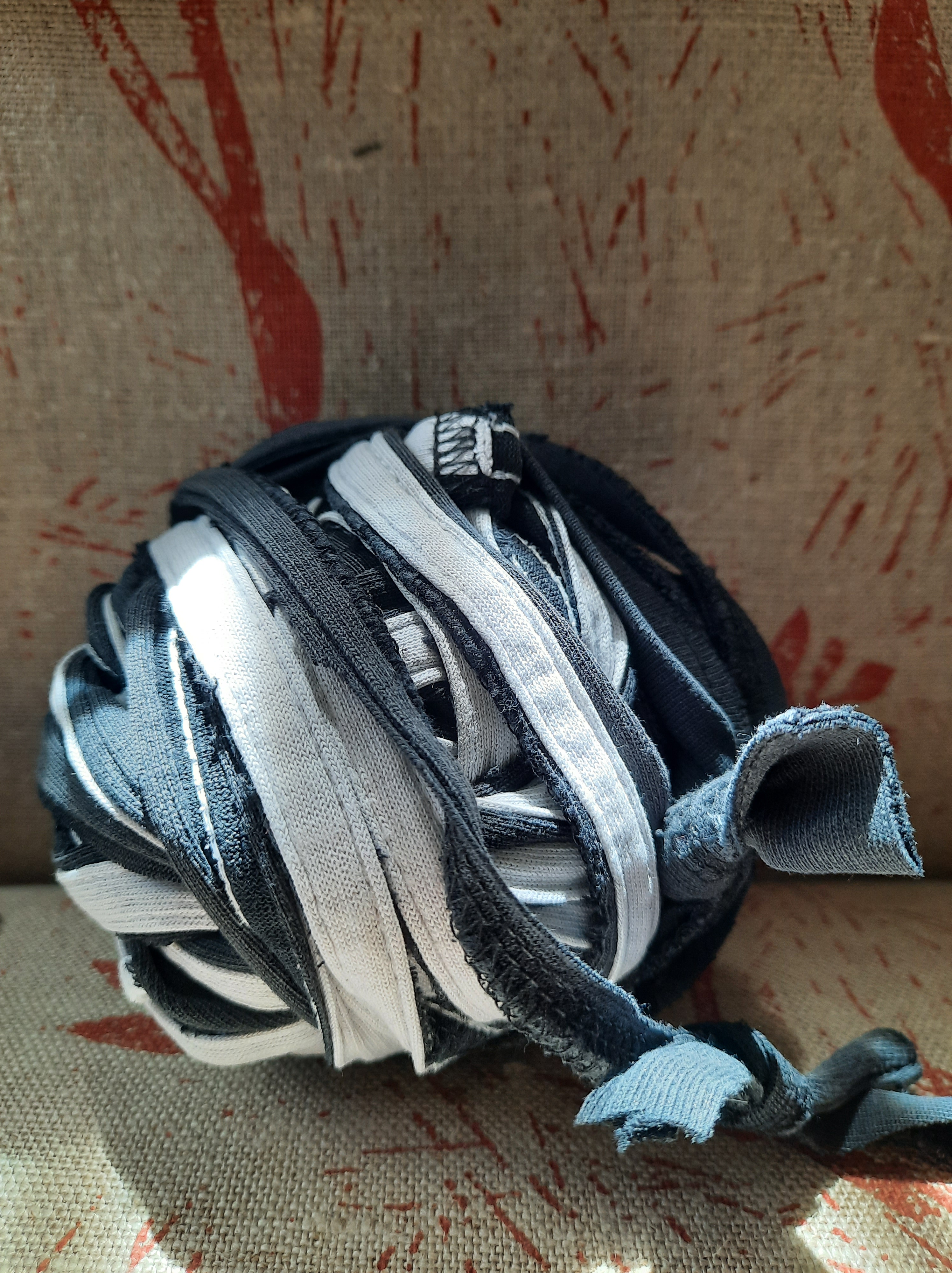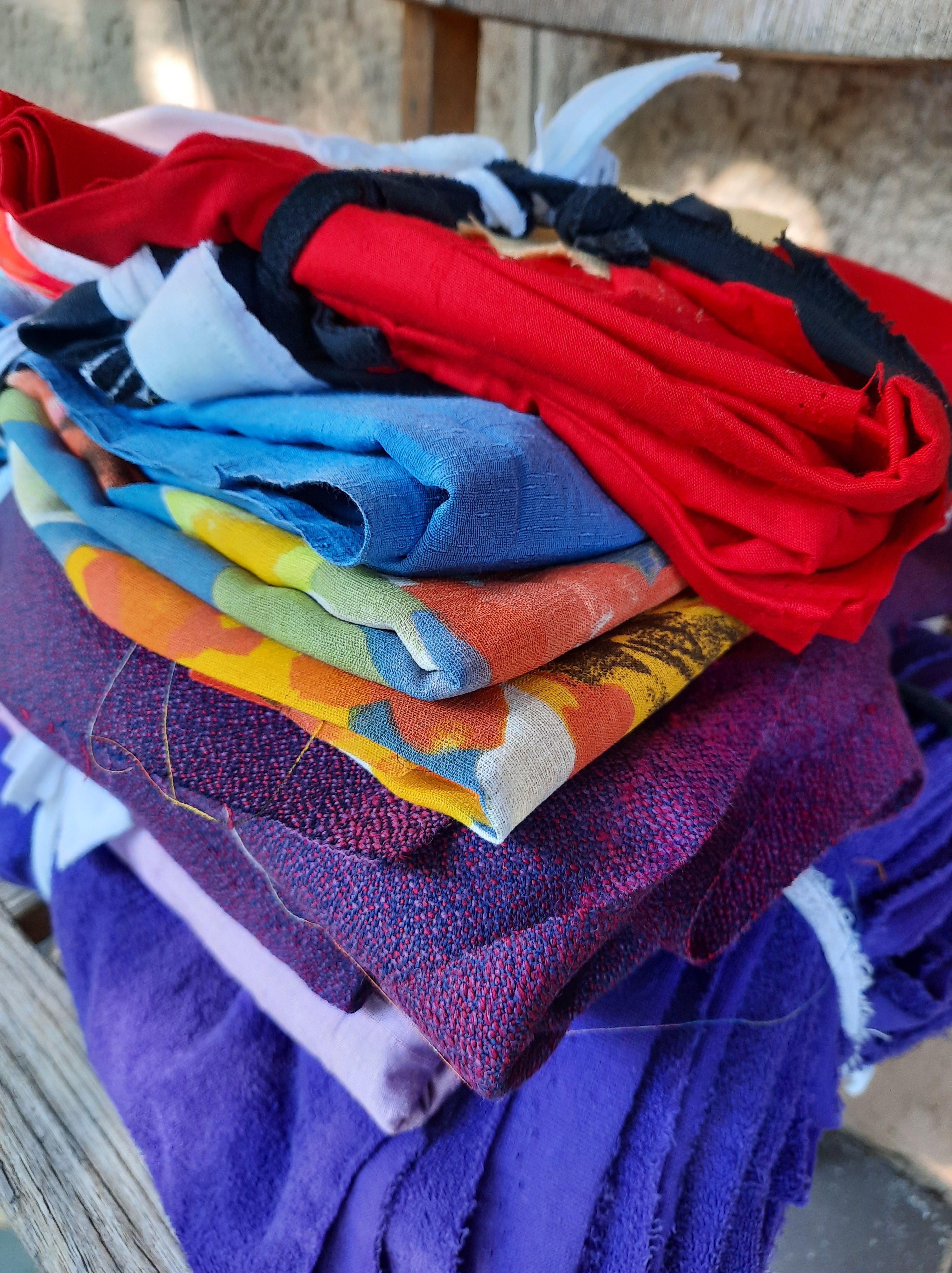 When I cut things up, the seams and hems usually end up in my ball of “string”. I use it to tie things up in the garden. Sometimes, I tie dye bundles with it (but it’s hard to pull tightly enough for that to be an ideal application). Sometimes I use it for bundles that don’t need special string. Here, I’ve tied bundles of a friend’s fabric that I gave away for her on Buy Nothing–with the recipient’s name written on a scrap of rag.