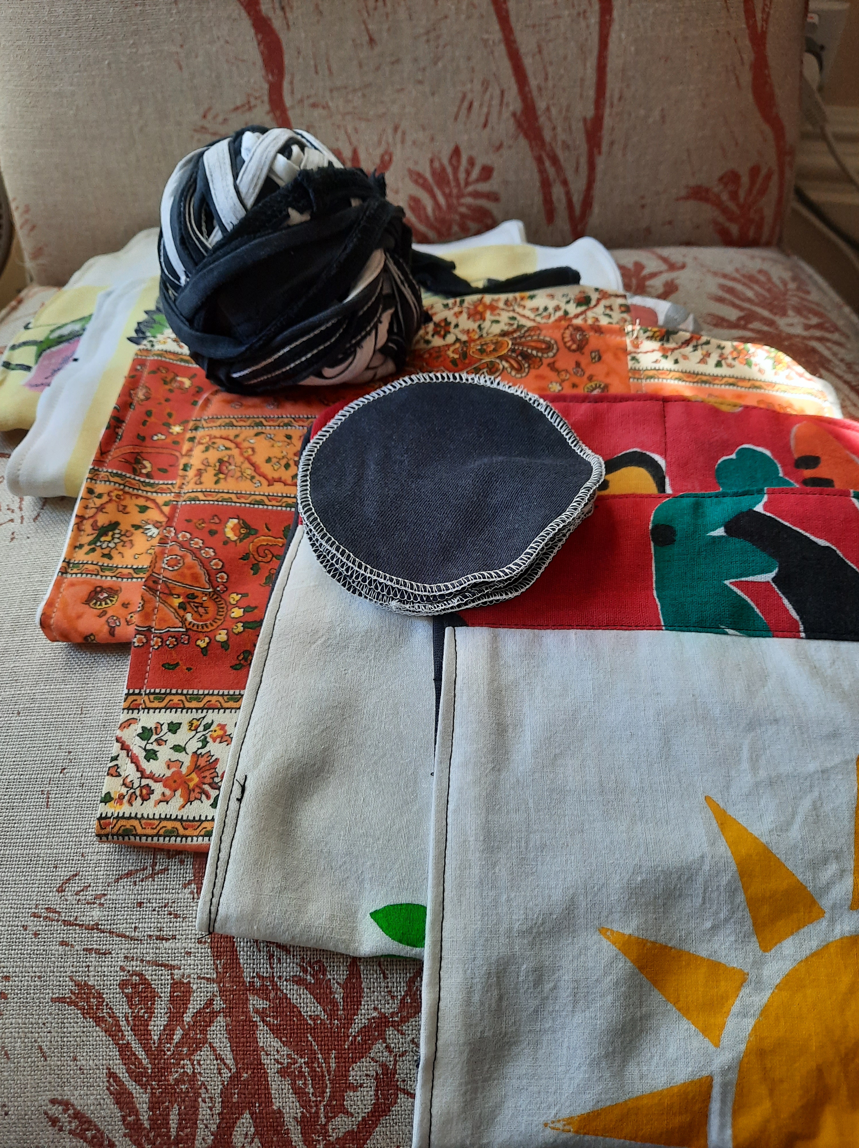 But these are applications only for parts of garments I can’t otherwise use. Here, I’ve teamed up dead t shirts (cotton knit) as one side of a cleaning cloth, with dead table cloth, or a patch made with old sheet on the other side. Smaller parts of t shirts and other dead knit garments become small round cleaning pads (double layer, overlocked together). These can be used in any place a person would use a folded tissue or a cotton pad–and washed and re used.