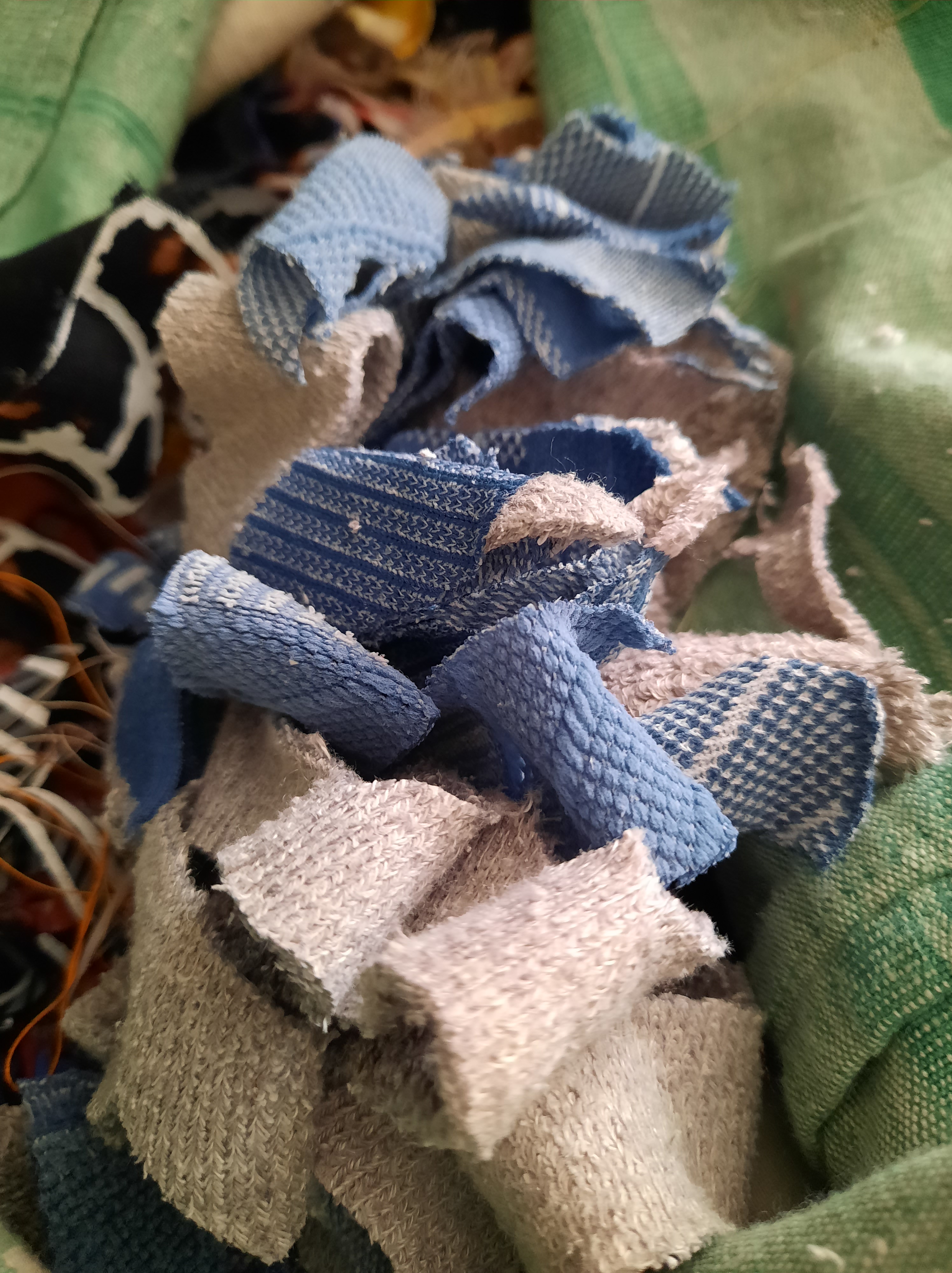 It looks to me as though I used polyester overlocking thread. In my experience worms and microbes will take the rest, and I will be able to pull the overlocking thread out and send it to landfill. Which is a reason not to use polyester overlocking thread, of course. But here we all are, still always learning and figuring out what not to do, and living with prior choices. Me included.