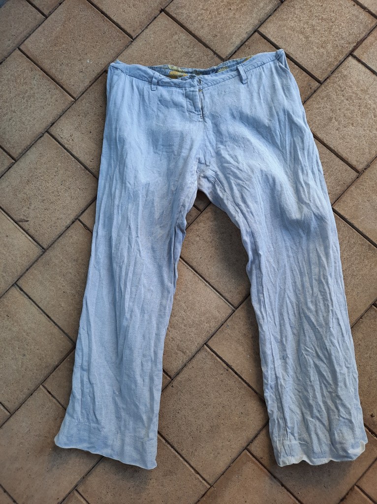 This is the view from the waistband, with the side seam ripped apart and my fingers poking through. I have laundered them and they are drying, ready for the big SNIP. It may be time to make more summer pants, or make better friends with the ones I’ve been wearing less. Thanks, dear reader, for keeping me company as I let go of these trousers. They have been my companions in settings where I tried very hard to put across an image of myself as a professional woman, no matter how scared or inadequate I felt at times. Someone who could be trusted to wear pale pants and not spill beetroot juice on them. Someone who was cool as a cucumber and trustworthy, in cream linen. This last pair, I bought out of necessity for an appropriate summer garment when I had just been “promoted” to the highest point in my life in day job. I thank them for their service. We have both moved on. Let’s see what comes next for us both!