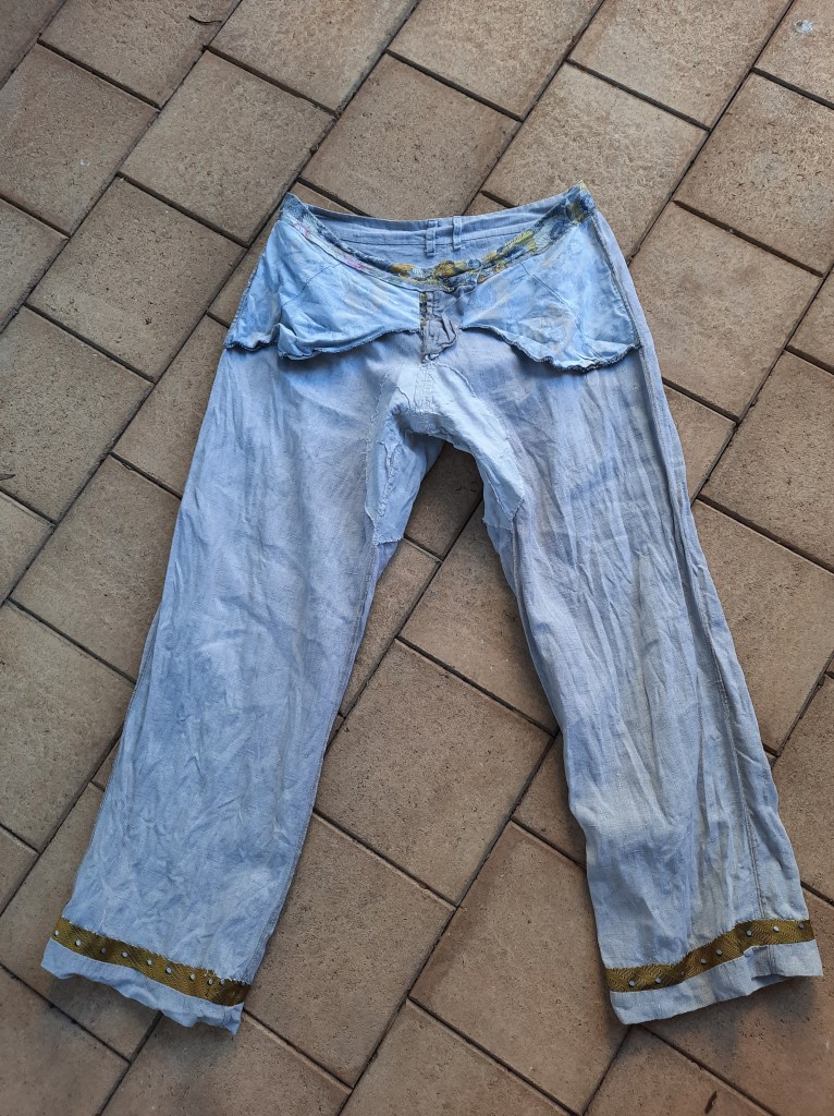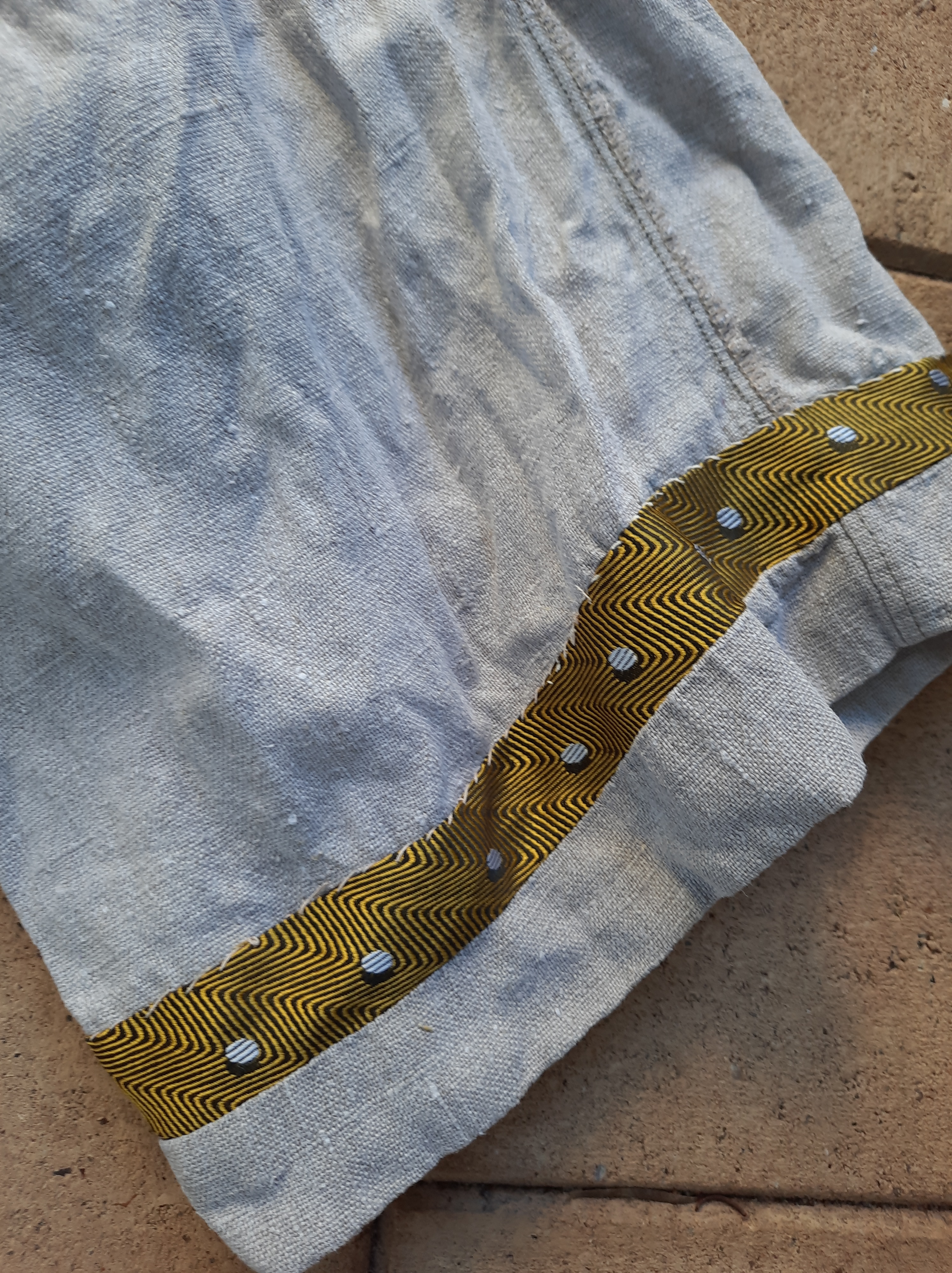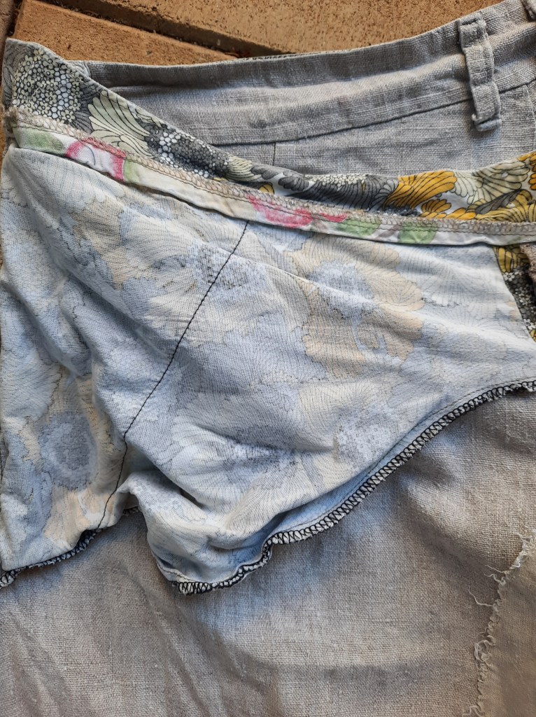 These, for instance. I wore them last week and realised that the reason they have been in the drawer and not on my body this summer is because I don’t trust them to hold up for the bike ride in and out of town. Their days of being best are far behind them. The patches on the inside are not keeping up with the wear on the inner thighs any more. So tonight, I’m going to cut them up with great sadness. This fabric was found, not bought. I loved facing that waistband with that fun floral print. The zipper was once yellow. Now only the plastic and metal parts are yellow, the rest is white. The fabric is a completely different shade than when I made them. I see I used an old favourite shirt I’d finally pensioned off for interfacing. And what fun to have that home made bias binding at the cuffs, made from an op shop tie! I have sewn up that hem more than once. Anyway. I think I have an idea for how these much worn, much laundered and much loved linen garments can live on in a different form in my life. So I’m going to admit that it is time, start the process of deconstruction, and move them to another stage. The final trigger was having a creative idea for re-use but also, wearing another pair to teach mending today. I took extra pants just in case. Which made clear to me that I can’t trust this other pair of trousers anymore! And after the workshop was over, I got into the car with my phone in my pocket, and there was an almighty RIP!!!