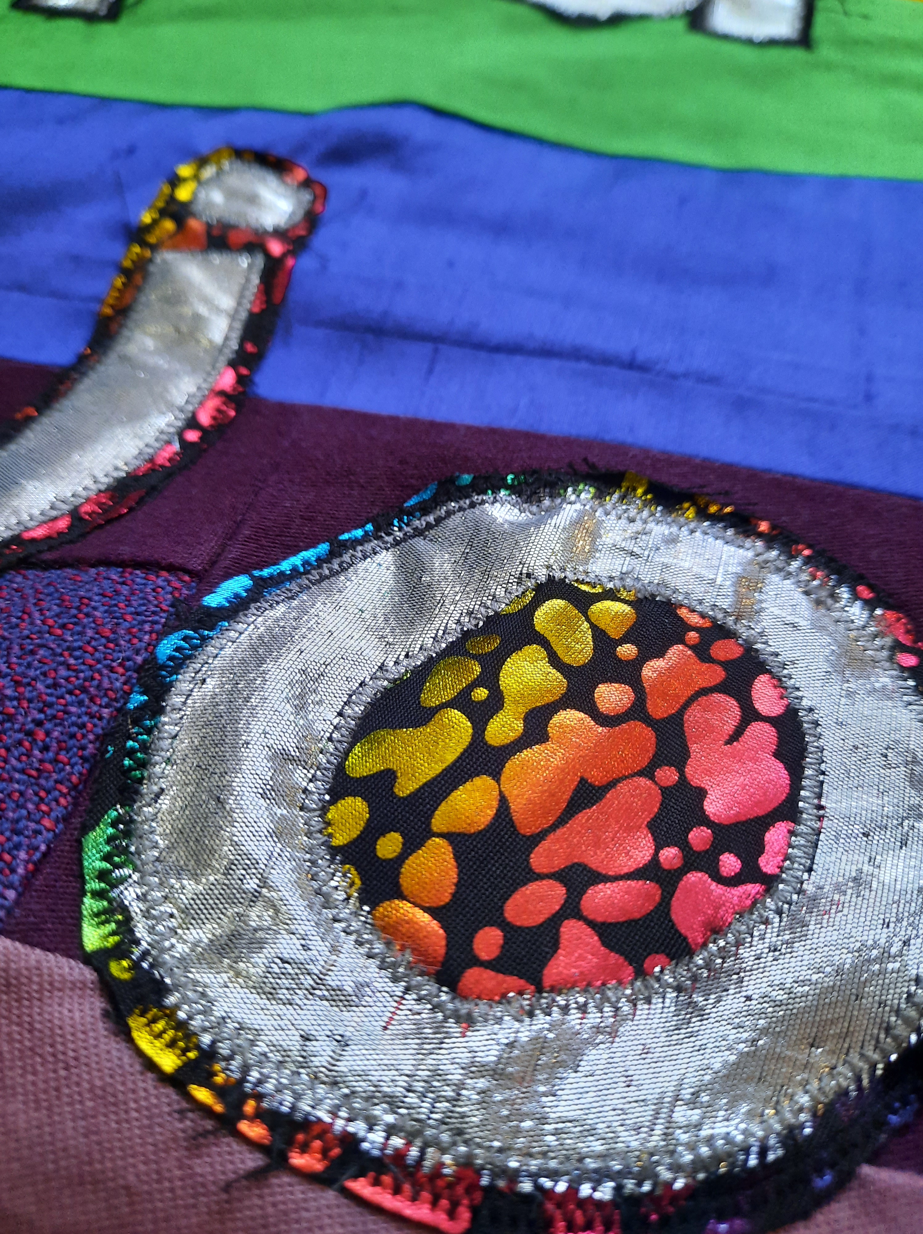 Today I finished the first fever dream. I have now begun three of them, so this is a series of at least three. It is made entirely of reclaimed fabrics. Bits of sheet, parts of garments, fabrics gifted to me from people who no longer want them, scraps left from other things I’ve made, and two small pieces of bling that came from an op shop in the Flinders Ranges, picked up once I had begun making this but not yet finished. They wanted to be part of it! The back has been foundation pieced onto a pieced backing made of calico, worn out sheet, even a scrap I found that had been a barrier cloth in some plant dyeing project and then been a test fabric for screen printing.