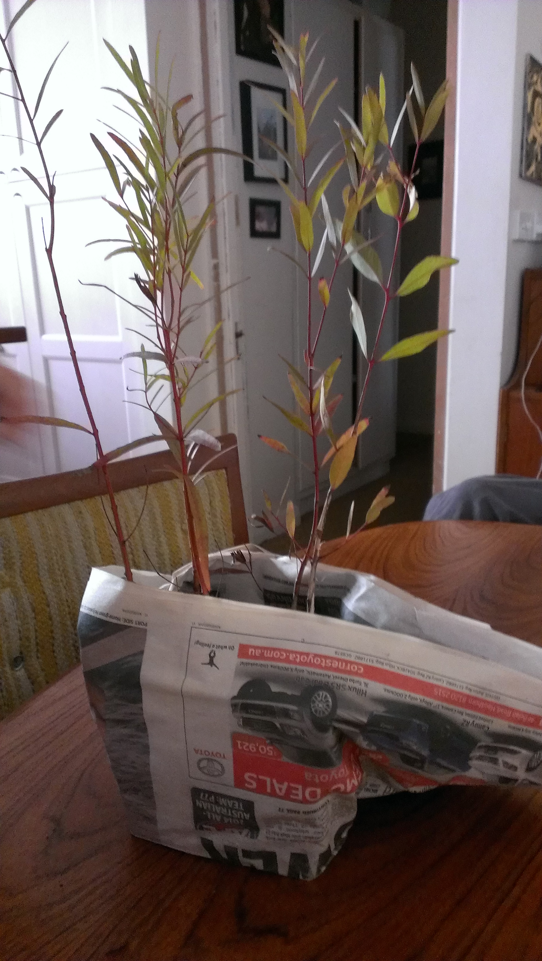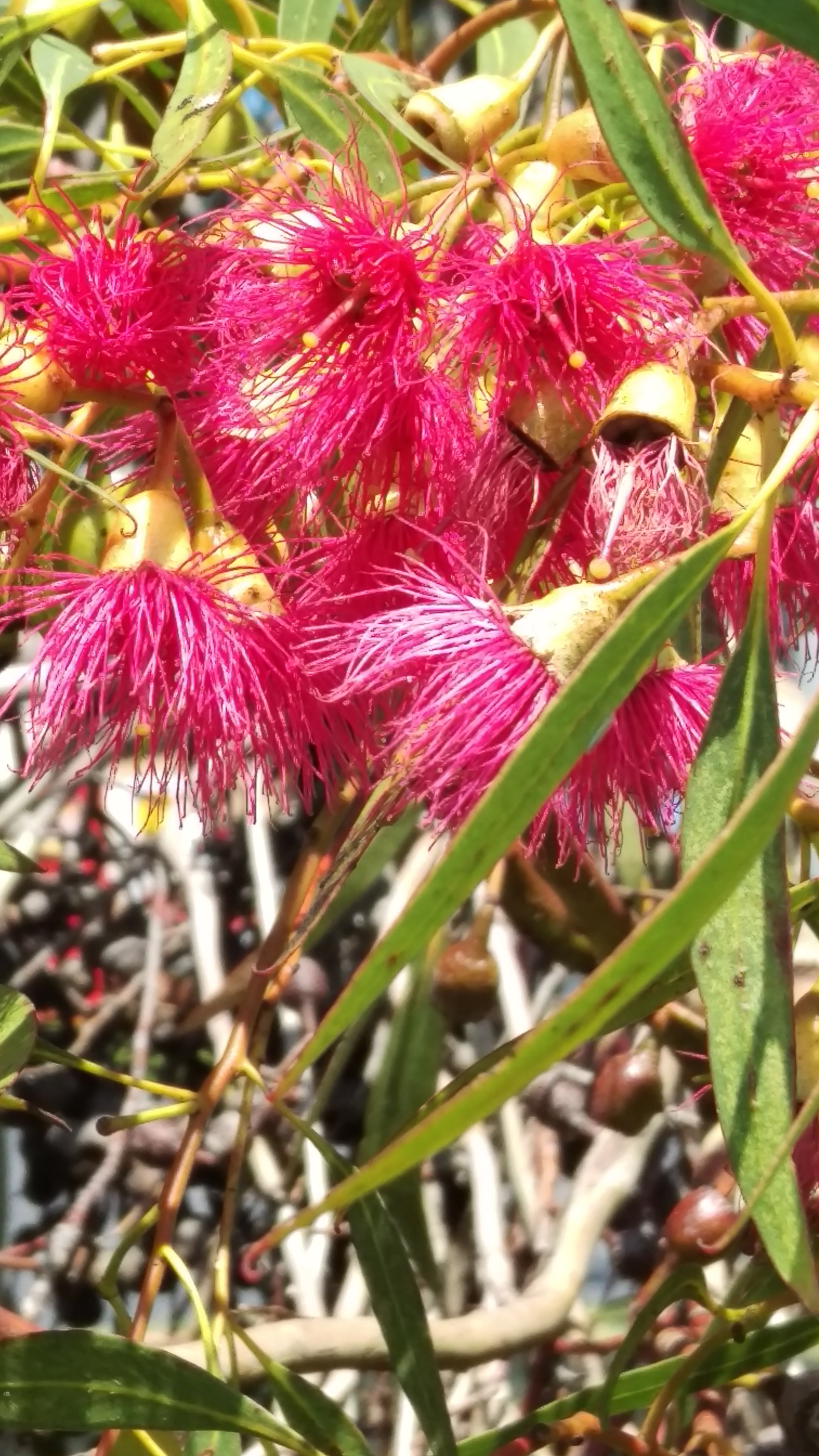 Plants in, weeding done, I headed out to this E Scoparia. It’s a beauty with particularly slender leaves. The people whose fence it overhangs don’t like it tickling their hair as they pass and resent it hanging over their fence. So hard to understand! I selectively cut to minimise their struggle with it when I want to use this plant. I make it shorter over the footpath and then trim the lowest hanging parts over their fence.