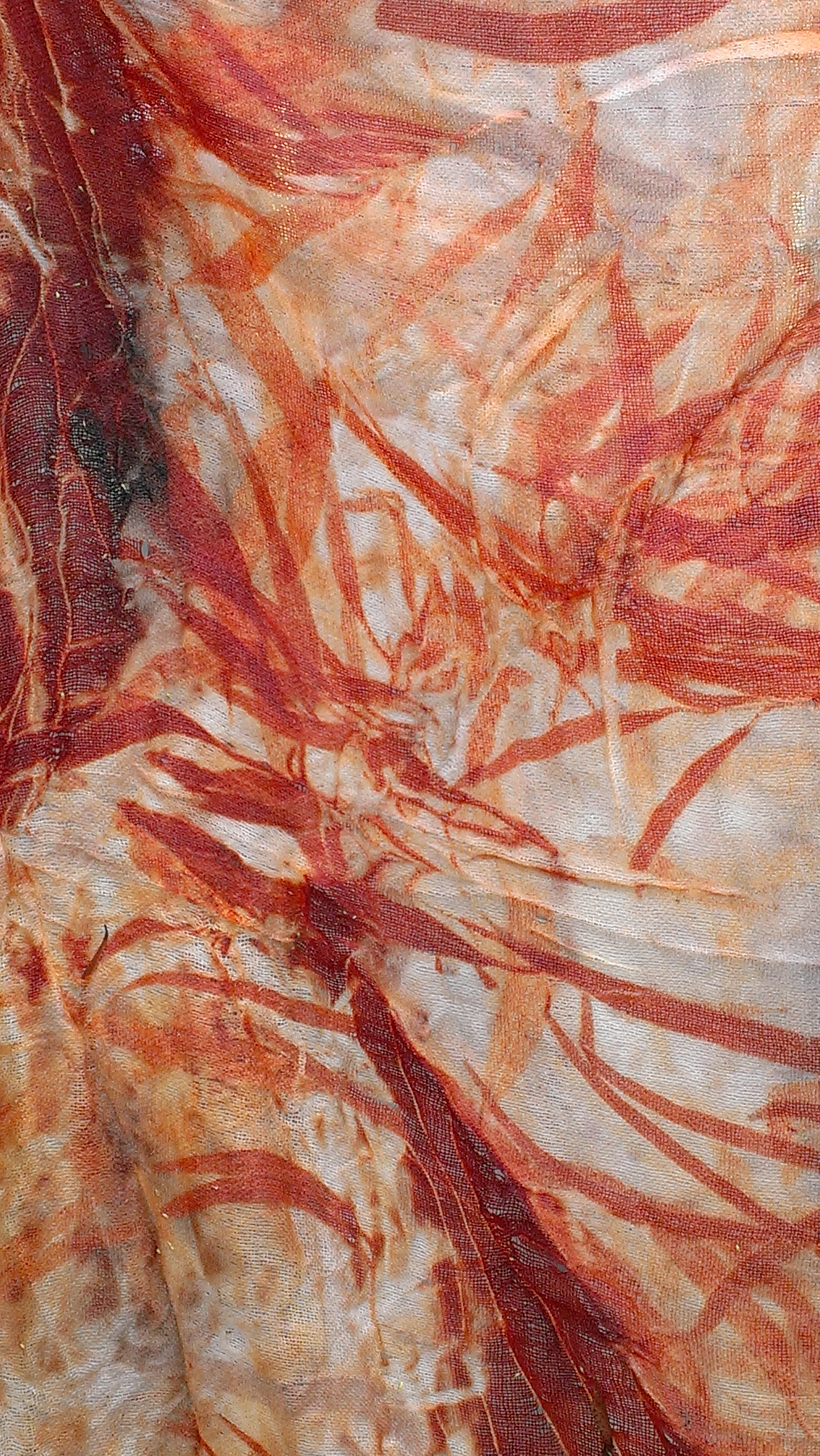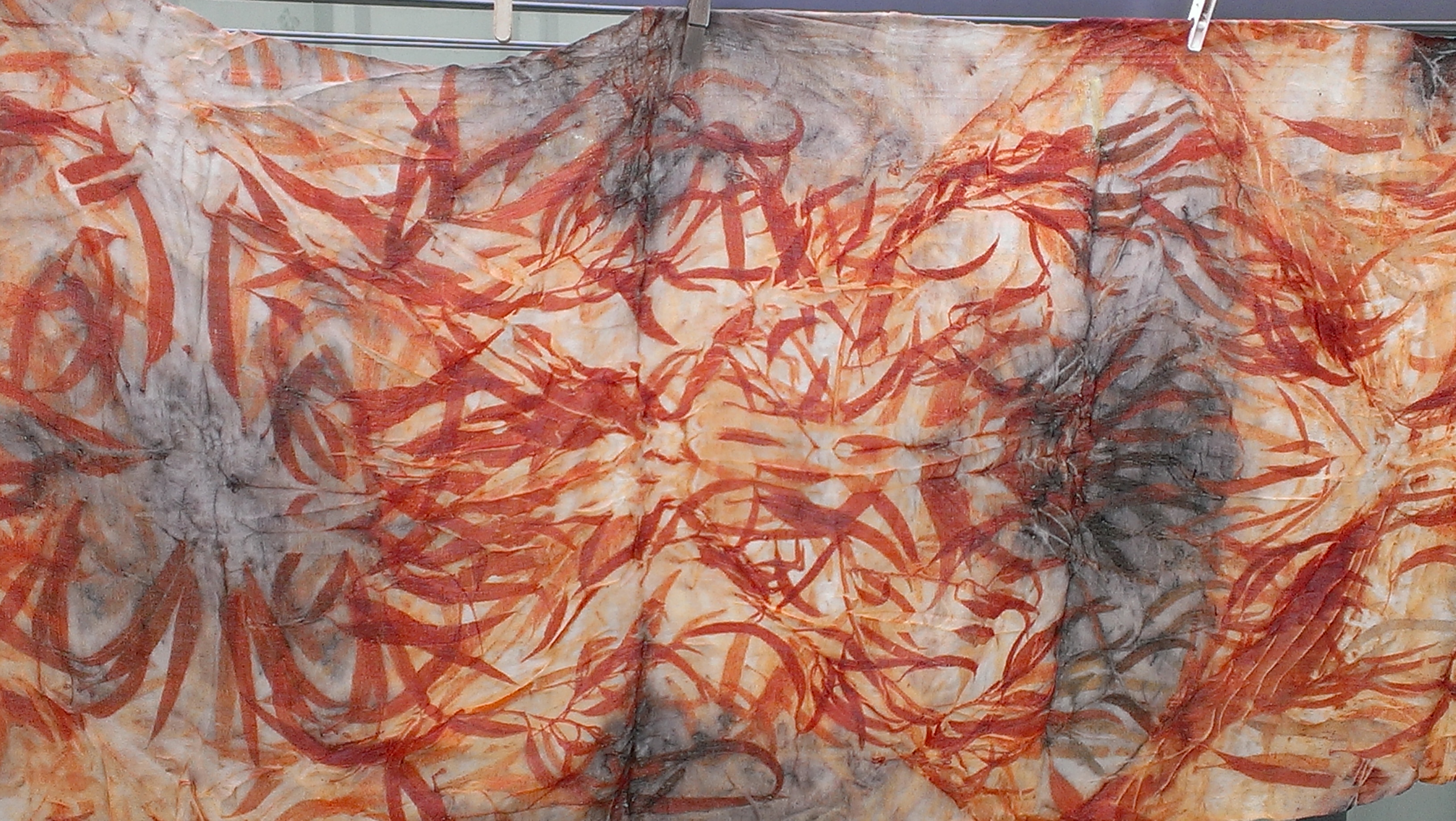 Well, I think this is an improvement! Here is the front. The logwood didn’t really survive the dye pot very well, which works. The eucalyptus dyed threads have stayed their previous colours, but now blend in. The indigo dyed thread is still blue!