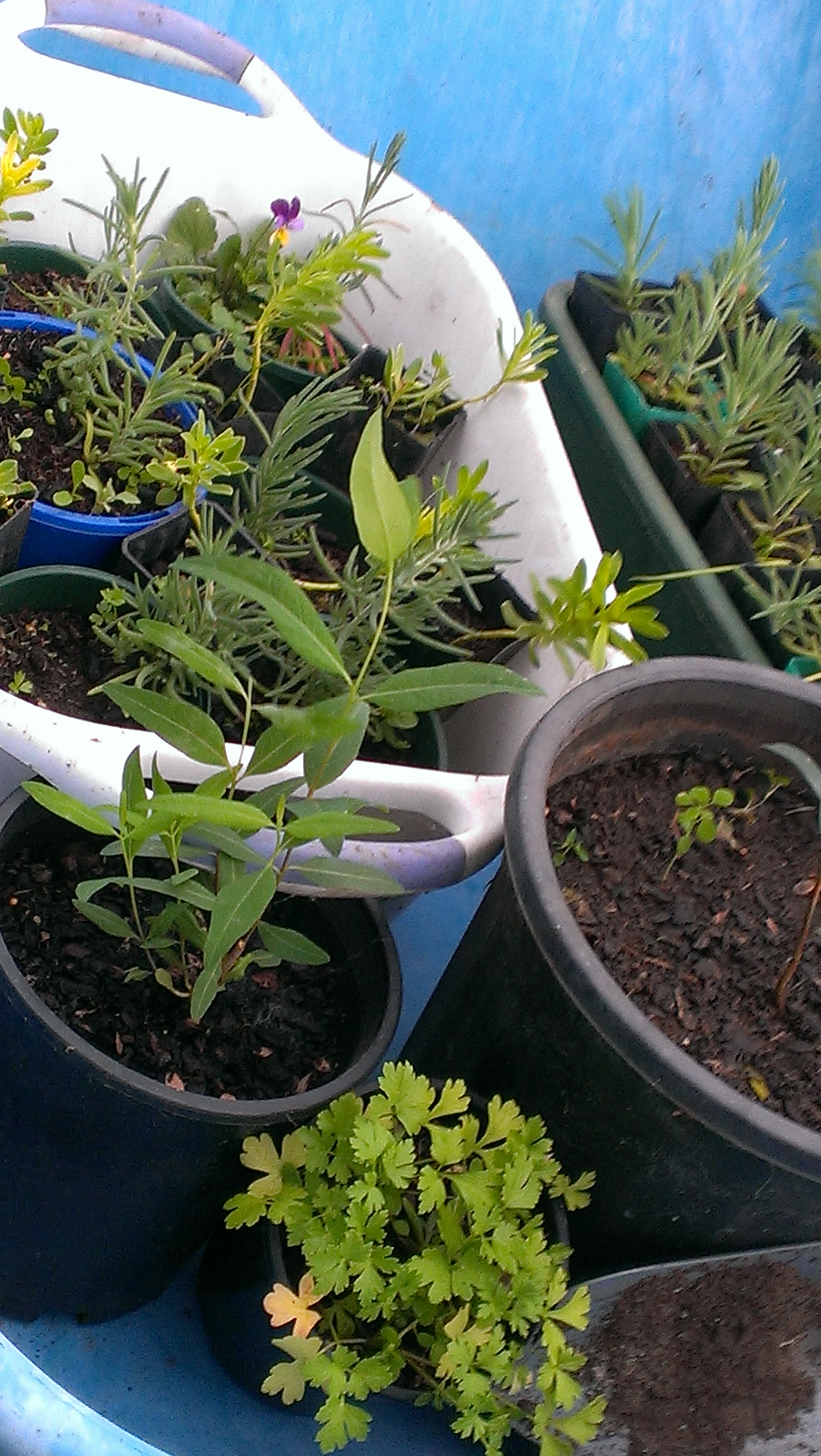 A friend came over with a gift! She lives beside the Aldinga Scrub conservation park and she grows endemic species at her place–and lots came up in her driveway where she felt obliged to dig them out. She has potted them on for me to plant. So this is Olearia axillaris–Coast daisy-bush. A silver-leafed, tall and bushy shrub well adapted to drought. We will see how it goes in the suburbs…