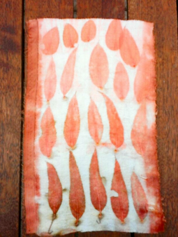 Choose a nice patch. This one was once part of a pair of cotton twill pants and is now eco printed with E Cinerea leaves. Trim back the hole to some solid fabric, and shape it. My mother taught me this mend and always created a straight sided shape, like a rectangle. I decided to try something rounded. Put the patch on the inside, and turn the edges of the jeans under all around, attaching to the patch fabric. Tacking would be a great way to proceed, but I prefer pins. Call me a daredevil!