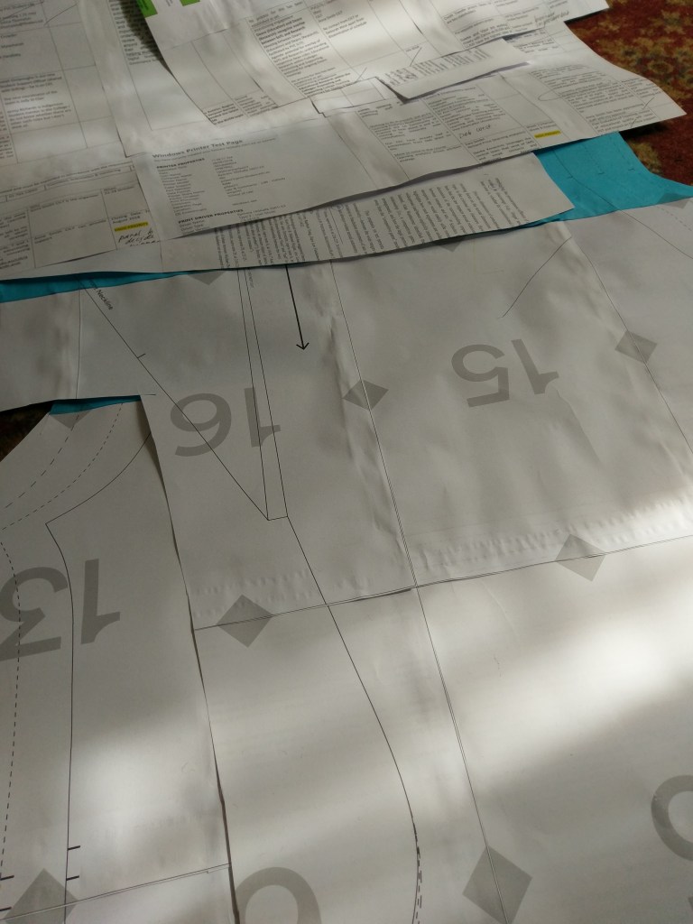 I did have to do the epic jigsaw-cum-collage that is assembling a pdf pattern. But then it was done and I was off, cutting out where the shapes of the dyed fabric worked for a pattern piece; patchworking together enough fabric for larger pieces as needed. Bits of old sheet and cast off calico, fast becoming a garment.