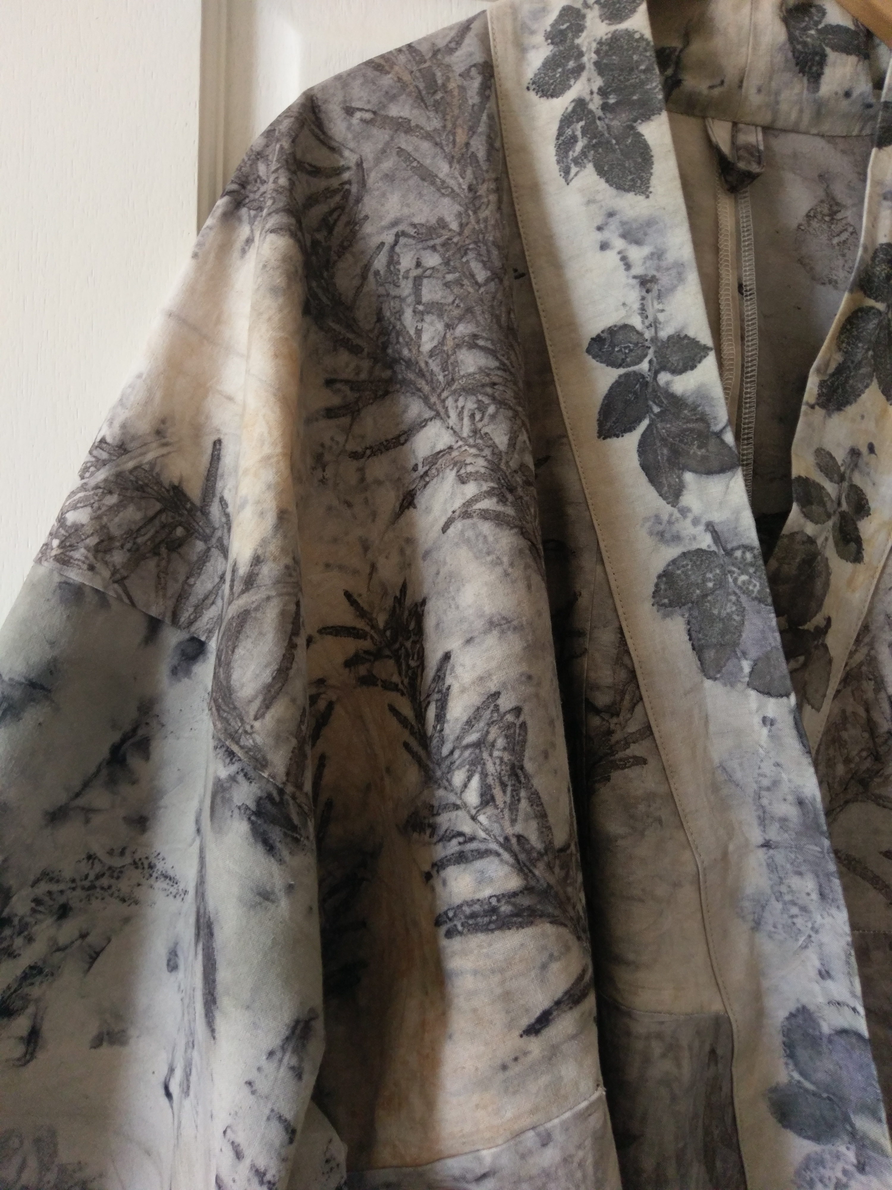 What often happens as I accumulate various bits and pieces of bundle dyed fabric is that over time, a thought about what they could become forms. At first, I thought a shirt would be perfect. I asked a sewing friend and I don’t think she liked the idea as much as I did–after all it would be a grey shirt. I reconsidered. More months passed, and one day I was at The Fabric Store trying to get fabric in a specific colour for a beloved niece, and there it was, hanging on the wall in the perfect colour of a beautiful linen: The Lucie Robe. The kind of sample garment that must sell a lot of patterns and fabric, I reckon. I thought about the 20 year old terry toweling dressing gown hanging at home (a gift from my beloved now well past its best), and how many times in the last year I’ve thought I should try to make a new one. I considered the glorious (and of course, expensive) linen and then thought… I might use my iron mordanted cottons instead.