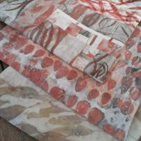 These are cochineal, madder and marigold. I had mordanted some silk paj in alum and taken it along. I tried eco printing it years ago and didn’t think much of the results. Wendi of the Treasure suggested jewellery quality string (which sounds very promising to me), so I’d been planning to eucalypt dye them–but took this opportunity to expand my palette. The silk went orange in the madder bath even though wool in the same bath was much more red–still good.