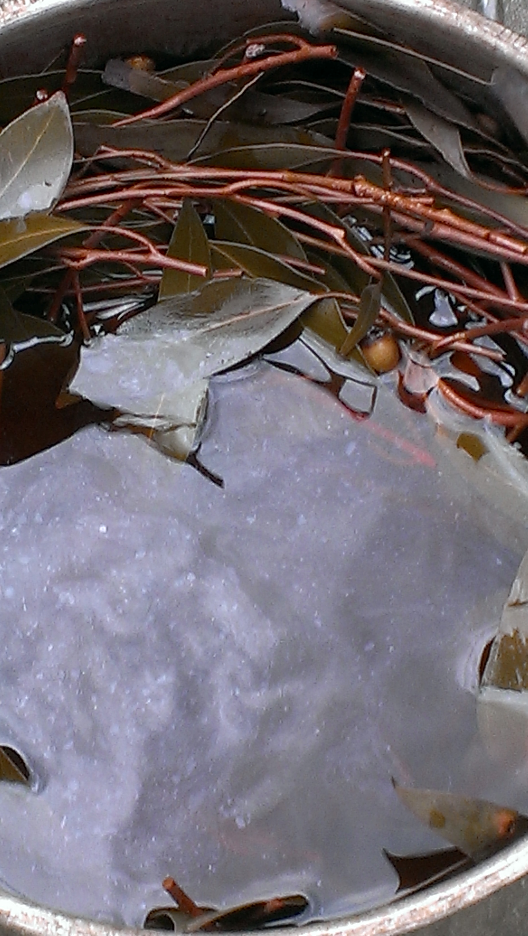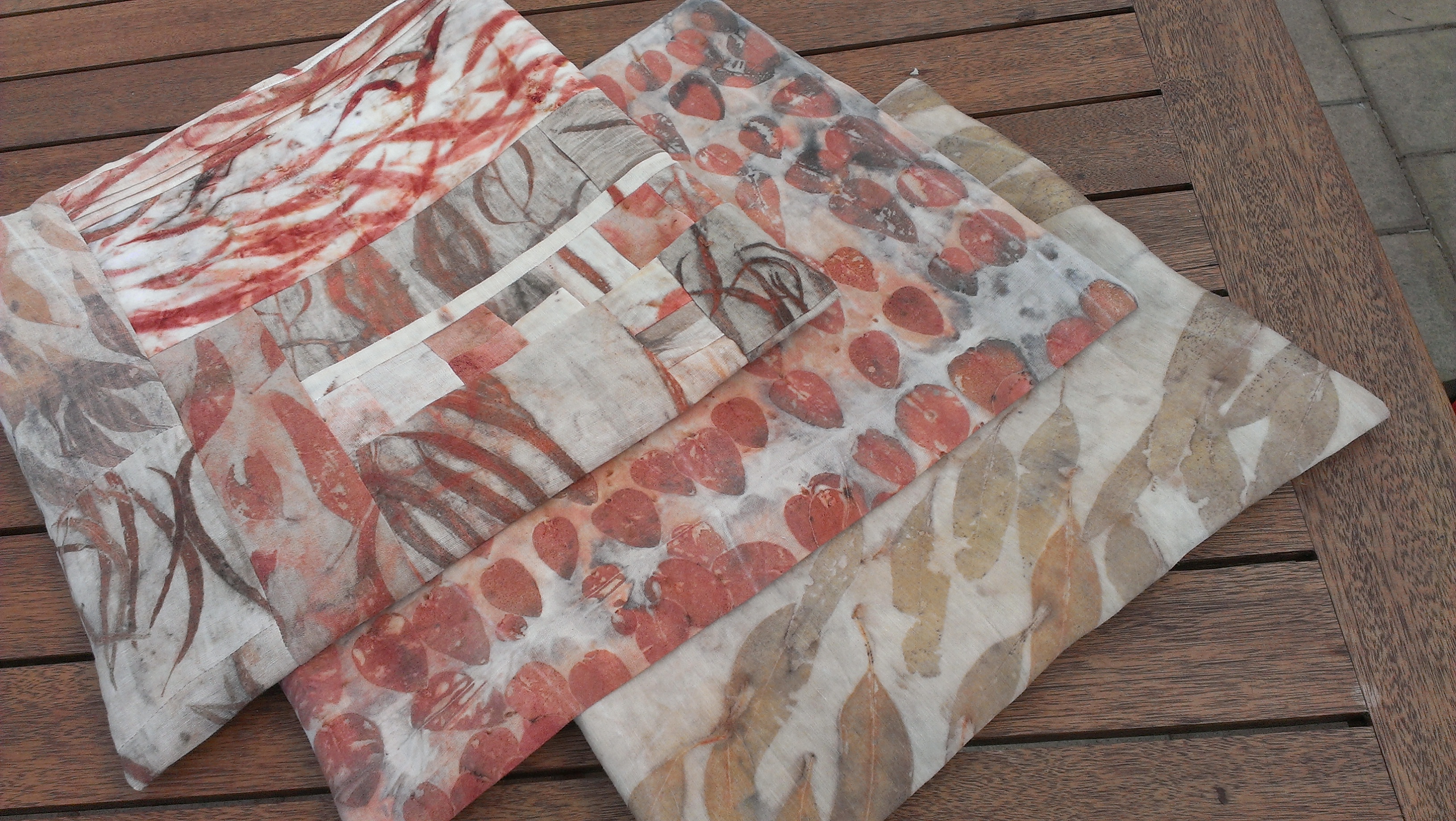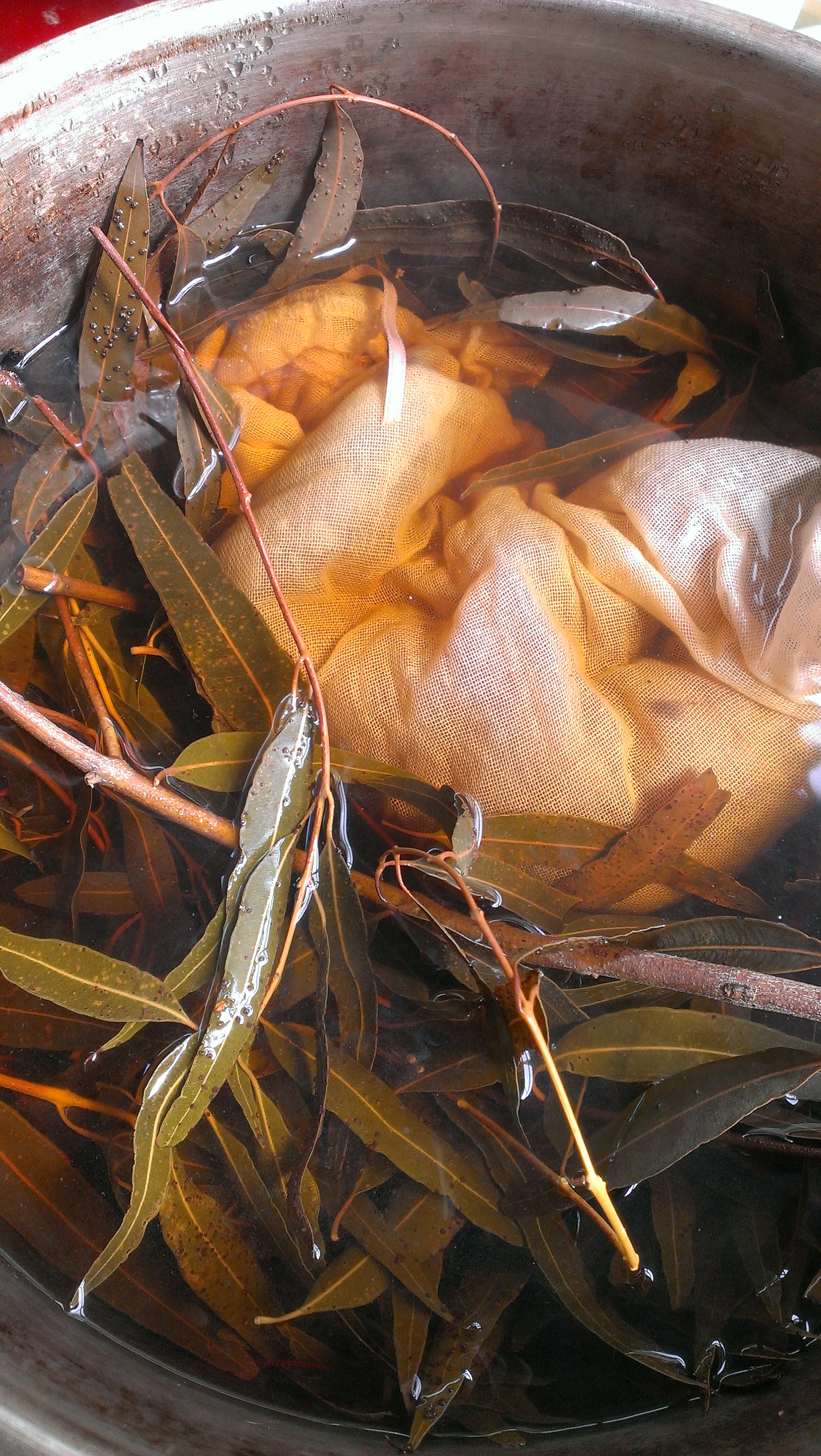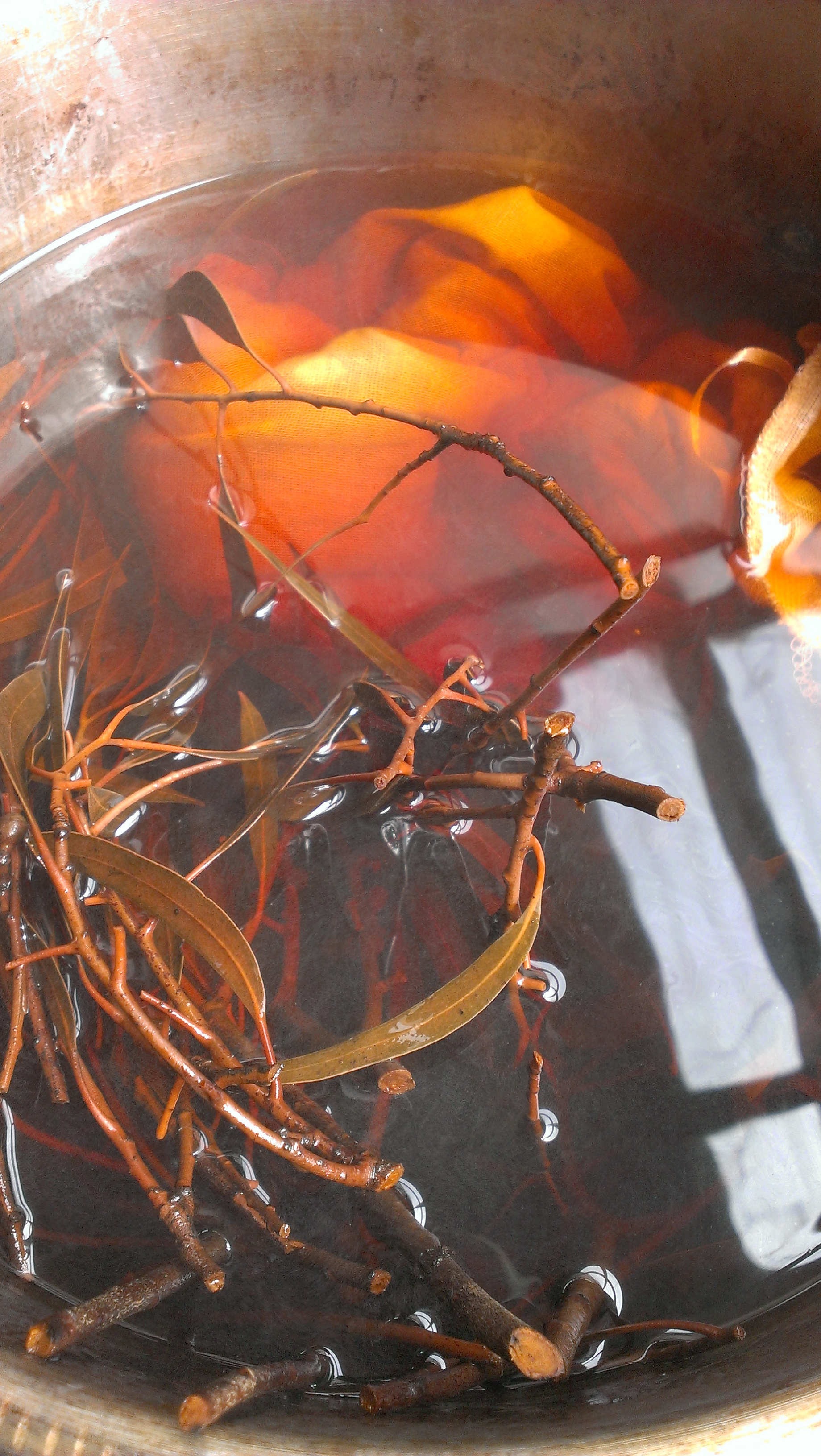 It was a day of happy experimentation, I think, the smell of fermented walnut hulls fighting it out with stewed eucalyptus bark notwithstanding. The people who came were friendly, warm and generous–a delight to be among. It was a treat to be in the company of other people who are fascinated by eucalypts and by the dye possibilities of plants. Folk were talking about what they might do with their cloth and how they might approach their neighbourhoods differently… I hope that for at least some it will be the start of an exciting new journey. By the end of the dye I was deeply weary. I took the logwood, madder and cochineal baths home with me (after taking suitable precautions against spillage) and began some exhaust dye baths next day. But by late afternoon I was down to twining silk string mindlessly and happily…