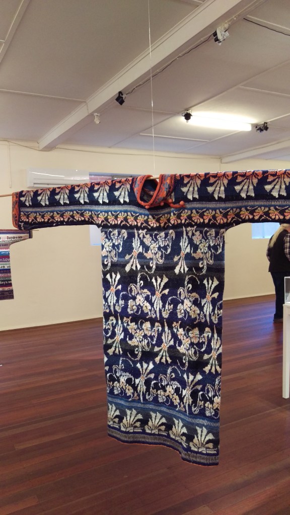 On my way home I had enough time in Melbourne betwixt the bus from Mansfield to the Melbourne central railway station and the Airport shuttle to nip out and see some of Blue at the National Gallery of Victoria.  Let it be said that this adventure involved taking my public transport courage in both hands: two trams each way and half an hour at the Gallery.  It was so worth it!  I could not take pictures.  But see images here and here and here. There were fragments of Egyptian garments from many, many hundreds of years ago.  Examples of indigo work from a wide variety of weaving and embroidery traditions from China, Japan, Indonesia, India and Europe.  At one point I was surprised to find myself answering another wanderer who was asking out loud whether something was woven or embroidered.  Clearly I have acquired some knowledge about weaving from hanging about with weavers!  Garments ranged from elaborate finery to those constructed entirely from rags in the boro style, and a rather extraordinary rain- and wind-protective cape made of two layers of cotton or hemp, with a layer of waxed paper sewn between them.  They were constructed from cotton, linen, hemp, silk, elm fibre.  If you have the chance, I recommend this exhibition highly.  It can’t help but inspire and amaze to see such evidence of the skill and ingenuity and sheer hard work of peoples from past and (in some cases) continuing traditions and to learn a little about the significance of indigo and the creation of cloth and clothing to them.