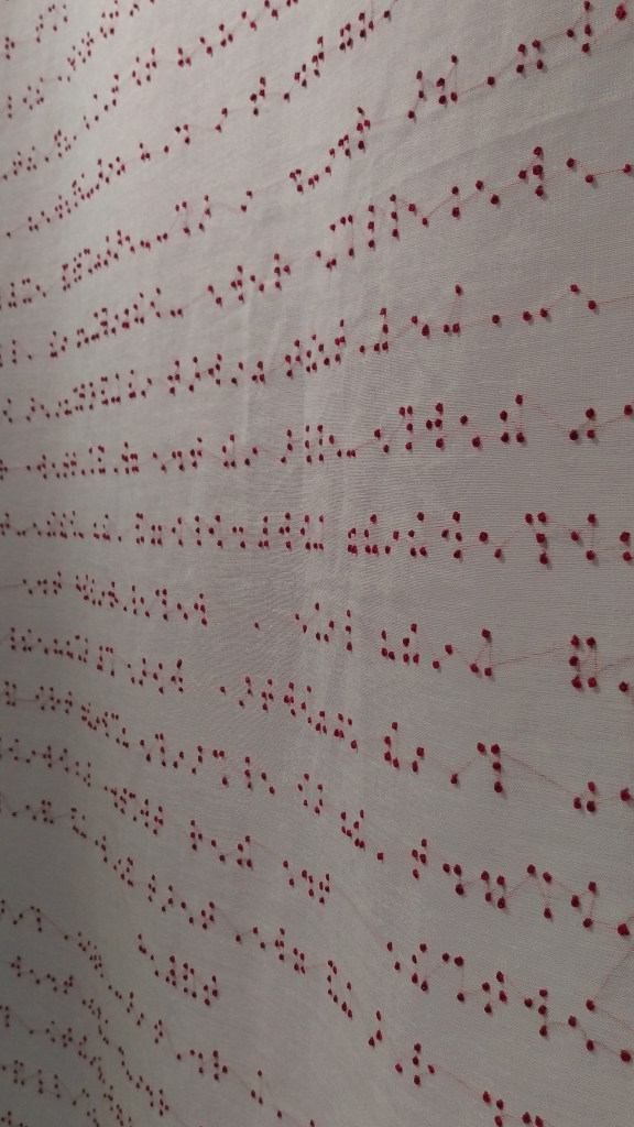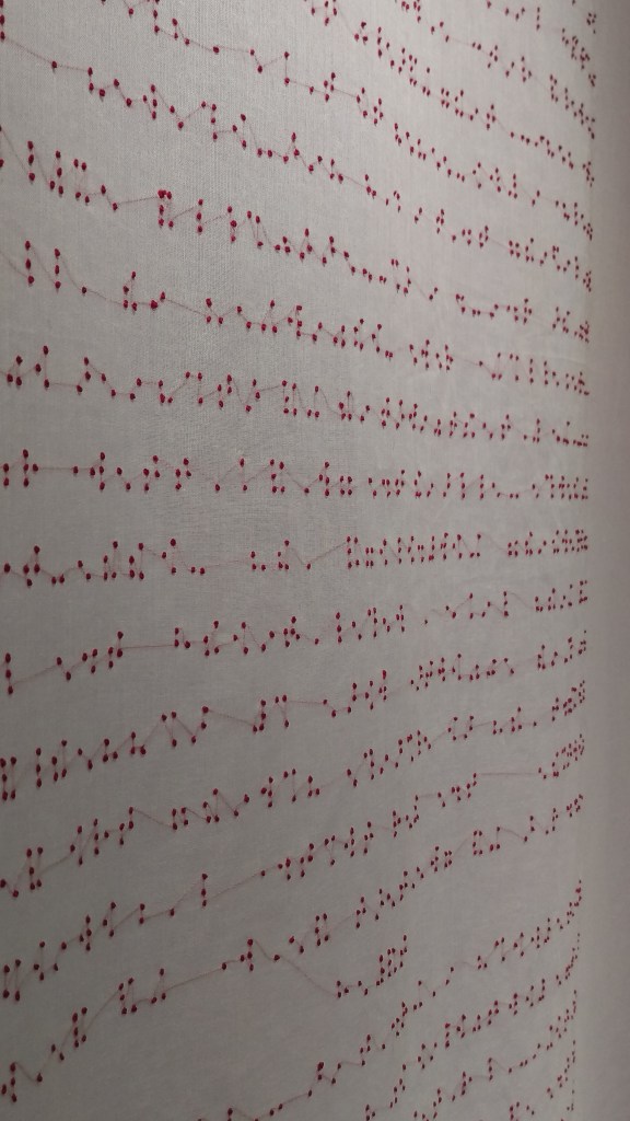 The embroidered work ‘the mysterious butterflies of the soul’ by Catherine Buddle was glorious, and moving slightly in the breeze when I saw it. It had me in mind of braille. It was mesmerising.