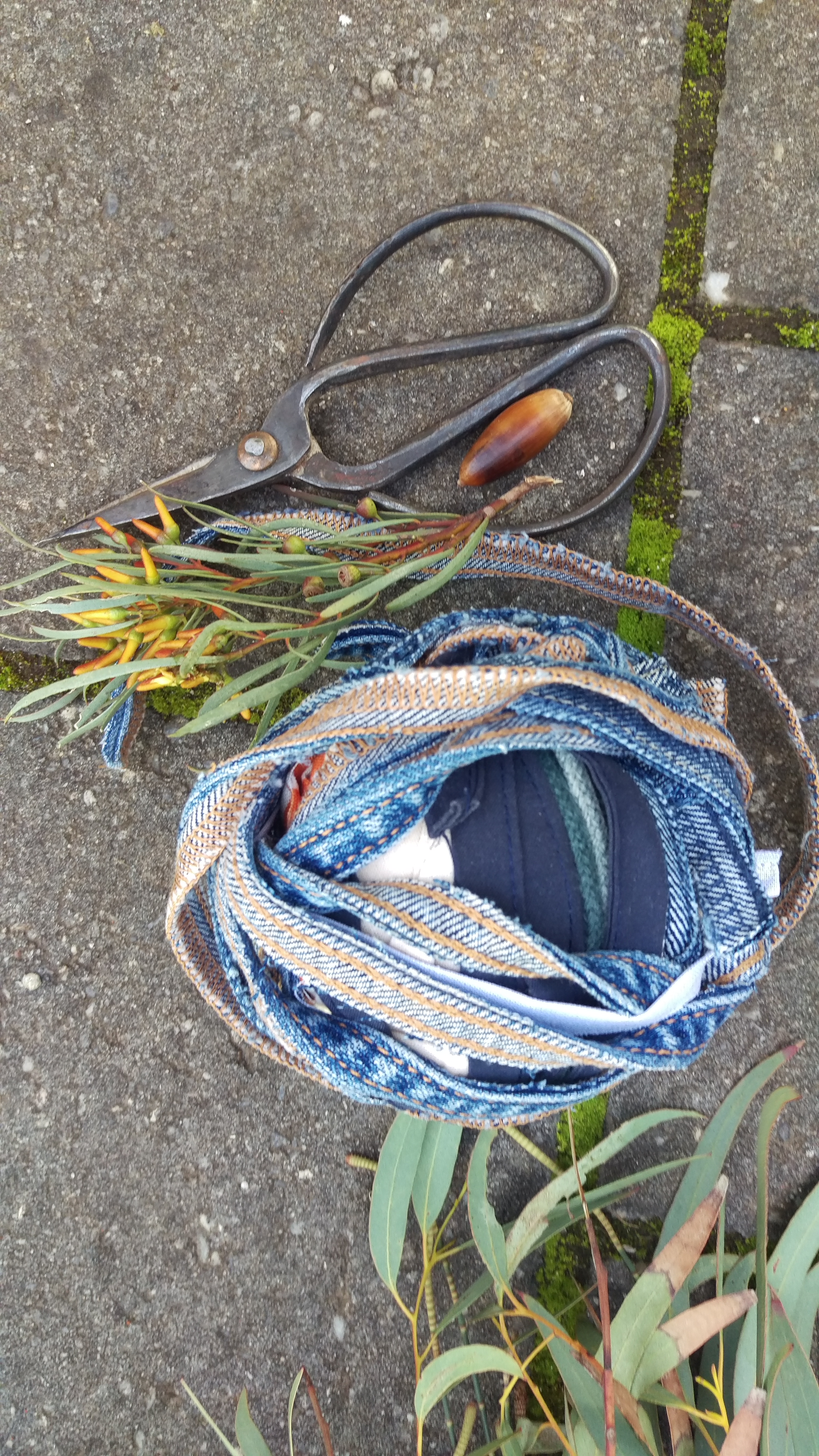 Once that was done, a second pass through the soy mordanting process, a wander around my neighbourhood by bicycle collecting leaves, and a bundle up with home made string (hems and seams left from cutting up and recycling clothing, in this case).