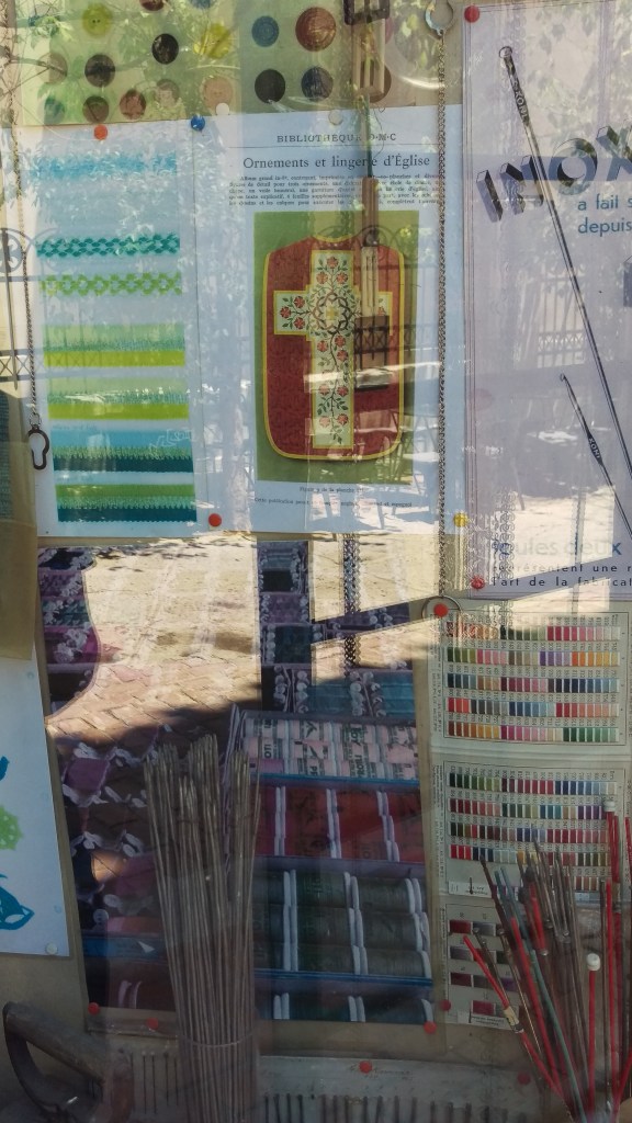 I had a quote in mind, and stitched it in: ‘a needle is a tool for reparation’ Gina Niederhumer. Then the serious stitching began… and just kept going while my beloved was having her dream holiday swimming 5 km every day and I was often spending time sitting on a boat. It’s a funny thing. I have never fancied embroidery, and undoubtedly, this is embroidery of a type. And yet, I just kept going and going. At first, with threads I’d dyed (and some undyed too). And after I’d cruised a lot of plausible looking places in Athens, I finally found a really old fashioned haberdashery. And did not take good images of it! I could not find a way to ask the women running the shop if that would be OK with them, and it sure was sunny outside. I could have spent hours in there but my enthusiasm tried the patience of others… I came away with single strand cotton thread in two colours.