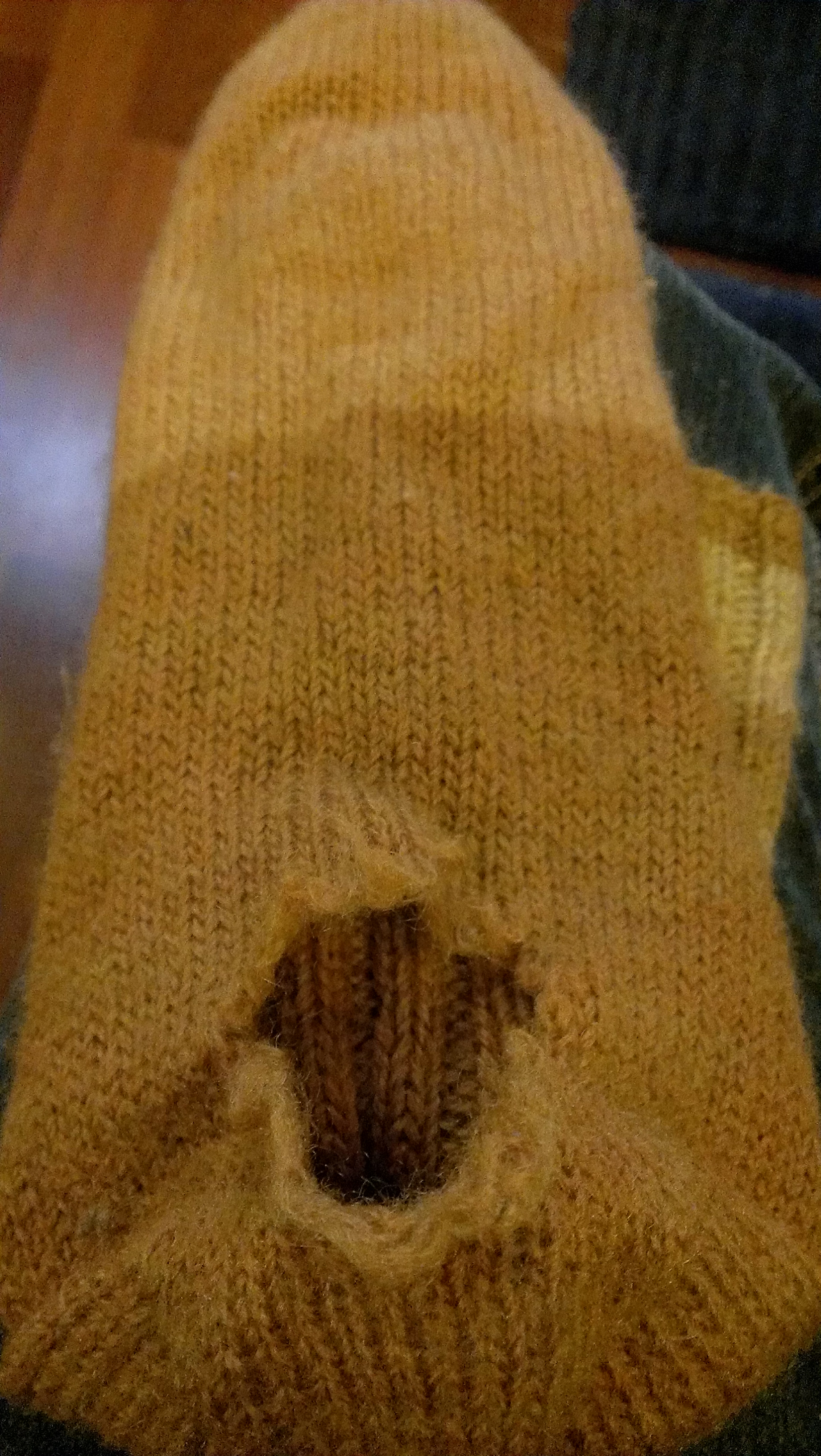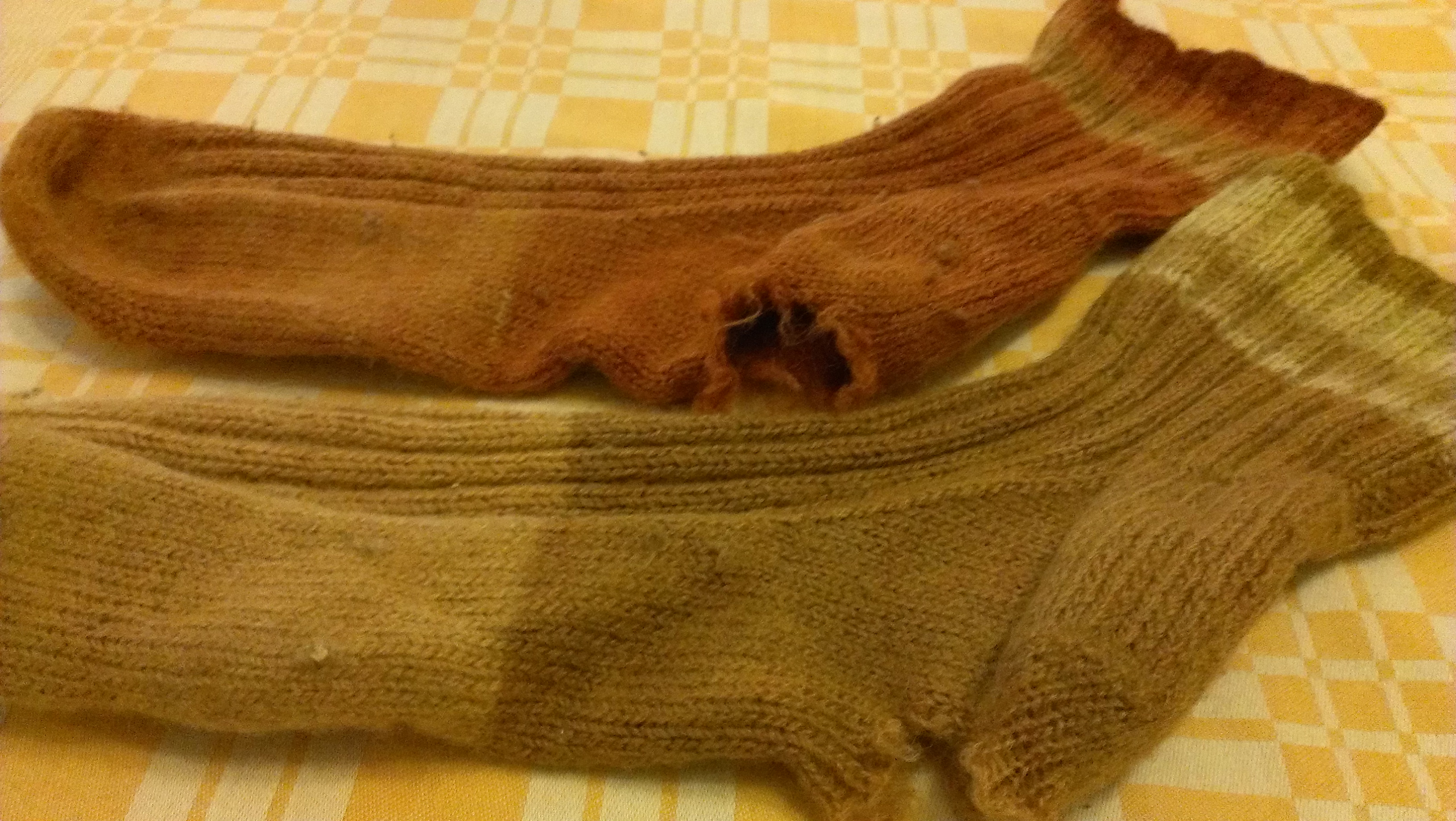 The stripes at the tops are all my samples for the previous period–a metre or two of yarn dyed with samples of local eucalypts and other plants. The rue dyepot was the worst ever–but a triumph of neighbourhood cooperation involving a rendezvous at the local train station where my friend handed a bag of rue prunings out the door and I stood there ready receive them as he continued on his way on the train relieved of his pungent burden! One of the socks is all in orange tones and the other tans and greens. Rue. The ordinary kind does not give red, my friends, take it from me (or sort me out if you know how to get red from it–seems like there is a Siberian kind that might give red–but only from the seeds–or some such). I digress. These socks have been worn a lot, which is very flattering, and my heart’s friend wanted to keep them, though perhaps only for in-slipper wear. We consulted about whether it was feasible to darn these holes. I wasn’t sure. He can darn but has not kept up his knitting skills in a period when carpentry has been needed more at his place.