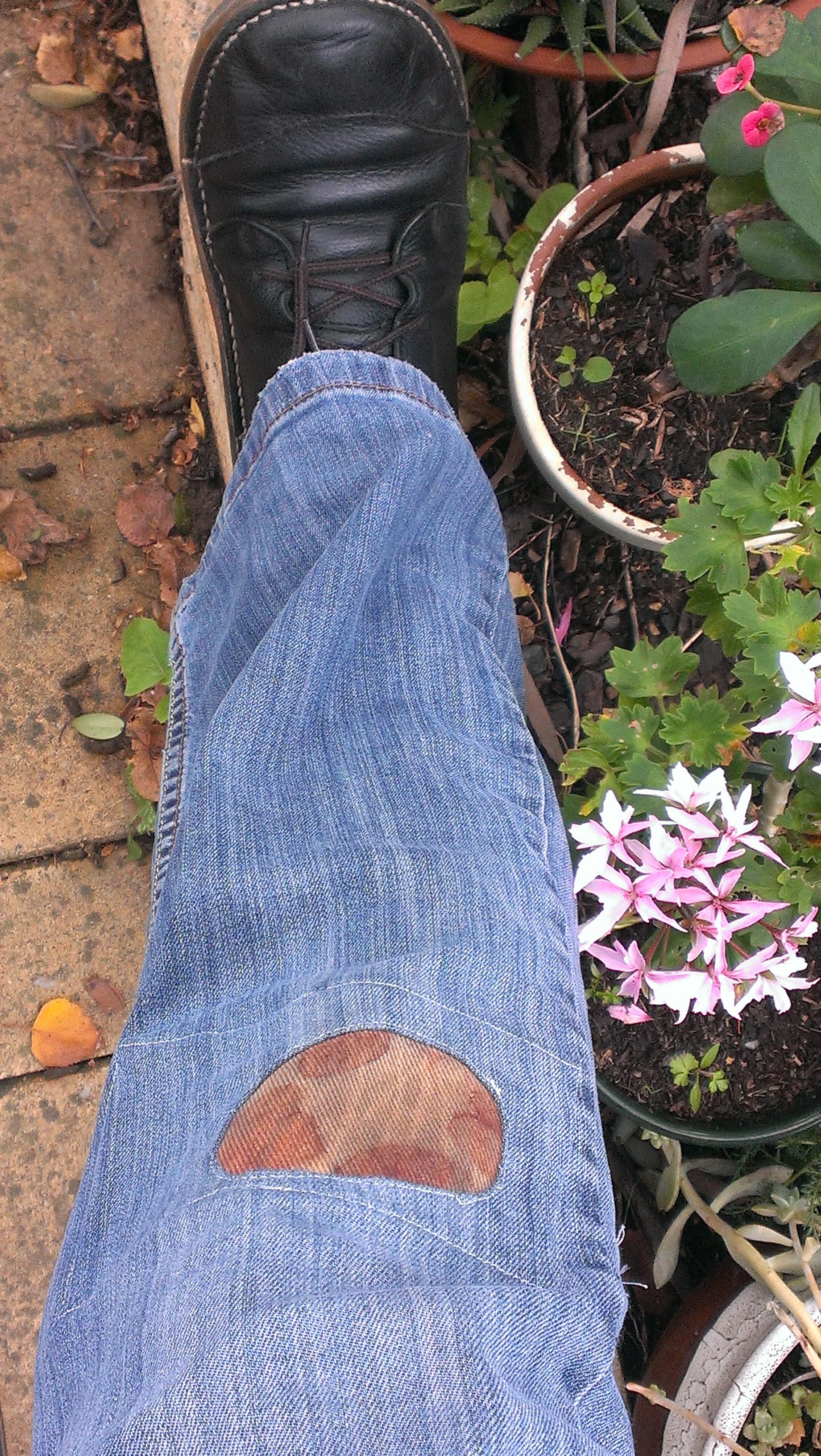 Apologies for the indoor pictures on a rainy day–but here is the patch, being a mend on gardening jeans, in the garden, with the sun out, however weakly!