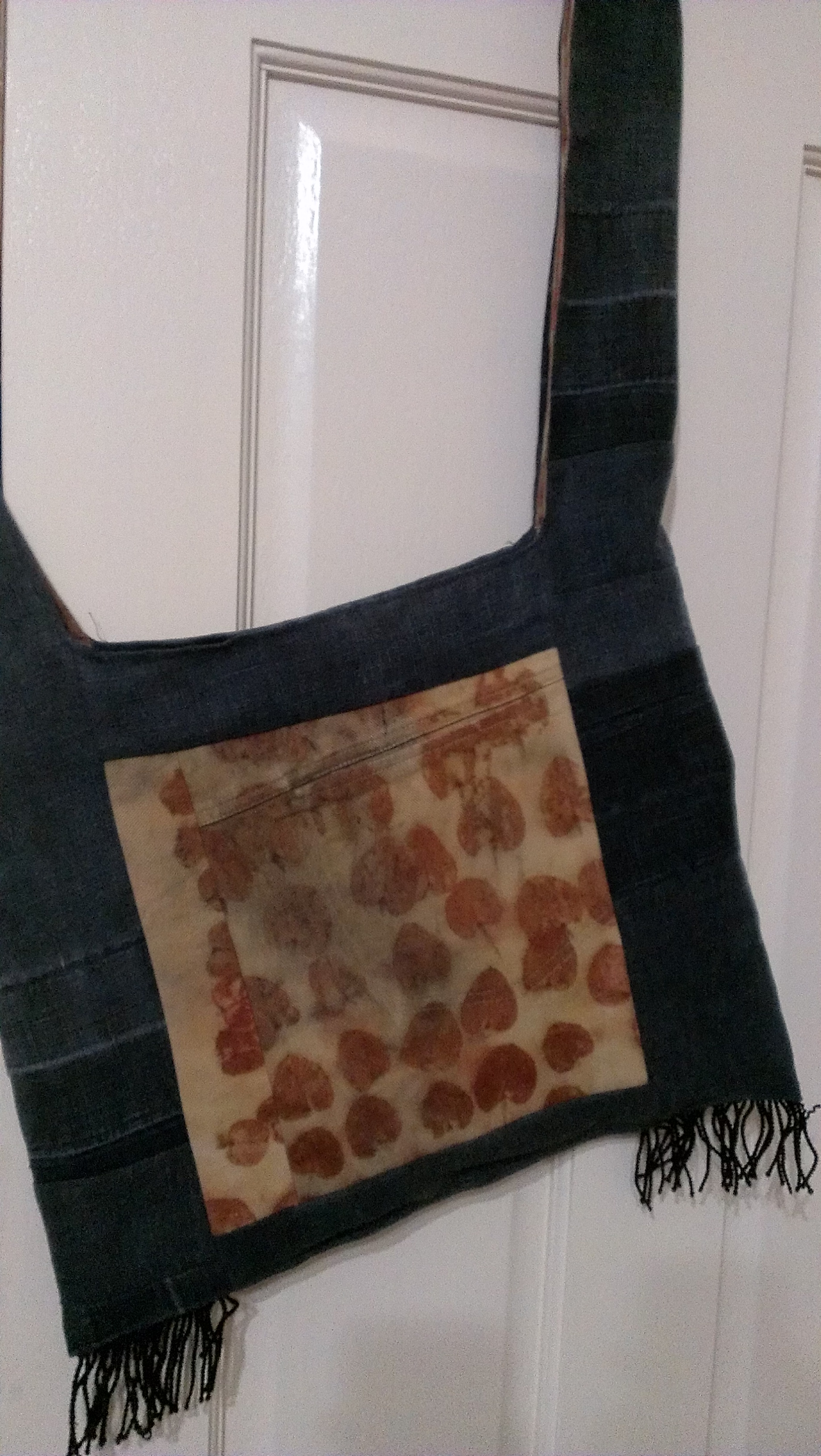 Choose a nice patch. This one was once part of a pair of cotton twill pants and is now eco printed with E Cinerea leaves. Trim back the hole to some solid fabric, and shape it. My mother taught me this mend and always created a straight sided shape, like a rectangle. I decided to try something rounded. Put the patch on the inside, and turn the edges of the jeans under all around, attaching to the patch fabric. Tacking would be a great way to proceed, but I prefer pins. Call me a daredevil!