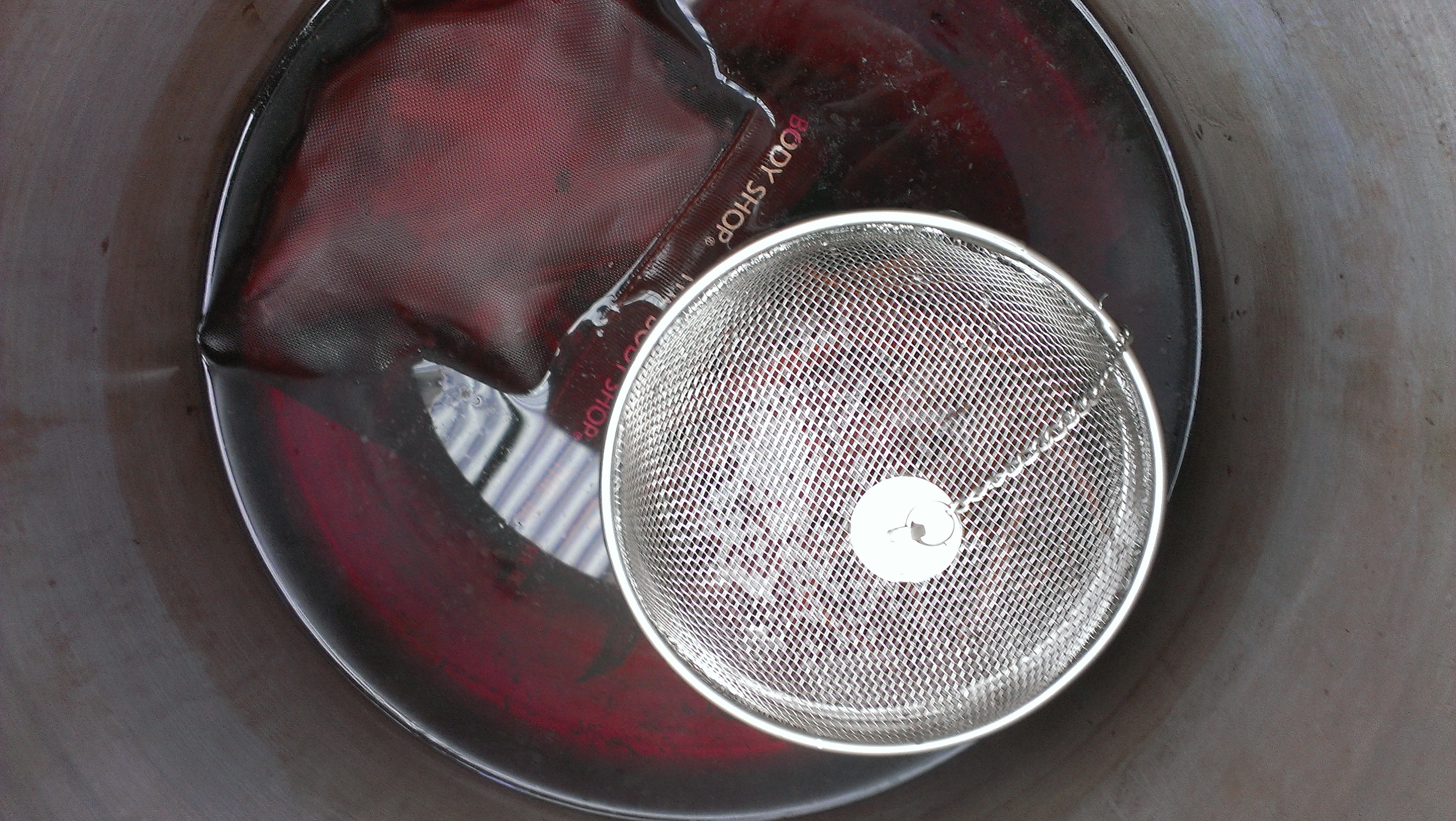 I have the biggest chips in a little zippered mesh pouch that must once have held toiletries.  The smallest chips/splinters are in something that looks just like a giant tea ball.  I saw it for sale in a Vietnamese grocery where I was investing in greens, seaweed and soy products and immediately saw its possibilities.  The woman who sold it to me had an eye-popping moment (evidently she hasn’t sold one to an Anglo before), and asked me what I was planning to do with it.  I love those moments in Asian groceries, because once I’ve been ask the question and given my (admittedly bizarre) response, I can ask about the ordinary use of the device or food in question.  This one is usually used to contain whole spices when making a big pot of stock or soup.  This point was helpfully illustrated by a packet of soup seasonings–star anise and cinnamon and coriander seed were some of the spices I could identify right away.