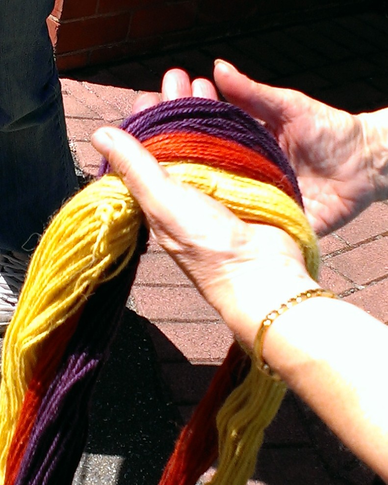 There was a pot of logwood that came out so deep it was virtually black.  There was a pot of E Scoparia bark that gave some burgundy on the first round and some tan for a skein added in later.  There was an E Scoparia leaf pot and an E Cinerea leaf pot–oranges of different shades.  The dye room at the Guild has four gas burners as well as the copper–so we went wild.
