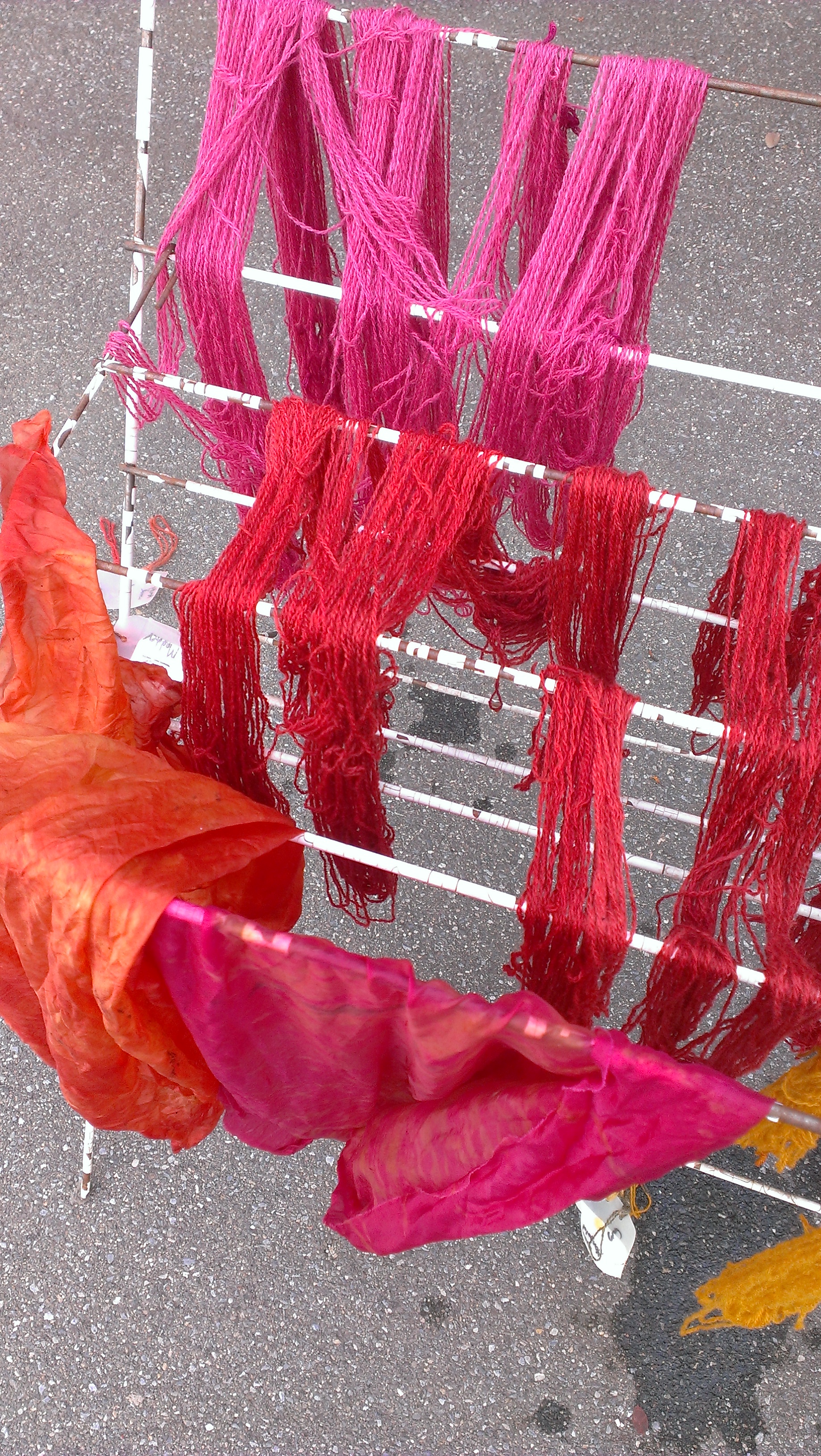 It was overcast and the results of the dye vats which were the focus of the day are seen here in all their glory drying in the Guild car park! These are eucalyptus and logwood.