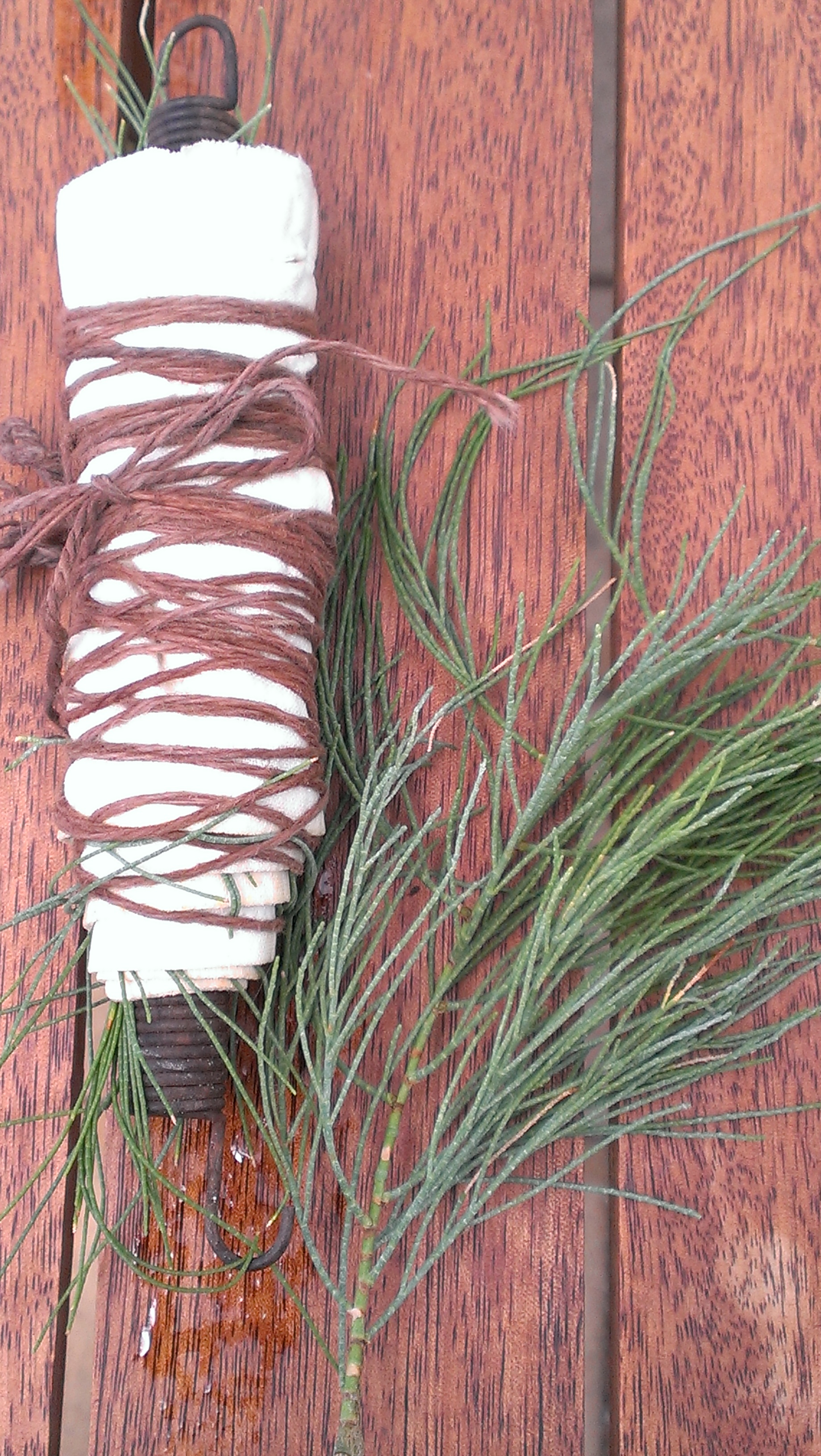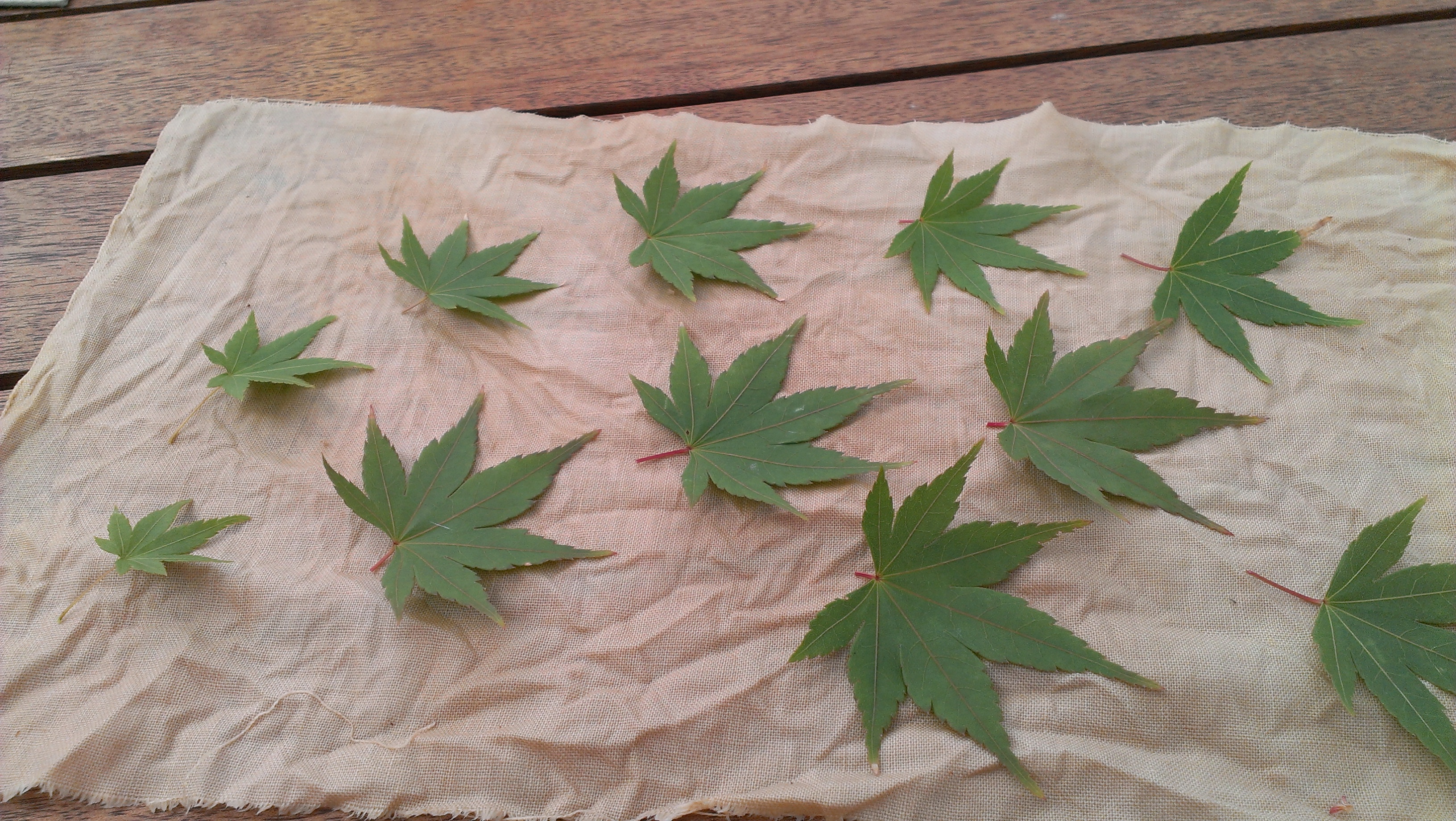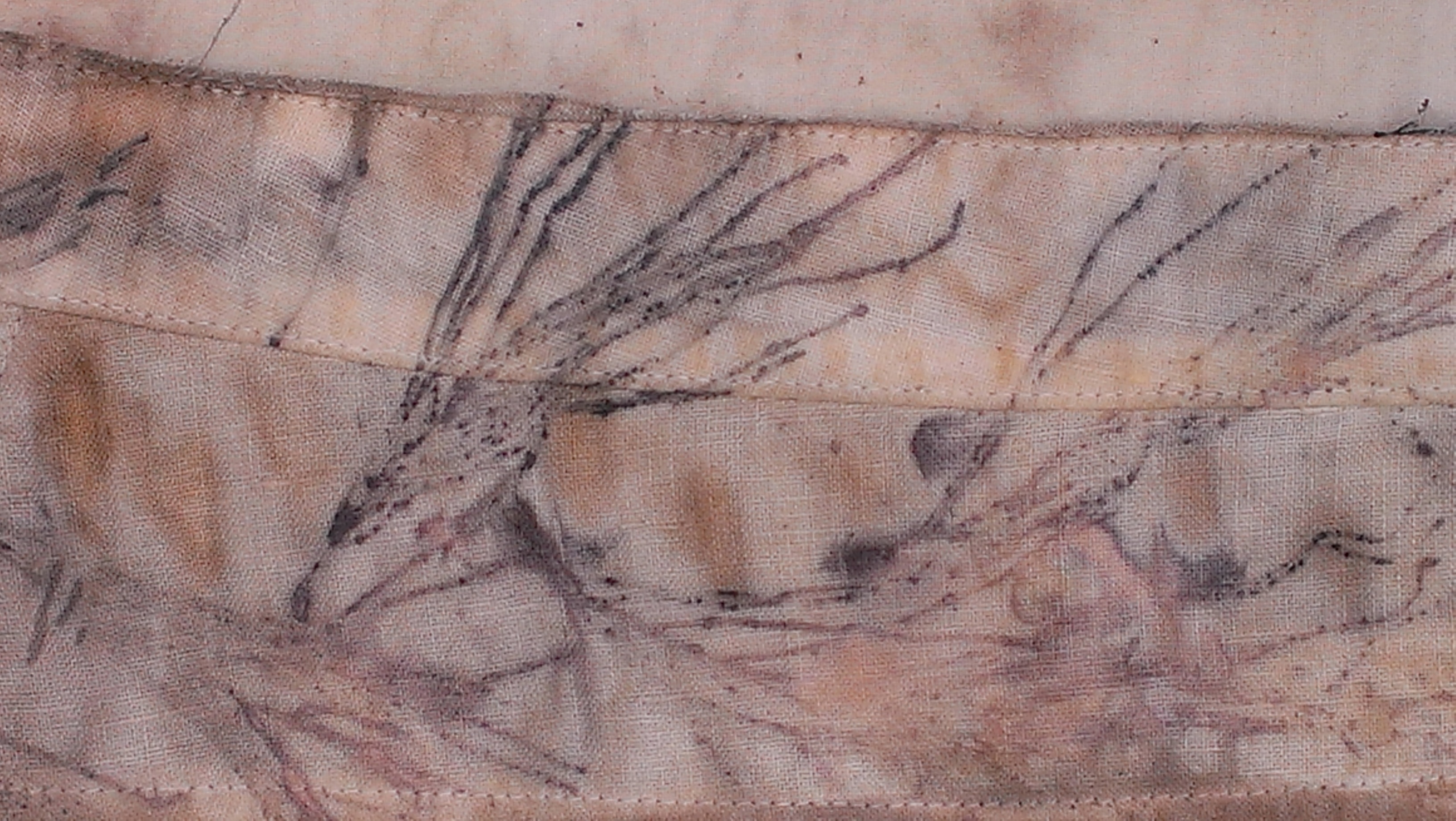 This process really made me think that when I run my fingers through the choices at a garage sale or op shop, I see something that could be taken apart ready to begin again. Where I see a shaped garment that could become flat pieces and then from flat pieces be converted into something else, India seems to me, to see one three dimensional thing that could become other three dimensional things. While we were working in Crockett Cottage, she was taking two pairs of men’s trousers and turning them into one long, glorious skirt of many pockets. It was a thing of wonder to behold this process, let alone the insertion of a silk lining. There is a sample of the finished glory here. Below, a garment made from hemp and cotton knit and the sleeves from the linen short that became a frock, with sheoak leaf prints.