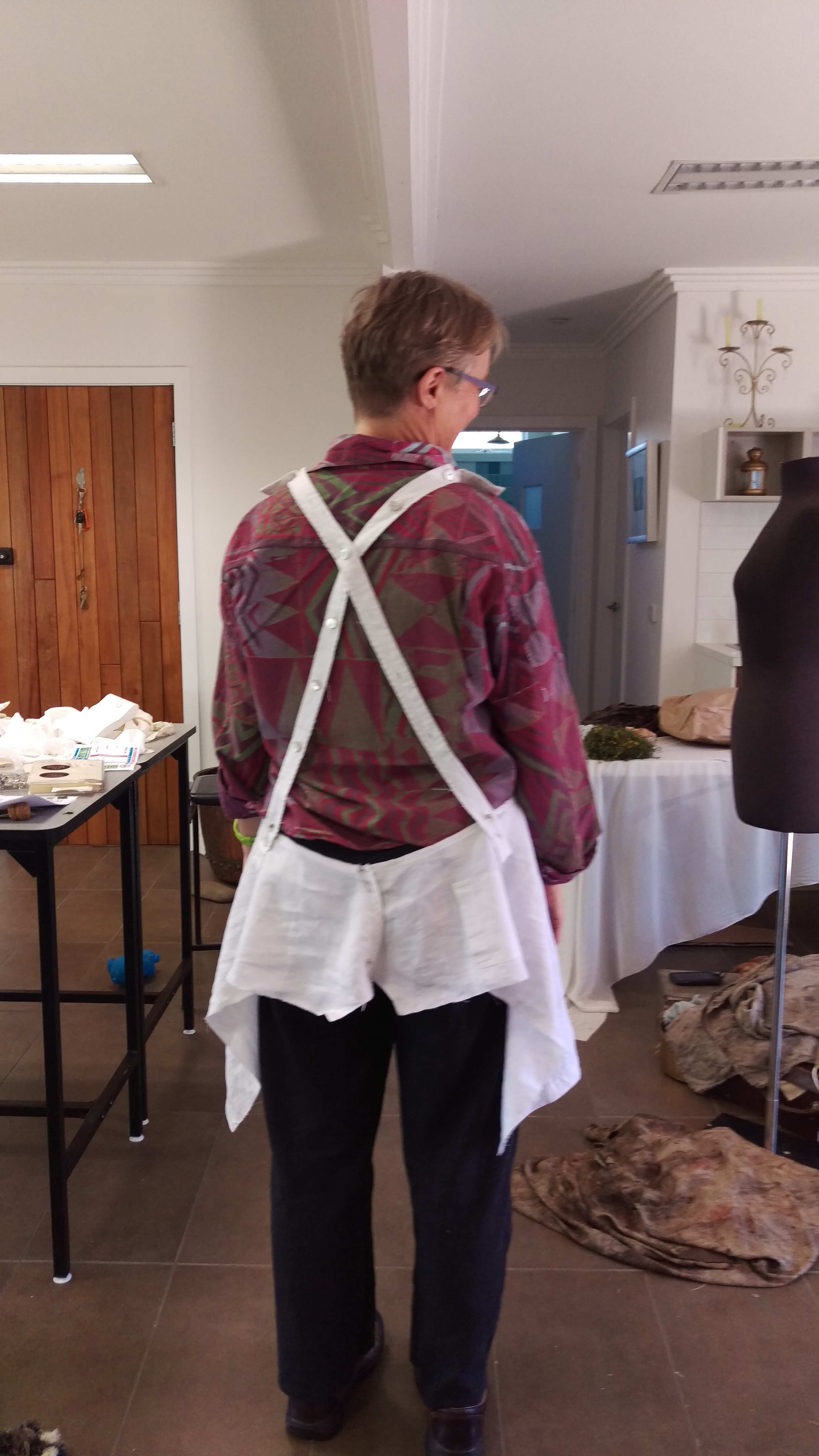 Well. The thing is, a learning experience is about expanding your mind. Even if you can feel the strain! So here I am modelling a linen shirt from the op shop, in the process of becoming–an apron? A frock? I thought apron, but by the time it came home, my beloved felt that it was, essentially, a frock. I can’t say she’s a real expert in frocks, but she has an opinion. I am continually being struck by my own inflexibility about what I’ll wear. I have courageous moments of branching out, but I am just nailed on to some core concepts. For one thing, when India thinks of an apron, she thinks this (you’ll have to scroll down, but Sweetpea’s blog is a special place, so don’t hurry over it). When I think of an apron I think of a rectangle of black cotton with two tape ties. I have two, and have had them since I was making my living cooking, long ago!