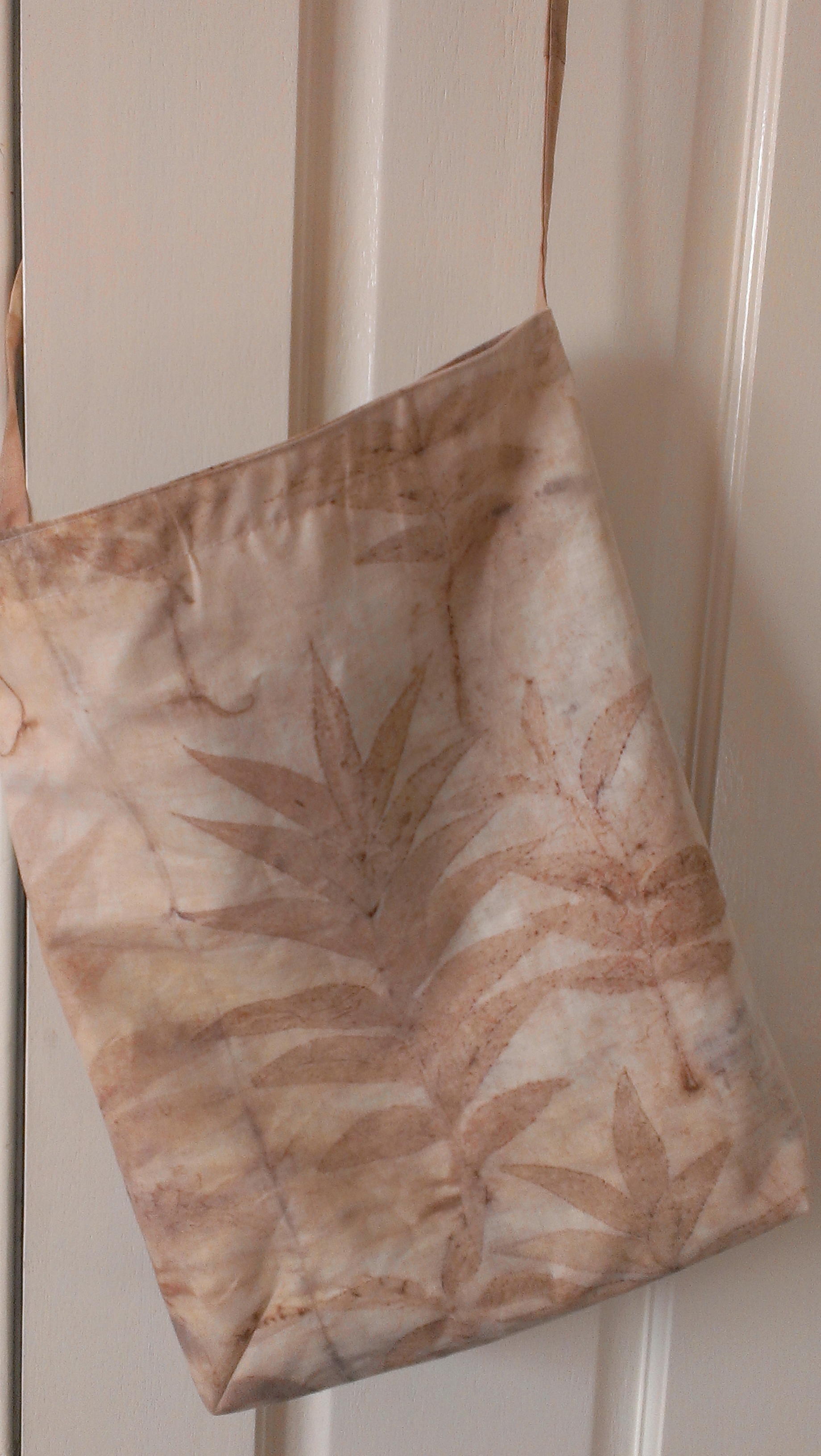 Some time ago I acquired some pecan leaves from a tree grown by my friends. They were always destined for the dye pot! Some prints turned out crisper than others, but overall I loved these prints. They were printed onto leftovers from a skirt lining and some other plain cotton fabric I bought at a church fete… it clearly had a weaving defect of some kind that meant none of the selvedges and none of the grain in the fabric ran straight. Best not used for clothing, perhaps, but I have had a great time taking it from plain white to all kinds of other treasures.