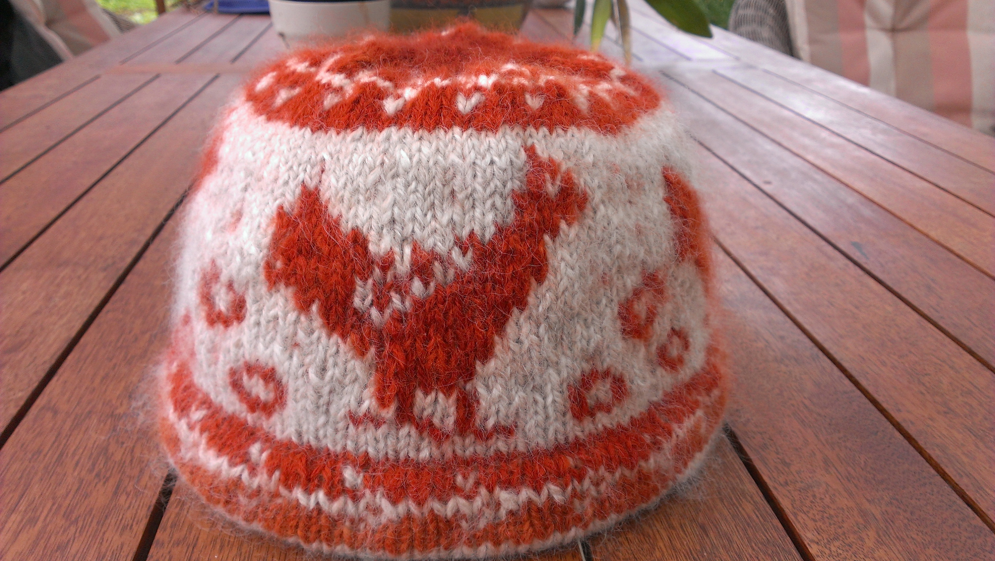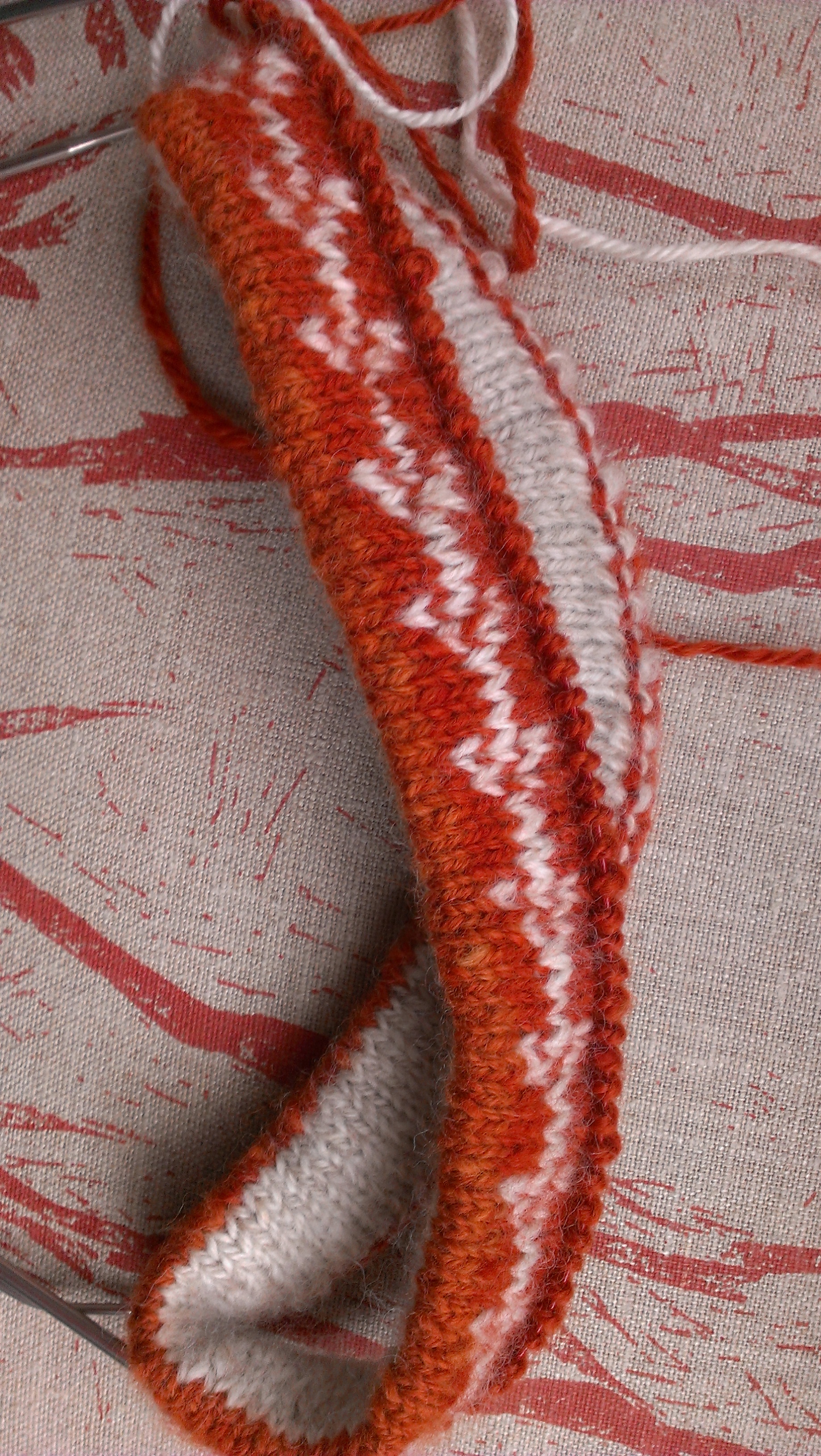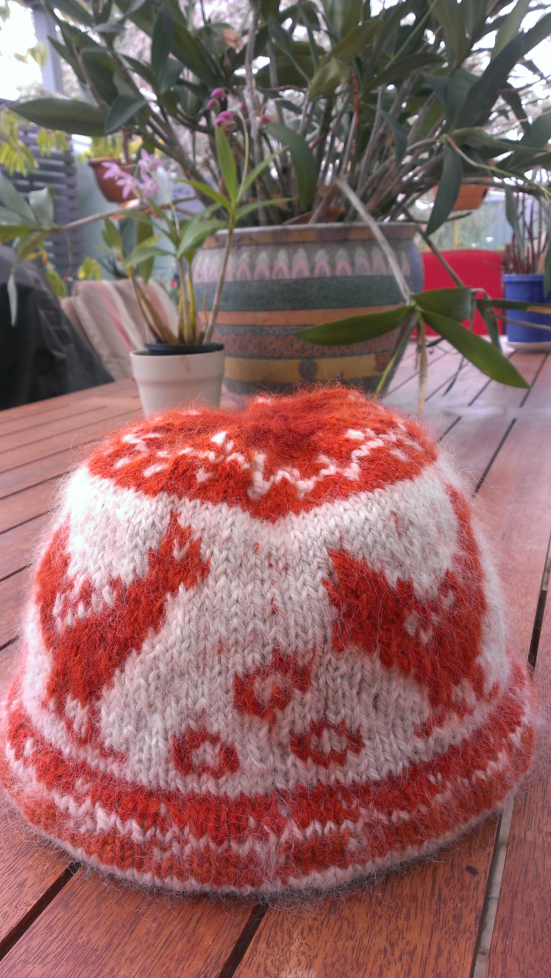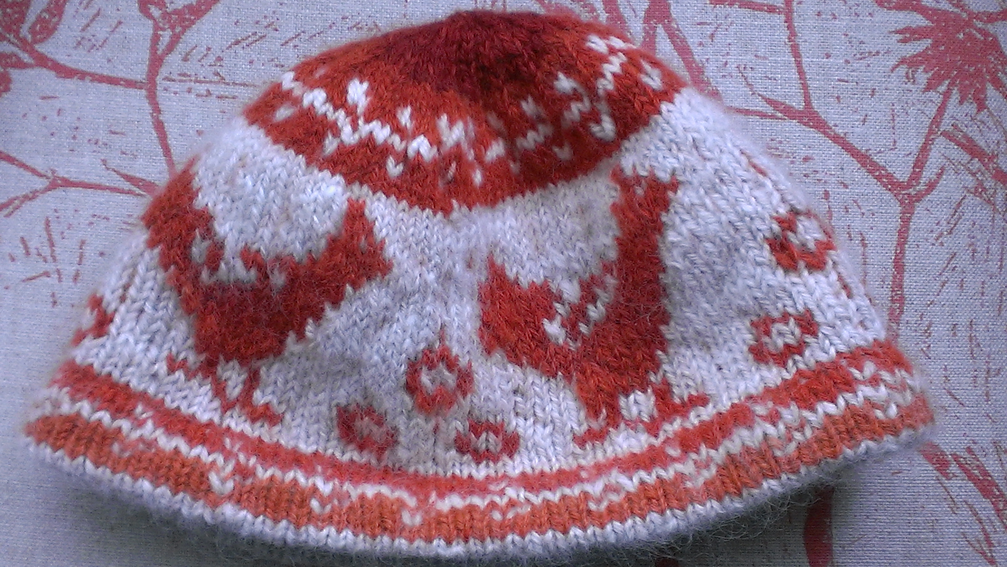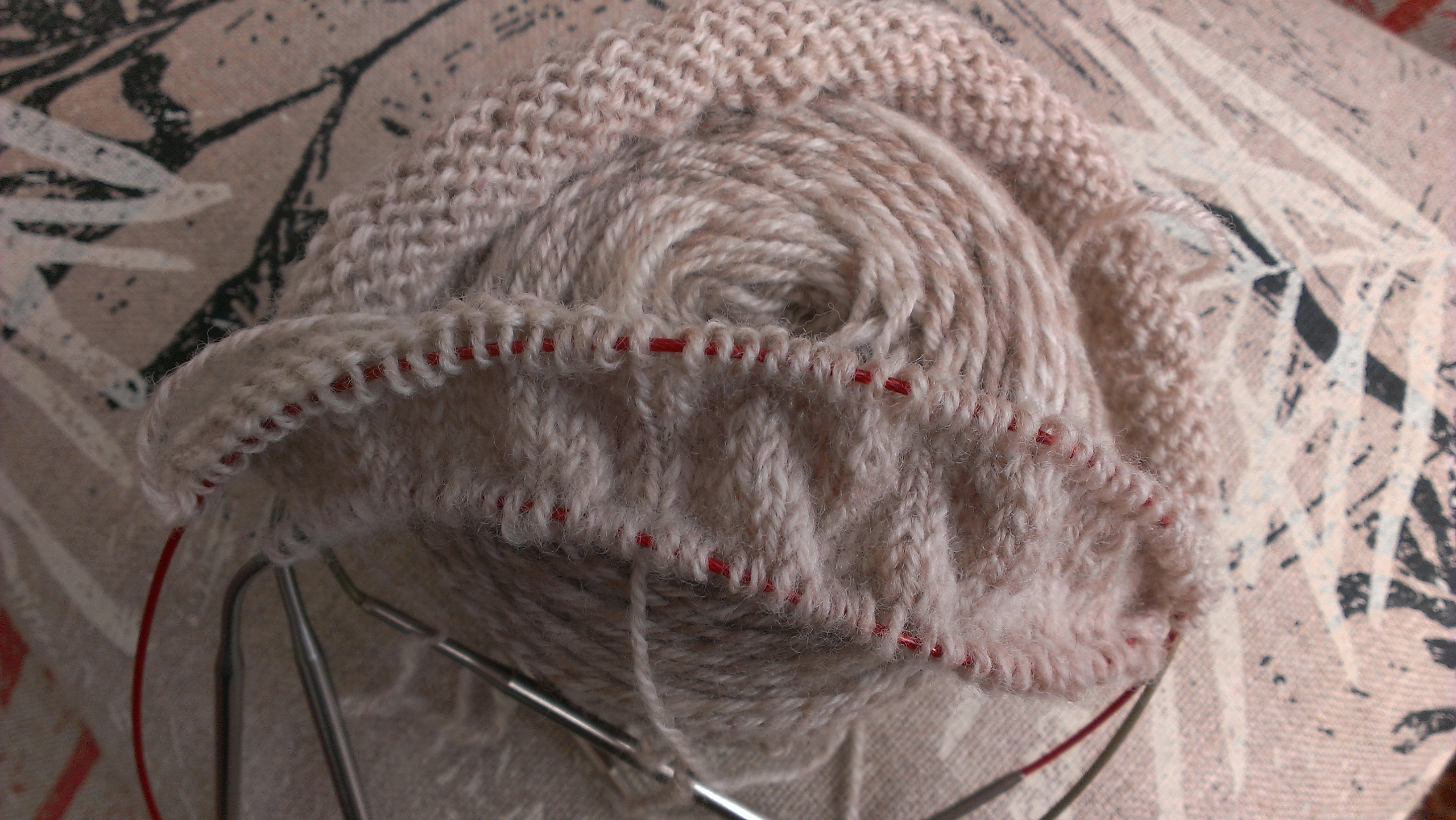 It is rather fine, but I decided to knit a hat anyway and settled on one from Barbara Walker’s Knitting from the top, which is more of a concept plan than a pattern. Perfect for handspun. And then it turned out I could use the DPNs a friend surprised me by giving me a while back (I had helped her out with i-cord, and it was sheer pleasure, but I think that may have triggered the gift in some way). They are a rather unusual size, delectably pretty and perfect for the job.