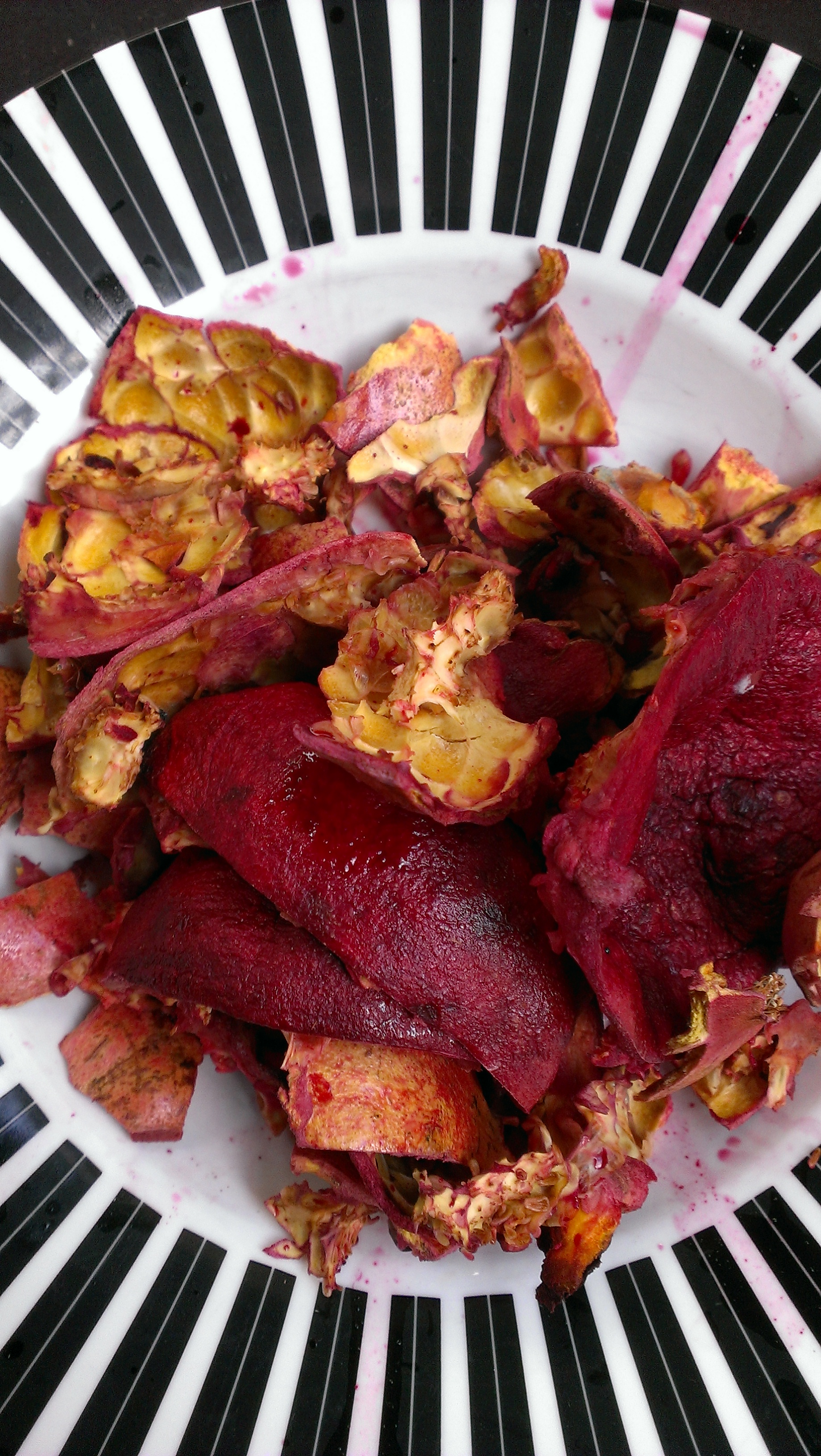 As it happened, this was the same day I made a delectable juice from the last of the season’s pomegranates. Years back, I noticed just one pomegranate tree in all the streets of the neighbourhood where I walk that never, ever, had a rotting fruit fallen underneath it. The tree was always in superb condition–clearly loved, tended and cared for by knowledgeable people. One day I found the people from that garden in the front yard and asked what they did with the fruit, because at that point, no one I knew had ever served them up to me (all this has since changed). The man I asked went into the house and brought me out a sample of the pomegranate juice he had made for his dinner guests! And then explained how to make it by releasing the jewel like seeds from the skin and then putting them in a food processor and straining the results. So. That’s how I had used the fruit. And this is all that was left.