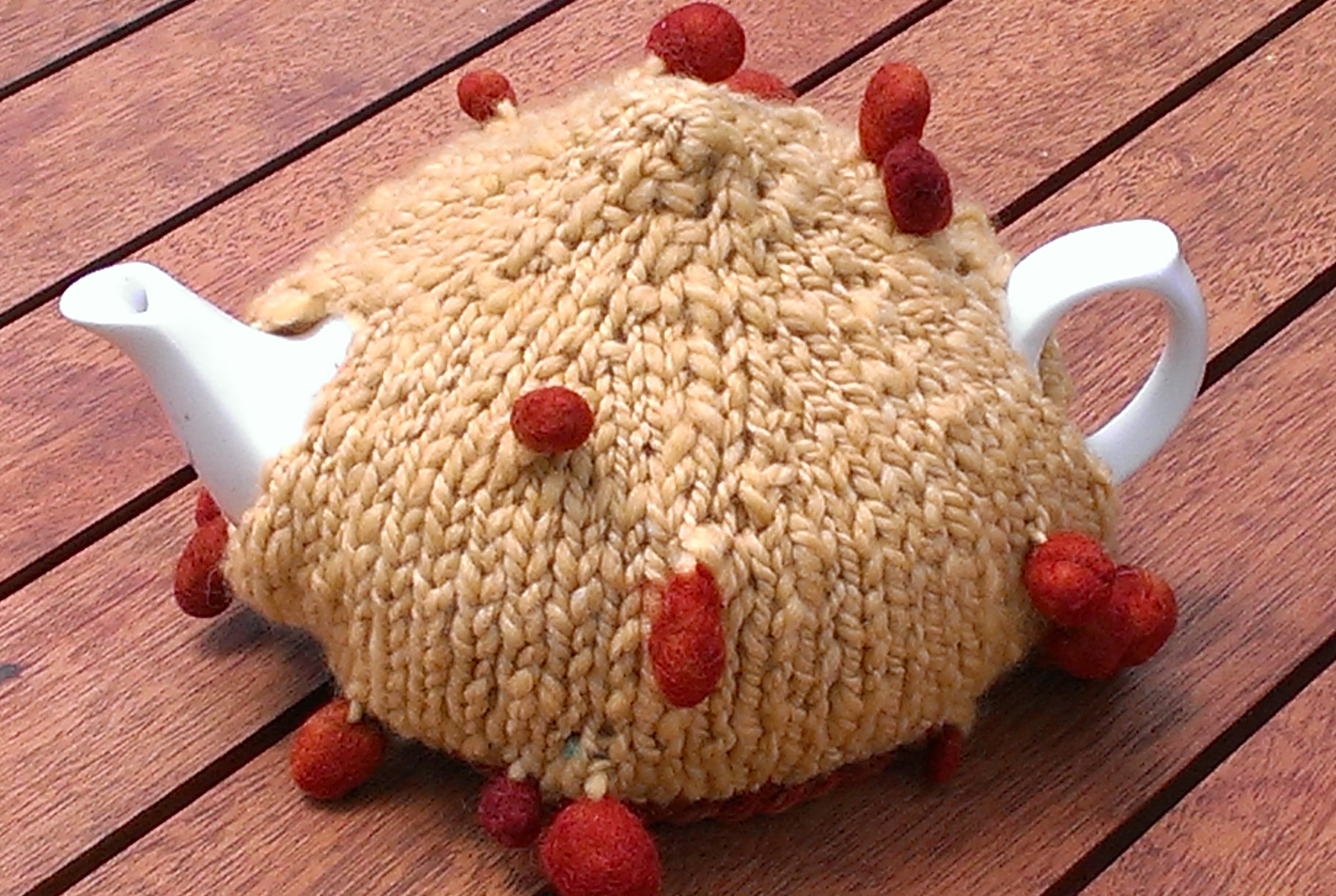 Let it be said that at present coral punk is not alone.  Here is the present plain Jane of the tea cosy selection at our place: yellow from silky oak leaves and orange from eucalyptus–with the felted blobs spun into the yarn.  Pattern improvised.  Luckily, tea pots are just not that fussy about how you clothe them.
