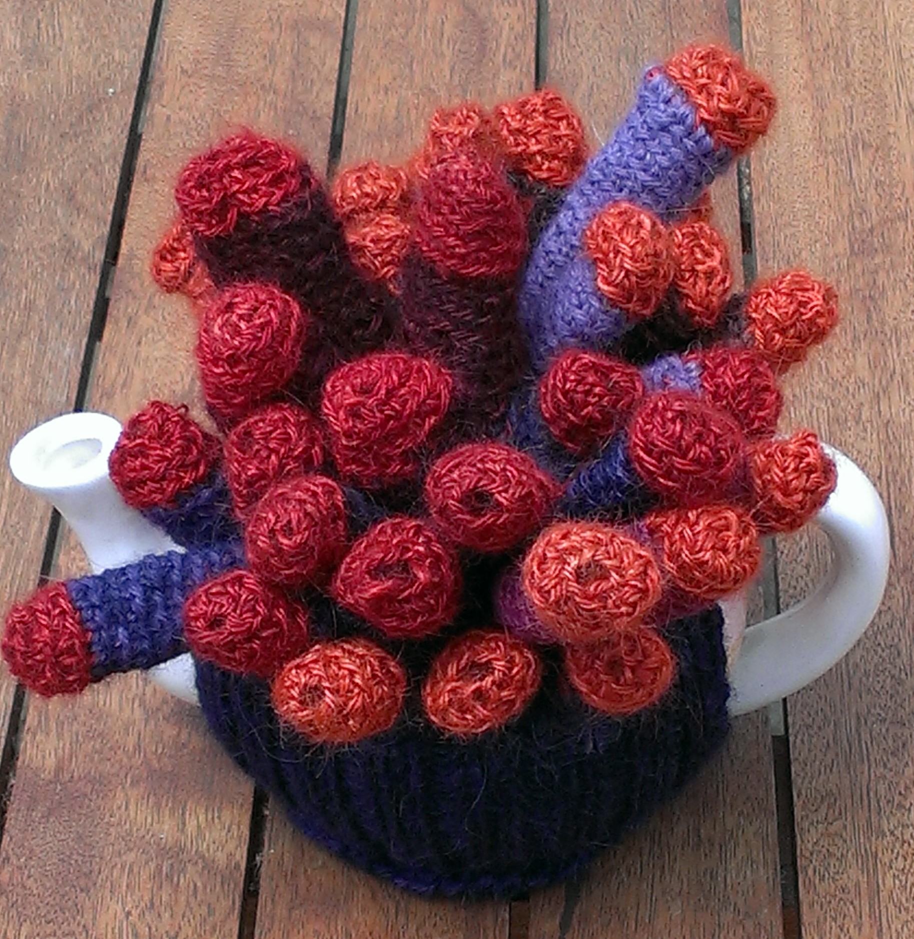 I’ve been branching out and using up some particularly strange art yarn spinning experiments.  This next one is commercially dyed mohair with silk curricula cocoons spun onto it.  Scratchy for a head, perfect for a teapot!  I was surprised how many people liked the look of the ‘hat’ emerging as I knit this at a picnic, riffing off Funhouse Fibers’ Fast and Fun Cozy.  Once again, that is to say, dispensing with the pattern when it became inconvenient.  I guess the hat admirers hadn’t felt the yarn yet.