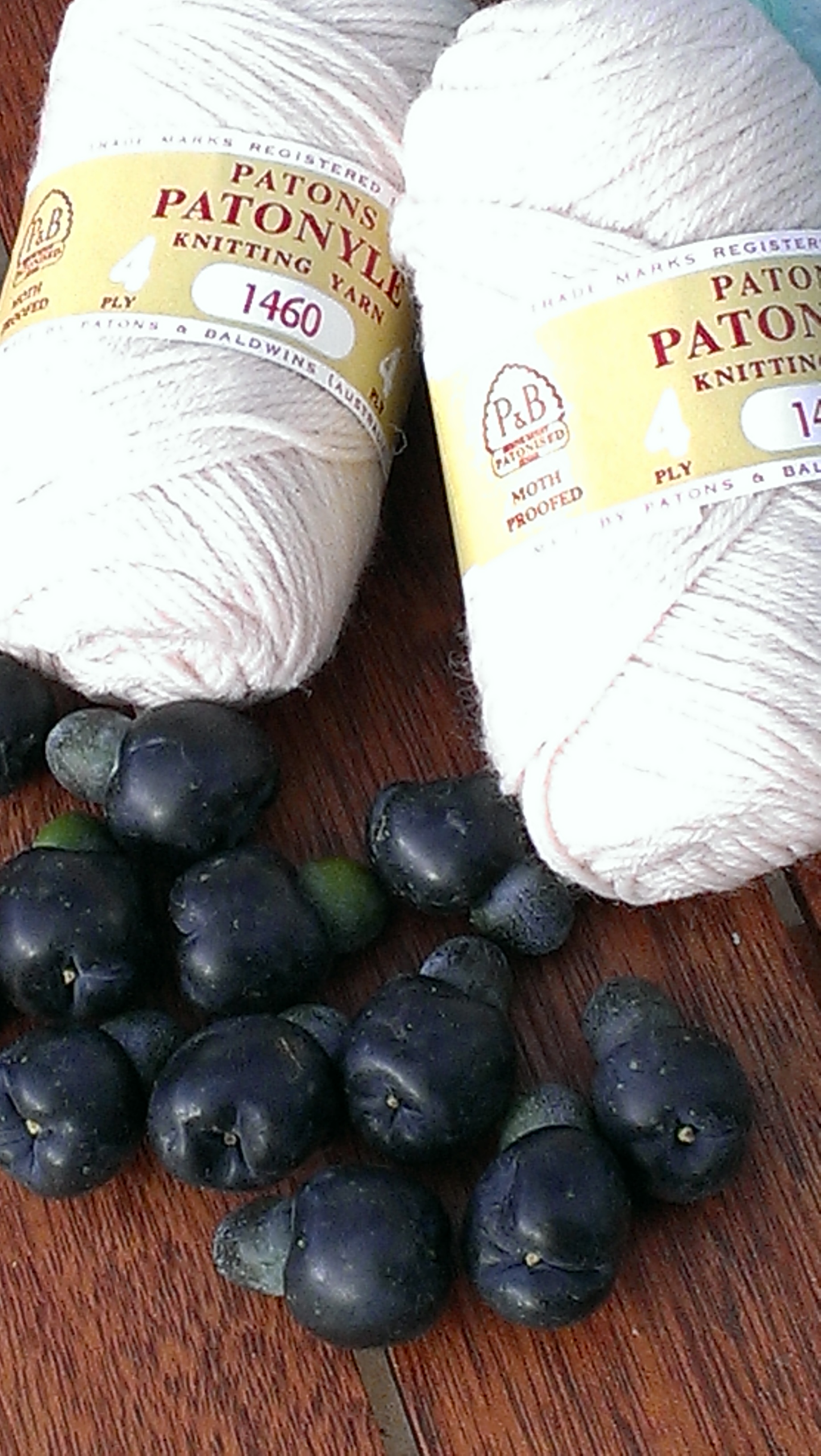 Having had success with a test dyebath, I made a point of returning to Botanic Park to collect more fruit on weekend, en route to celebrating World Wide Knit in Public Day.  I dyed some grey corriedale locks in my test bath and they went from grey to a dull brownish shade, so I opted for superwash + alum and silk as the most likely candidates for success. I mordanted sock yarn of antiquity (picked up at a garage sale) and prepared another dyebath.  I regard sock yarn as a no risk option.  If I knit socks for a friend, I can make an open offer to re-dye at any point they fade to an unacceptable shade (and I can ask how they’re faring under normal wear and washing).