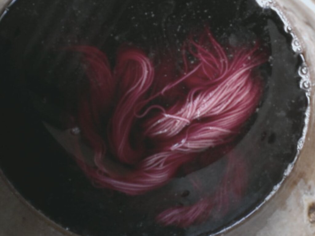 I tried grinding the soaked madder in a blender as Rebecca Burgess suggests (the second hand blender was pretty challenged) and here it is in the dye bath, in its own stocking… we got some lovely reds.