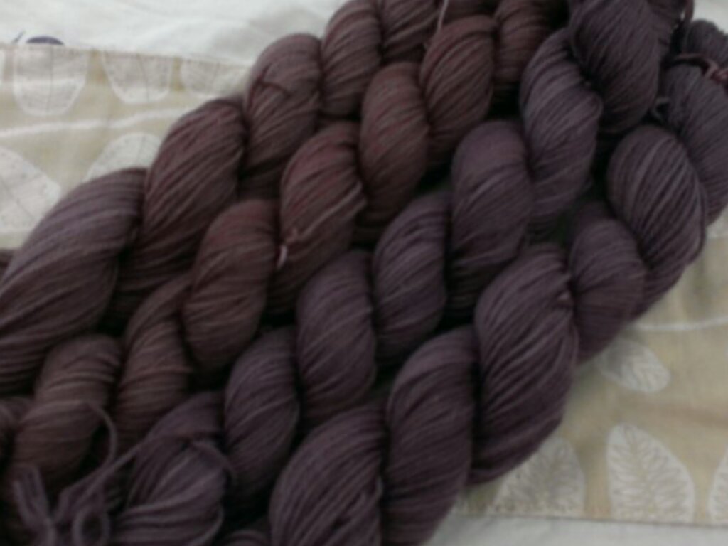 I knit some test samples from my yarns.  They fared better, washed with other woollens, cold with soapnuts rather than detergent (if anything, a slightly acidic wash).  The sample on the right has two shades of plum pine with alum and CoT on BWM alpaca rich, with a band of cotton used to tie the skeins in between because this yarn took so much colour during the dyeing I was curious.  The sample on the left has two shades of plum pine on patonyle (wool and nylon superwash sock yarn and a sample of handspun Wensleydale).  One has gone from purple to grey and the other from purple to blue.  Blue?  Before: